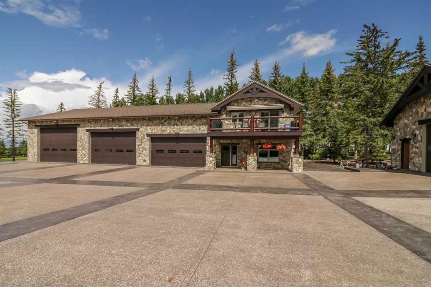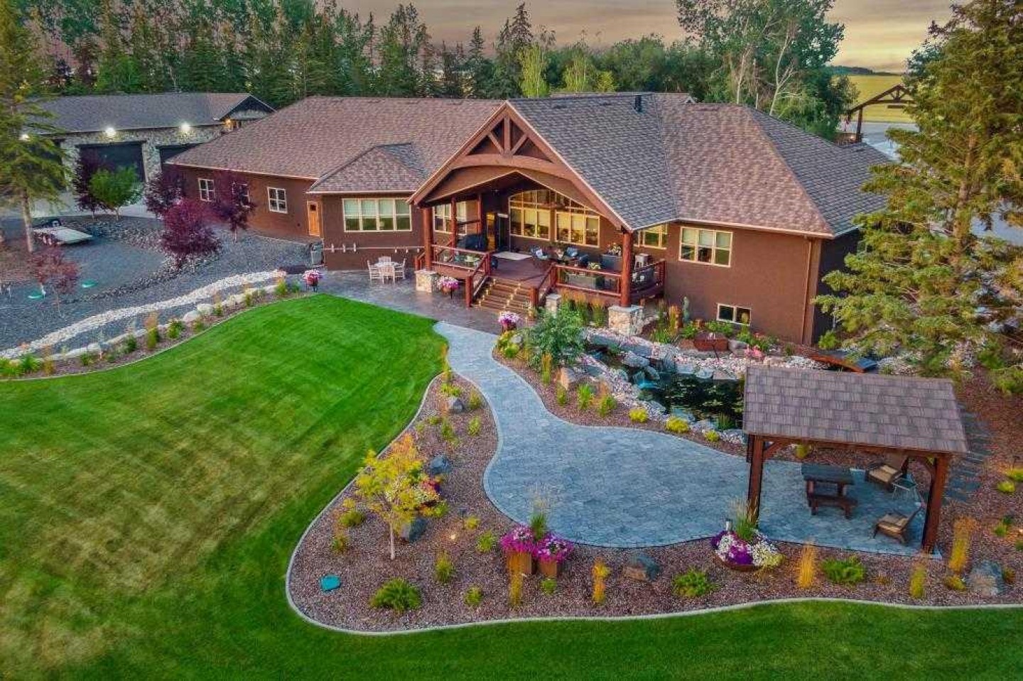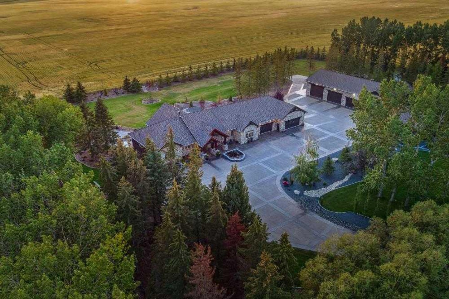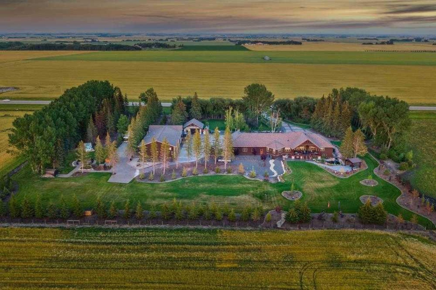 EXECUTIVE ACREAGE WITH STUNNING MOUNTAIN VIEWS AND A PARKLIKE SETTING! First time offered for sale and extremely rare opportunity to purchase this pristine 5.21 +/- Acres Located Just mins South of Olds on pavement. This is the perfect central Alberta location with Less than a 1hr drive to the Calgary airport and just 40 mins to Red Deer. The entire property sends a majestic mountain lodge feel where nature, towering trees, mature landscaping, gardens, family fire pit area, wide open spaces with waterfalls & streams soothe the soul. Executive touches greet you at the impressive main entrance with beautiful timbers, stonework, wrought iron fencing and over 46000 sqft (over 1 acre) of concrete driveway and stamped concrete edging inlays. The sprawling 3690sqft bungalow is loaded with features and class. Built with ICF Block foundation and a top of line list of mechanical features and sound system throughout. Rough edge quartz counter tops highlight a huge island kitchen with two dishwashers, a gas stove imported from overseas , under counter lighting, custom detailed wood artwork and more! The wide open concept and massive west facing windows allow for natural sunlight to stream throughout the entire main floor. Two Large fireplaces on the main floor & main floor laundry. The Primary bedroom is fit for a queen offering the most luxury built-in closet organizers and a massive ensuite with heated floors, two sinks and huge quartz shower. Two more large bedrooms, a 4pc and 2pc bath on the main floor. The basement features a large rec room, bar rough in and future room for even more development. The custom details don't stop in the 62' x 48' attached and heated garage with epoxy floors, 2pc bath, in-floor heart and a hot-water make up heater for quick recovery of heat. The concrete apron just outside the garage doors is also heated. Outbuildings include a fully finished 28' x 28 'detached garage and a massive fully finished 50' x 100' shop with bright LED lighting, in-floor heat, an RV sani-dump station and separate 1542 sqft legal suite. The legal suite includes two full 4pc baths, two bedrooms, large bonus room with custom fireplace mantel, custom kitchen and more! A true 10/10 showing is guranteed! Your best move starts here!
