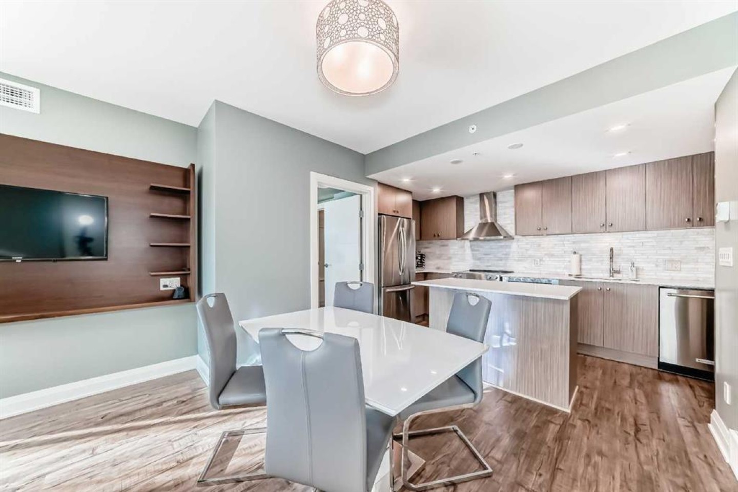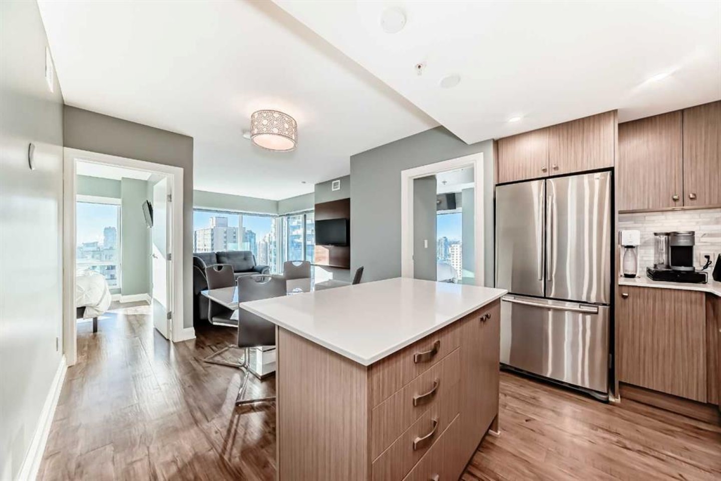 Experience the pinnacle of downtown luxury in this 2 bedroom, 2 bathroom, titled parking, SW-facing corner unit at VOGUE. Sold fully furnished and turnkey, this "Orion" floorplan is situated on one of the exclusive "Bedouin Suites" floors, featuring elite upgrades not found in the rest of the building. Floor-to-ceiling windows frame breathtaking mountain and river views, flooding the space with natural light. The interior boasts premium walnut built-ins, custom bedroom paneling, and a chef-inspired kitchen with an upgraded central island and quartz finishes. Both bedrooms act as private retreats, flanking the living area for maximum privacy. Perfect for investors, professionals and empty nesters. Beyond the unit, enjoy executive amenities including a 36th-floor Sky Gym and 24/7 concierge. Prime West End location steps to the river pathway, C-Train, downtown, and trendy Kensington. Condo fees are $610.35/month, including all utilities except electricity.