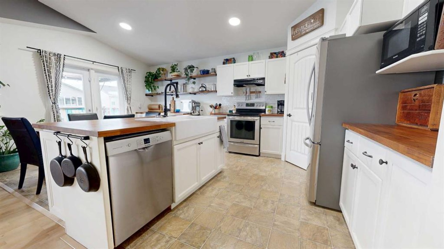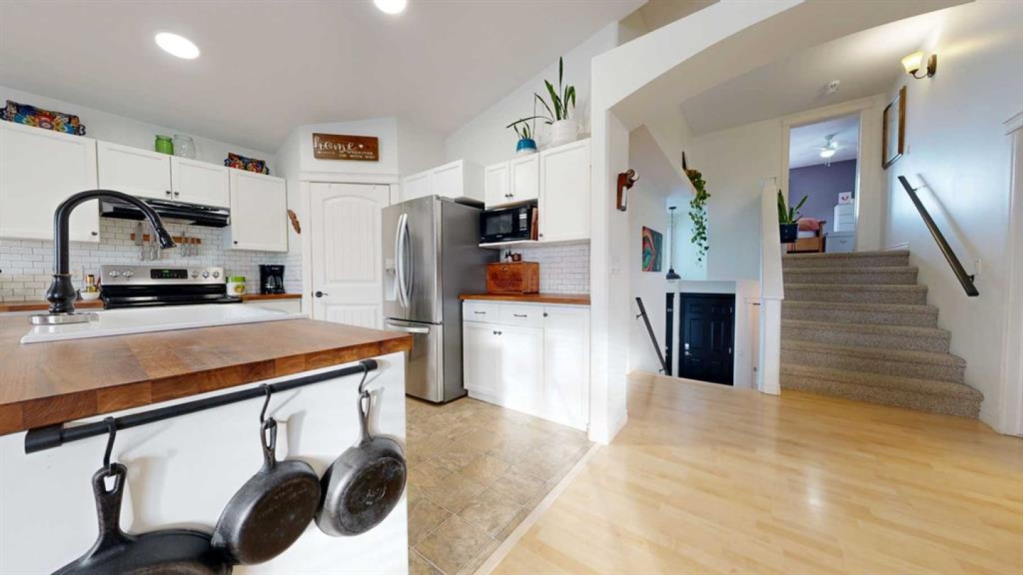 This Royal Oaks modified bi-level is one of those homes that just feels good the moment you walk in. Bright, welcoming, and well laid out, it offers 4 bedrooms and 3 bathrooms with plenty of natural light throughout. The kitchen has been opened up and enlarged for better flow and function, featuring butcher style counters, a stone baking surface for baking days, and a large farmhouse sink . Outside, the south facing yard is low maintenance but full of opportunity gravel landscaping, a great garden with rich soil, and space that works perfectly for a pool in the summer or a rink in the winter. The newer deck with screened, curtained gazebo and hanging lights makes it a spot you’ll actually use. Add in air conditioning, a cozy heated slab basement, a heated garage with workbench, storage shed, parking for three vehicles wide, and a roof replaced just two years ago and you’ve got a solid, well loved home in a great neighbourhood.