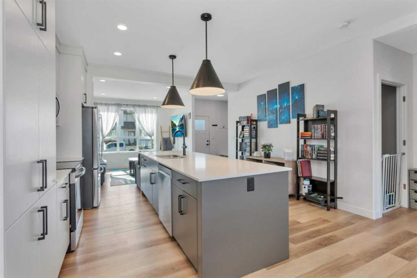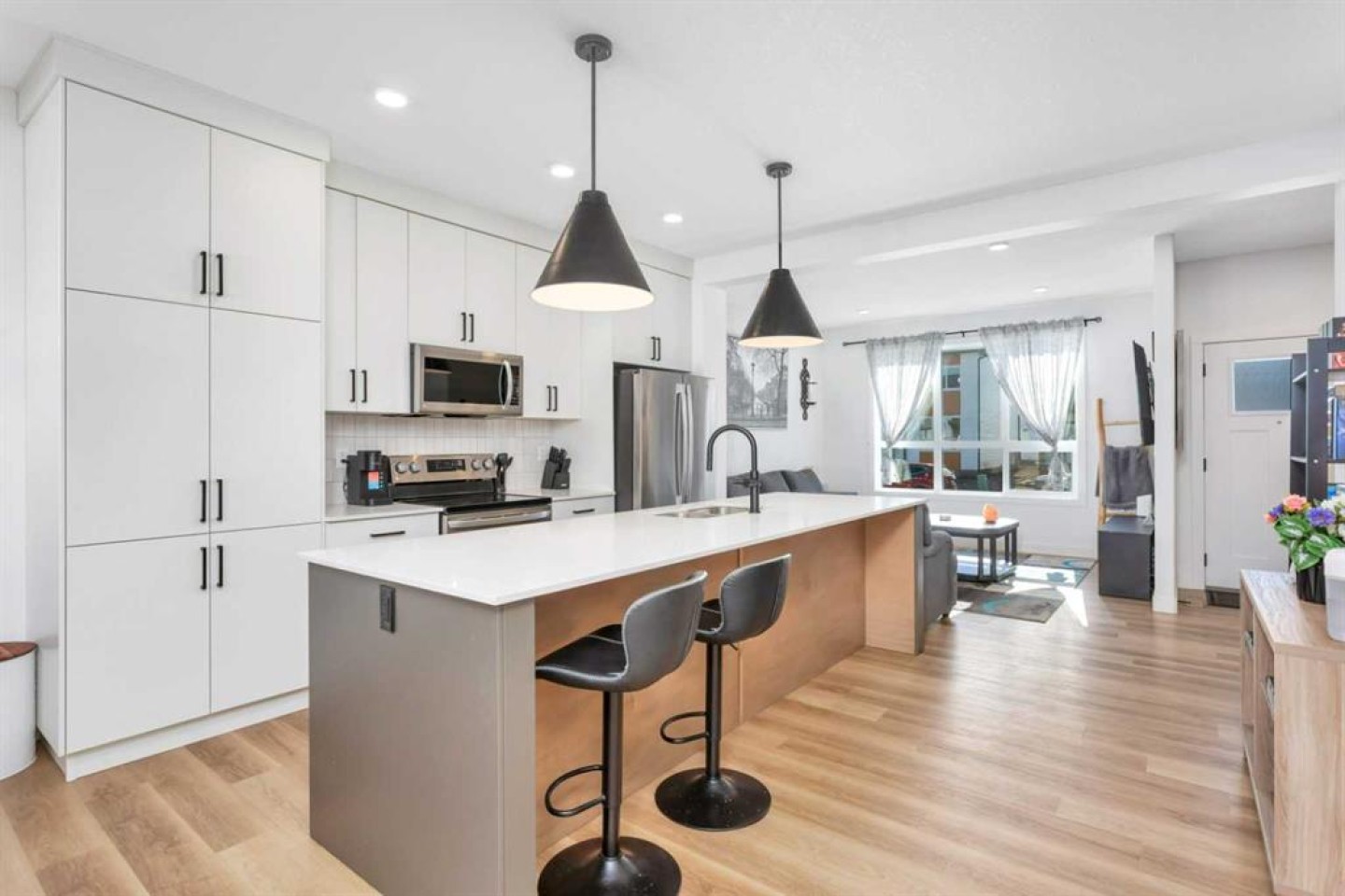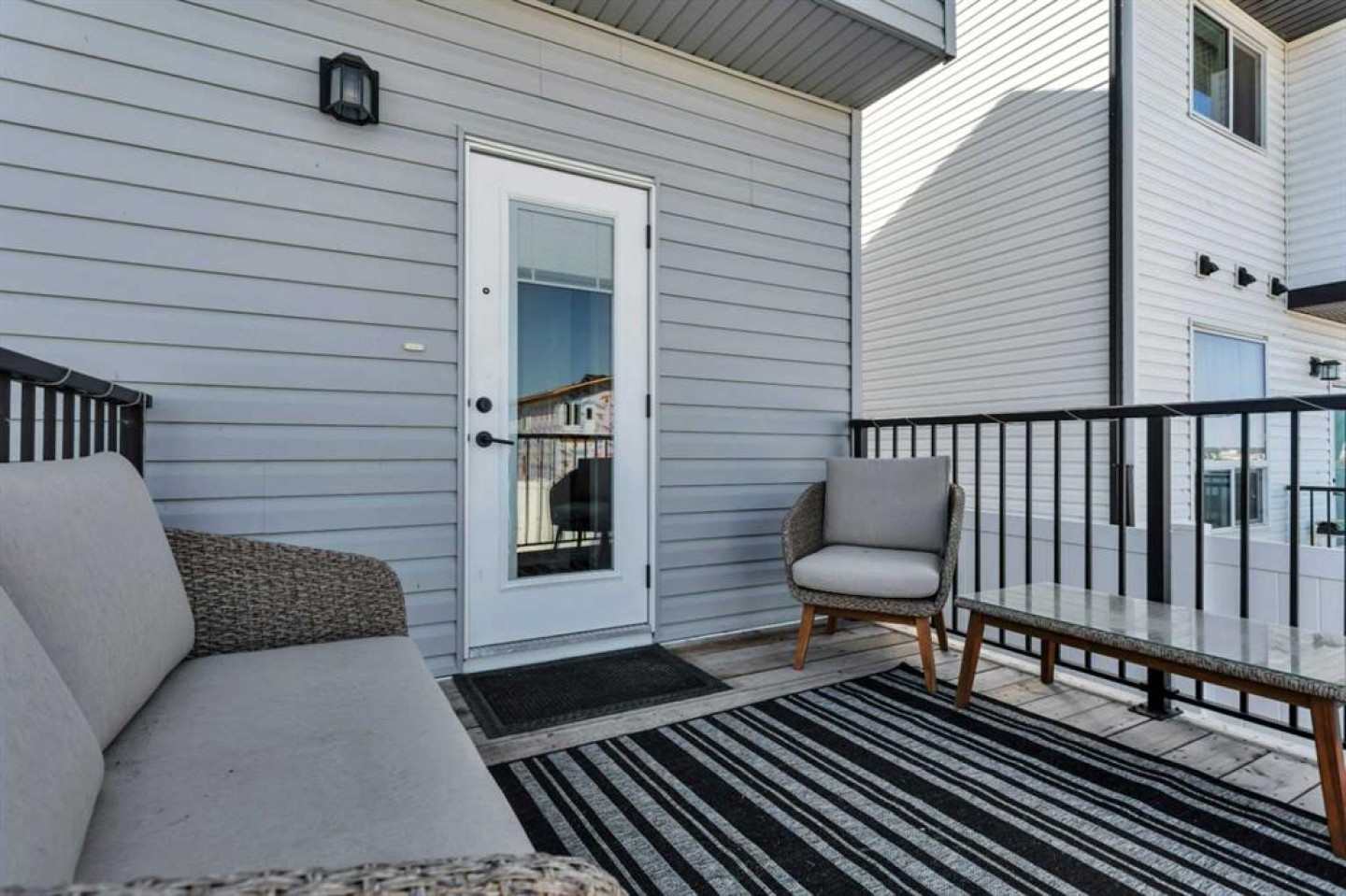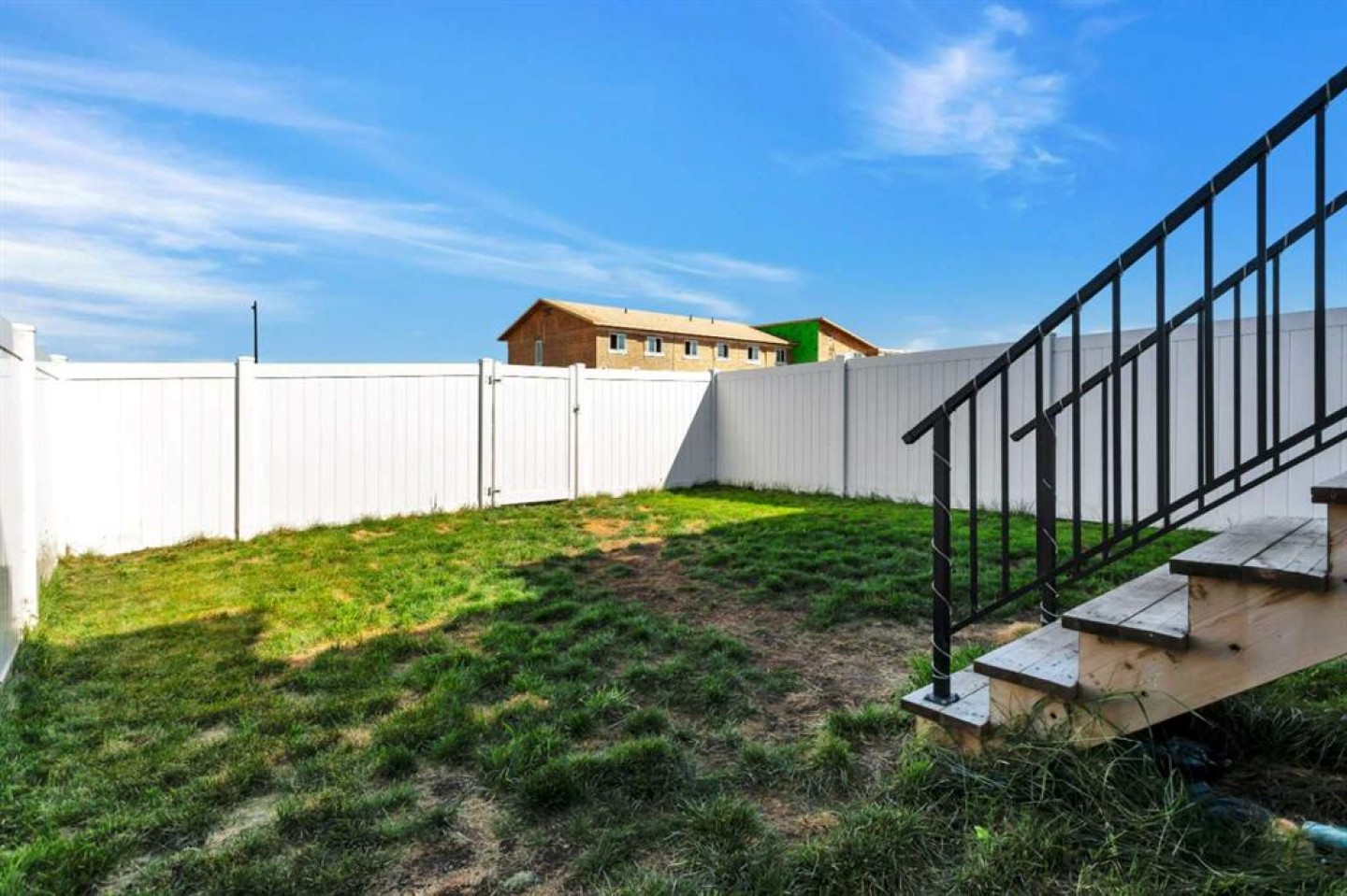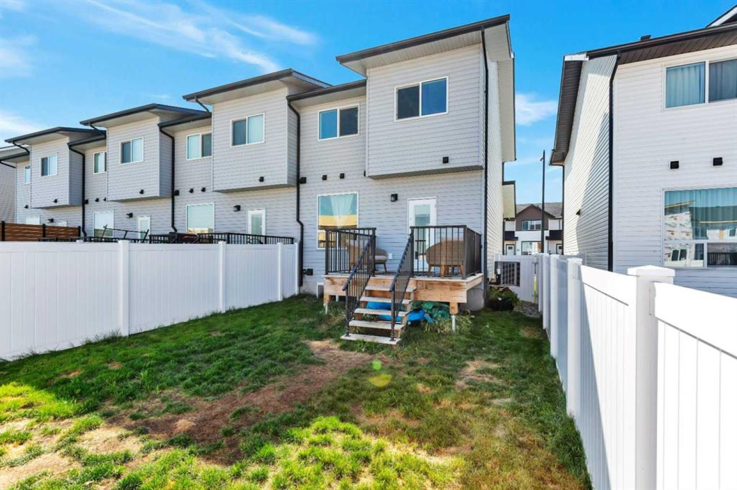 END UNIT with A/C and March 1 possession available. Stylish, spacious, and modern 2-storey townhome in the new community of Iron Gate, offering low-maintenance living and peace of mind with Alberta New Home Warranty still in place. Enjoy your charming 7' x 7' front deck before entering a bright, open-concept main floor filled with natural light from large energy-efficient triple-pane windows. Durable vinyl plank flooring runs throughout the main level, while plush carpet upstairs adds warmth and comfort. The kitchen truly anchors the home with a massive island featuring extended quartz countertops, perfect for stools, homework time, or late-night chats, plus a built-in pantry and four stainless steel appliances. The expansive dining area easily accommodates a full-size table with room to host, and the separate mudroom with a half bath offers practical family functionality with direct access to the east-facing back deck. Outside, enjoy a fully fenced backyard with rear lane access, two parking stalls, and space for a future single detached garage. Upstairs includes a convenient laundry room, two generously sized bedrooms, a full main bathroom, and a primary suite complete with a walk-in closet and 4-piece ensuite. Extra-large hallway closets provide excellent additional storage. The basement is unfinished and ready for your ideas, already plumbed and framed for a future bedroom, bathroom, and rec room, with large windows bringing in great natural light. Central A/C keeps the interior comfortable year-round. Located close to shopping, restaurants, and Highway 20 for quick access in and out of town, this move-in-ready home checks all the boxes for comfort, convenience, and long-term value.