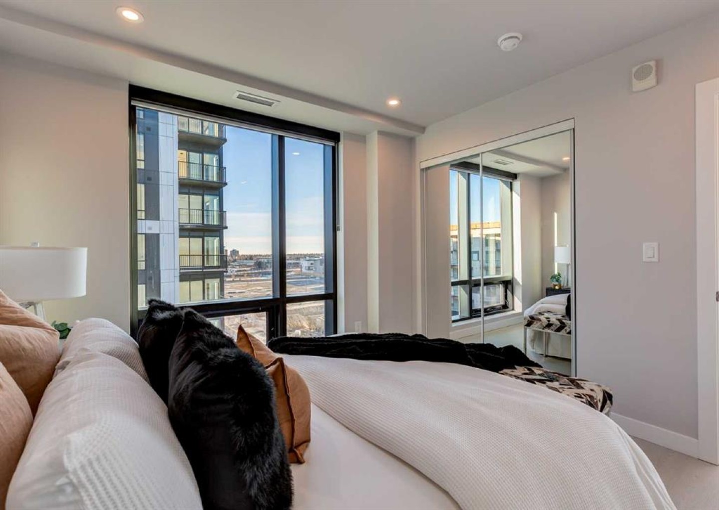 Welcome to this brand-new corner-unit condominium in the Plaza, located in the award-winning West District, where modern design meets an exceptional urban lifestyle. This bright and beautifully designed home features 9-foot ceilings and expansive windows that flood the space with natural light throughout the day. With the main living area and primary bedroom facing south, the home enjoys incredible sunshine, while the east-facing balcony and second bedroom overlook the stunning central patio below. The open-concept floor plan is ideal for both everyday living and entertaining. The contemporary kitchen is finished with quartz countertops, a gas range, and a built-in refrigerator, seamlessly blending style and functionality. The layout offers two spacious bedrooms and two well-appointed bathrooms, along with a large laundry room with excellent storage, a rare and highly desirable feature. Plaza offers exceptional building amenities, including a fully equipped fitness centre and an inviting owners’ lounge complete with arcade games and a pool table. Additional conveniences include a dedicated dog wash and a car wash. The home also includes heated underground parking, modern finishes throughout, and thoughtful design details that set this residence apart. Just steps from your door, enjoy boutique shopping, some of Calgary’s best dining and cafés, and the beautifully designed Central Park. The corner-unit position is truly the standout feature, offering exceptional light, privacy, and views making this a rare opportunity to own in one of Calgary’s most sought-after communities.
