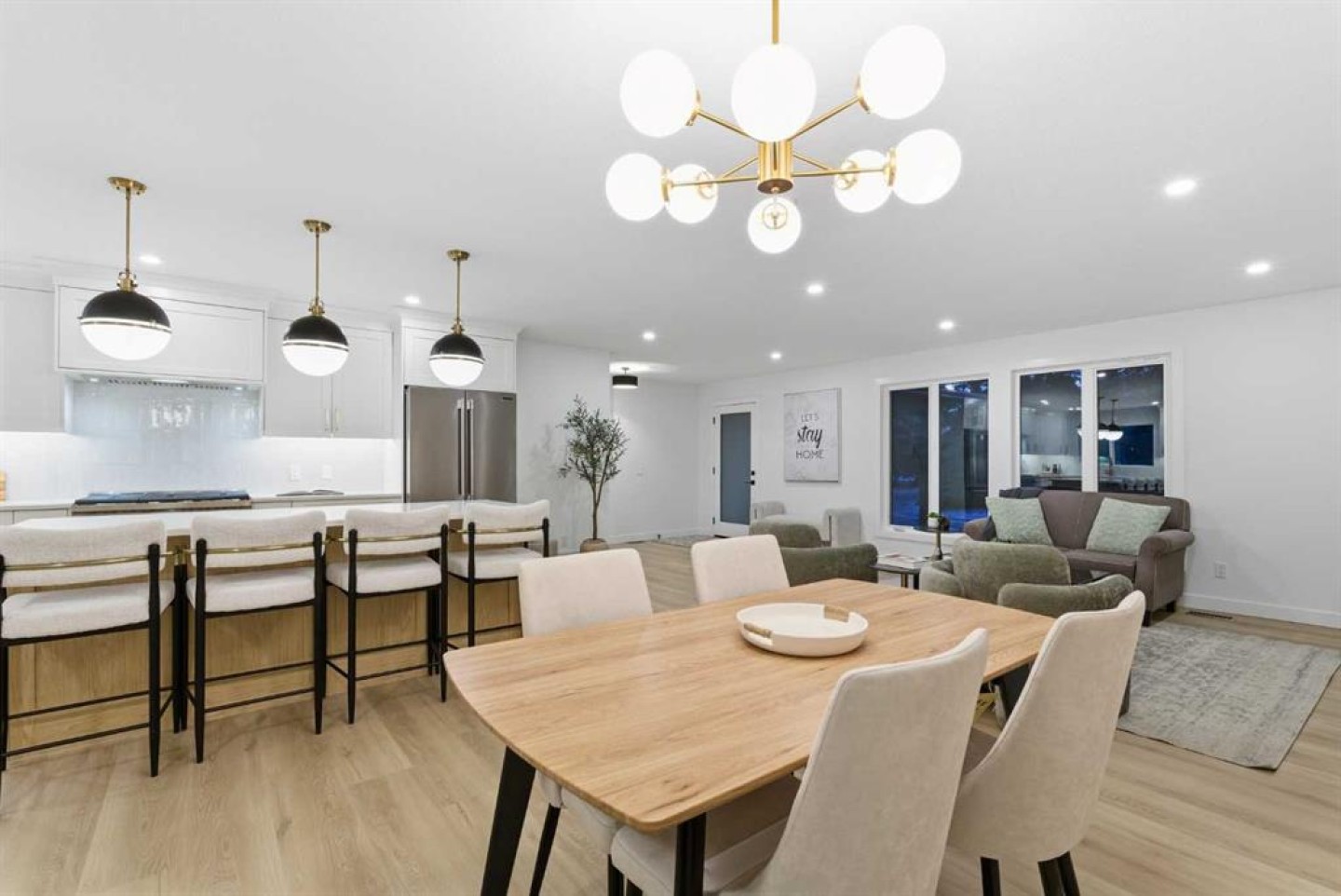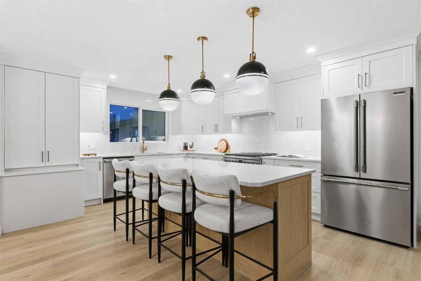 GORGEOUSLY RENOVATED INSIDE & OUT | UNIQUE LAYOUT WITH 2 PRIMARY BEDROOMS | 4 TOTAL BEDROOMS | 3.5 BATHROOMS | WALKING DISTANCE TO THE BOW | Thoughtfully re-imagined from top to bottom, this exceptionally large bungalow delivers modern comfort, flexible living and refined design in a sought-after setting. Nearly 1,500 sq ft on the main level allows everyday life to unfold with ease, while an open-concept layout creates natural flow for entertaining and quiet moments at home. Luxury vinyl plank flooring provides durability and warmth underfoot, paired with a calm neutral colour palette and curated designer lighting that elevates each space. Oversized windows with both south and north exposure fill the home with natural light throughout the day, creating a bright and balanced environment. Evenings are anchored by a striking fireplace that brings warmth and visual focus to the living area, while clear sight-lines across the dining space encourage connection during meals and gatherings. A chef-inspired kitchen blends style and performance with stone countertops, full-height cabinetry for generous storage, a gas range and a large centre island that doubles as a social hub with casual seating. Design-forward details continue into a beautifully finished powder room where bold wallpaper and elevated fixtures add personality without sacrificing cohesion. A rare dual primary suite configuration on the main floor offers outstanding flexibility for multi-generational living, long-term guests or home office needs. One primary retreat features a spacious layout, custom walk-in closet and a spa-inspired ensuite with dual sinks, a deep soaker tub and an oversized rain shower. Comparable comfort is found in the second bedroom, which includes its own walk-in closet and private ensuite. Additional living space extends into the fully finished basement, completed in the same refined style as the main level. A generous recreation area supports movie nights, games and casual entertaining, complemented by a built-in bar for easy hosting. Two additional bedrooms provide versatility for family, guests or workspaces, supported by a beautifully updated 4-piece bathroom. A well-appointed laundry room enhances daily function with upgraded backsplash, ample storage, sink, folding counter and front-load appliances. Outdoor living is equally considered with a large fully fenced backyard offering privacy and room to relax. Summer gatherings are supported by an expansive patio, while a grassy play area accommodates kids and pets. Everyday convenience is elevated by having an oversized double detached garage accessed from a paved back lane on a corner lot, providing secure parking and storage. This prime location places shopping, parks, green spaces and schools close at hand, with quick access to Market Mall, the University of Calgary and the Children’s Hospital. Thoughtful design, functional flexibility and long-term livability come together in a home that supports both active and relaxed lifestyles.