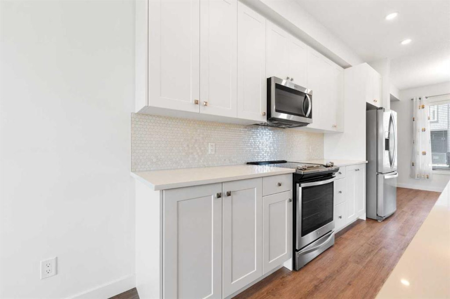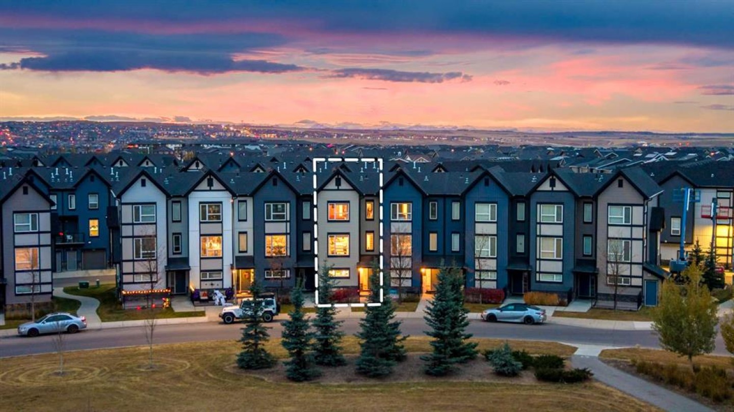 Welcome to this beautifully designed 3 bedroom, 2.5 bathroom townhouse, ideally located in the sought-after community of Evanston in NW Calgary. Perfectly positioned facing a picturesque circular park, this home offers a blend of thoughtful layout, modern finishes, and everyday convenience. The entry level welcomes you with a spacious foyer featuring direct access to the finished double tandem garage, finished with durable epoxy flooring and including dedicated utility and storage areas, providing both function and organization. From here, step outside to enjoy a private ground-level patio, ideal for relaxing, gardening, or entertaining. Additional parking available on the single driveway, ample visitor parking as well as convenient street parking in front of the home. Upstairs, the main living level showcases an open-concept design that seamlessly connects the living room, dining area, and kitchen. The centrally located kitchen is the heart of the home, anchored by a large quartz island and complemented by abundant cabinetry, multiple pantry spaces, and stainless steel appliances. On one side of the kitchen, the bright and inviting living room features large windows that flood the space with natural light and provide access to a balcony, perfect for morning coffee or evening downtime. On the opposite side, the dining area offers plenty of room for hosting family dinners or gatherings with friends. A convenient 2-piece powder room completes this level. The upper floor is thoughtfully arranged to maximize privacy and comfort. The primary suite is situated at one end and features a walk-in closet and a private 3-piece ensuite. On the other end, two additional well-sized bedrooms - one with a walk-in closet—share a full 4-piece bathroom. A convenient upstairs laundry area adds to the practicality of the layout, making daily routines effortless. Additional features include air conditioning for year-round comfort and a location that truly sets this home apart. Enjoy walking-distance access to Evanston’s shopping, schools, and nearby soccer fields, along with quick and easy connections to Stoney Trail for commuting around the city. This move-in-ready townhouse offers a rare combination of park-facing views, modern finishes, and an unbeatable location - an excellent opportunity to call Evanston home.