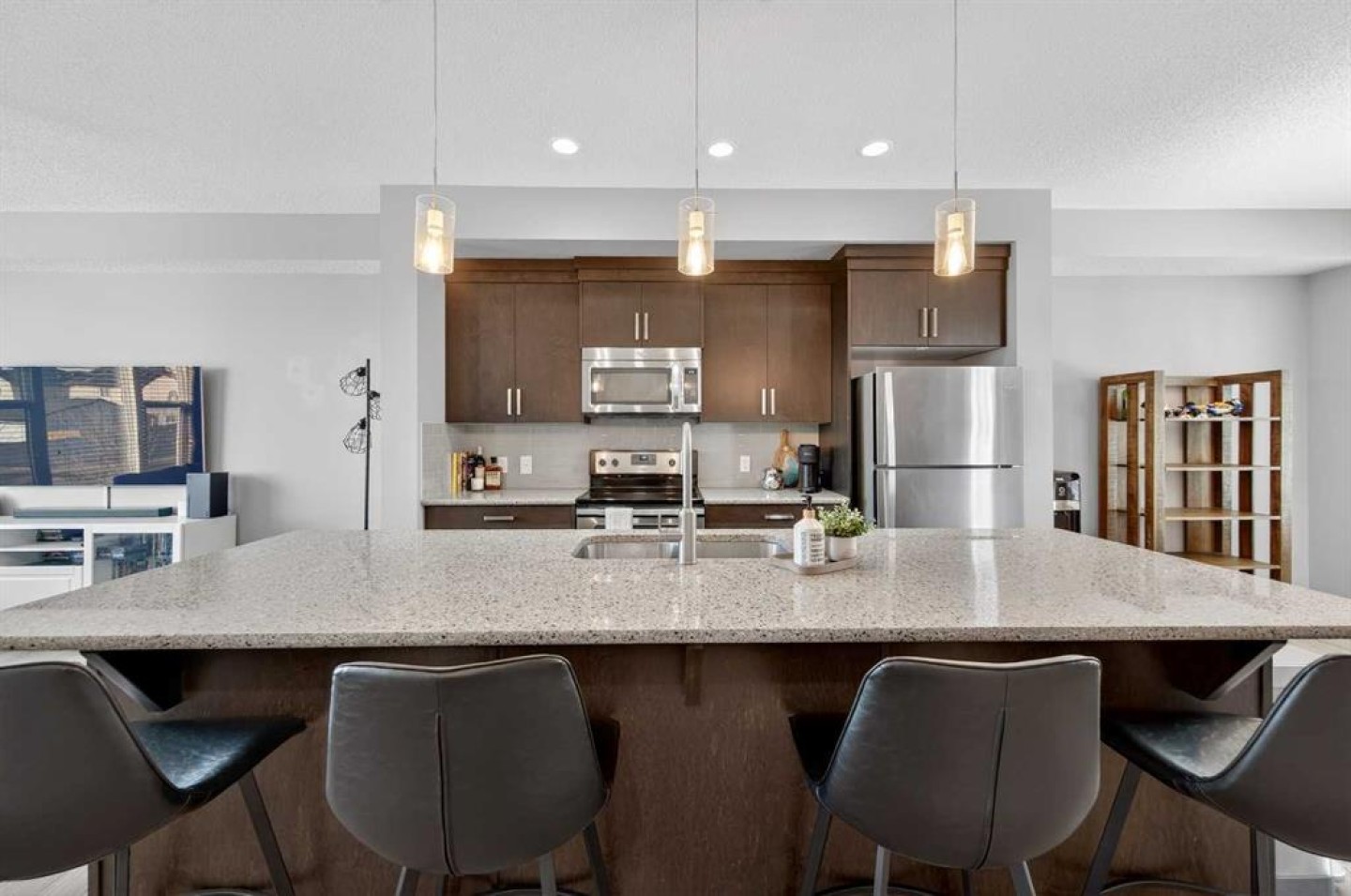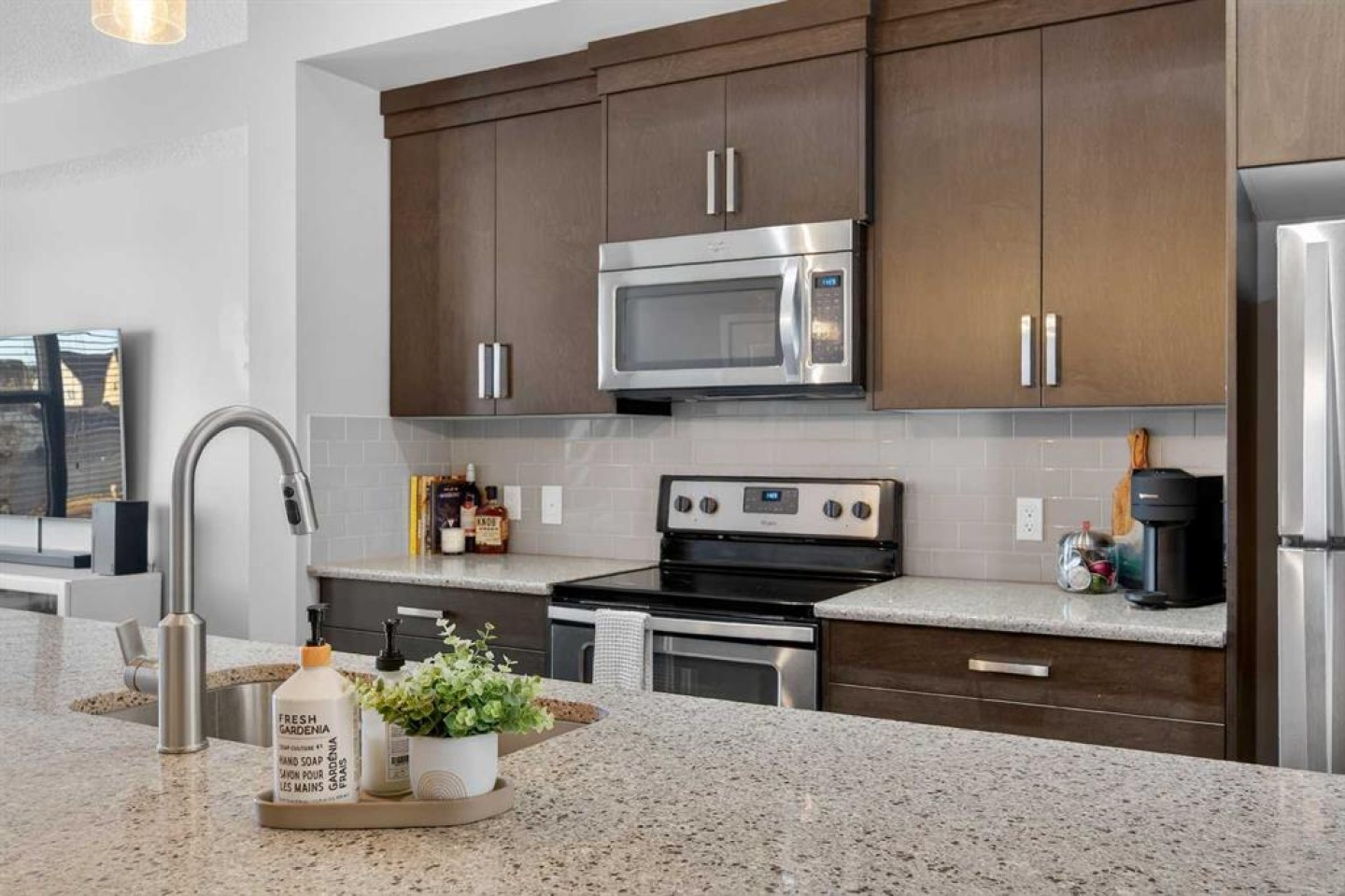 **OPEN HOUSE SATURDAY Feb 7th and SUNDAY Feb 8th 12:00pm - 3:00pm** Welcome to the highly sought after Elements complex in New Brighton! This unit features 1600 of above grade square footage and twice as wide as most townhouses in the area with a true double garage that fits a full-size truck. Spacious open floor concept with modern grey laminate flooring throughout the main floor and large windows flooding the property with natural light. Chef's dream kitchen with rich espresso-stained cabinetry, granite counters, stainless steel appliances, subway tile backsplash, and huge 12 ft center island with undermount sink! Open to the dining room with a large window and access door to the sunny West balcony with power and natural gas hook up. Good sized living room with picture window and office nook, perfect for those working from home. Head upstairs to the two master suites both with walk-in closets and full ensuite bathrooms with granite counters and tile flooring. This well laid out upper level also features an extra open providing flexibility. A 2-piece powder room and lower-level laundry room with new high end LG front-loading washer and dryer to complete this great space. Fully finished and heated garage that fits a full-size truck, which is rare in even new detached houses these days, let alone a townhome! Central A/C with low dBs added and included to stay comfortable on those hot summer nights. With its excellent location close to shopping, parks, schools, New Brighton Athletic Park, and all the amenities and restaurants on 130th Avenue, this home has everything you’ve been looking for in an established and family-friendly community. Commuting is a breeze with quick access to Stoney Trail Ring Road, 52nd Street, and 22x. This property is a must see!