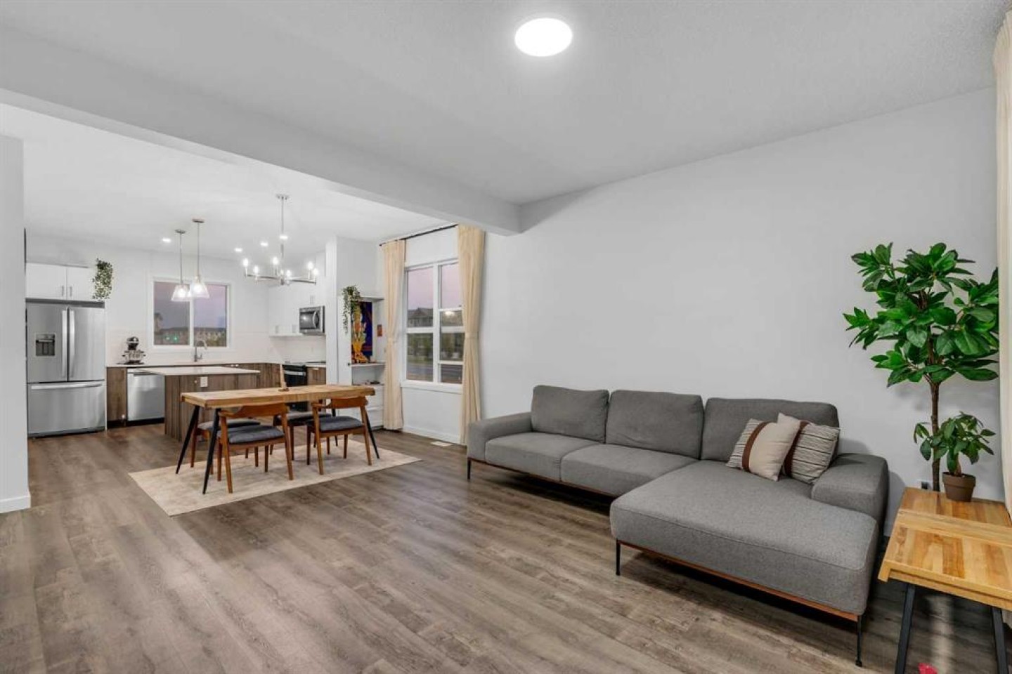 Welcome to this rare 2024-built corner-unit townhome in the family-friendly community of Redstone, offering 1,577.66 sq ft above grade. This home is part of a 4-plex block, a valuable feature in this development where many other buildings are 5-plex layouts—resulting in fewer shared walls and a more private, quieter living experience. Positioned toward the rear of the project, the home enjoys reduced traffic and a peaceful residential setting. The main level includes a spacious foyer, a versatile office/den, a utility room, and direct access to the double attached garage. The second floor features a bright, open layout with a generous living room, dedicated dining area, and a functional kitchen with pantry and great counter space, along with a convenient 2-piece bathroom. The upper level offers three well-sized bedrooms, including a primary suite with a walk-in closet and 3-piece ensuite, as well as two additional bedrooms, a full 4-piece main bathroom, and upper-floor laundry for everyday convenience. Large corner windows provide excellent natural light throughout the home. Located close to parks, pathways, transit, shopping, and with quick access to Stoney Trail, this property combines space, comfort, and exceptional value in a highly desirable Redstone location.