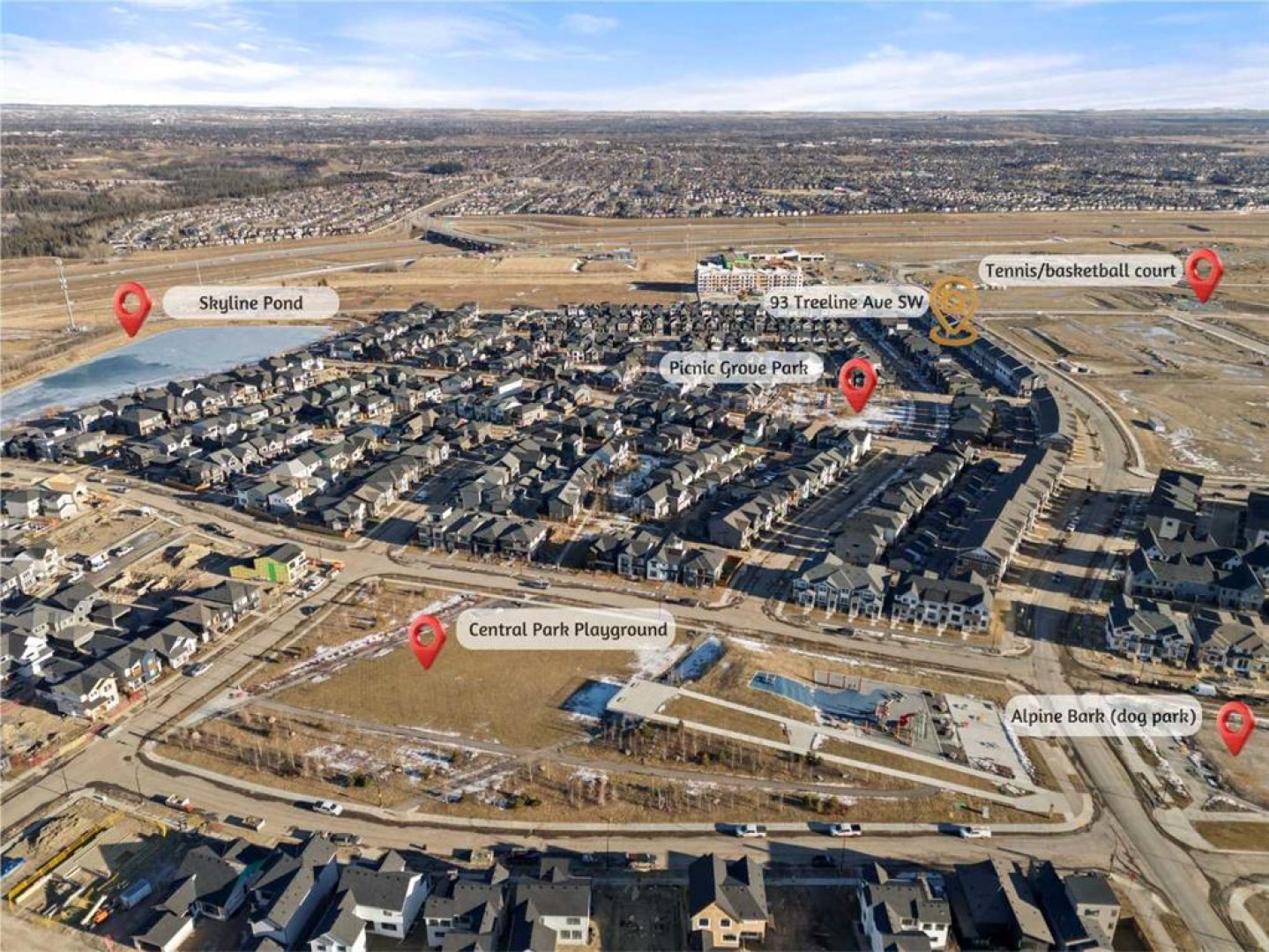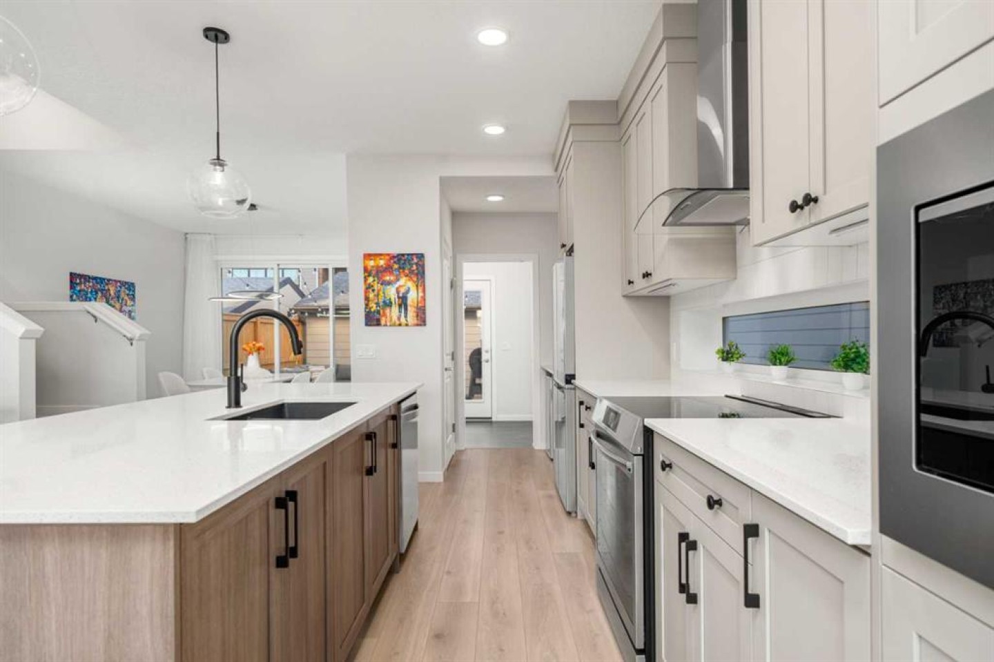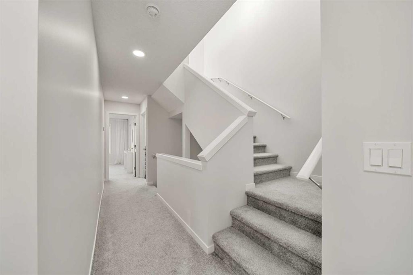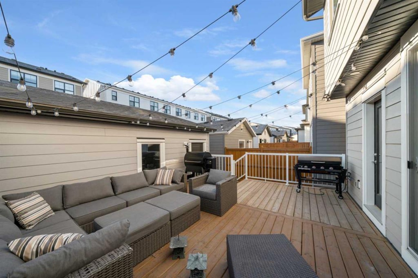Immaculate and truly move-in ready, this Calbridge Homes Vista EV shows like new and offers a rare opportunity to enjoy a fully finished home without the wait or work of building. The modern layout spans three levels with three bedrooms and two and a half bathrooms, capped by a stunning third-floor bonus room that opens directly onto an incredible rooftop patio, a rare and highly desirable feature. The main level features a bright, open layout with 9-foot ceilings and great flow for everyday living. The kitchen offers ceiling-height cabinetry, a dedicated coffee bar, ample pantry space, and a large island, while the dining area opens directly to the rear deck, creating an easy indoor-outdoor connection. Upstairs, the primary bedroom offers generous space and a walk-in closet, paired with a well-appointed ensuite featuring dual vanities, a glass-enclosed shower, and a soaker tub. The conveniently located upstairs laundry area sits just steps from the primary bedroom. Two additional bedrooms and a full bathroom complete the second level. The third-floor bonus room is a true retreat, offering a bright, relaxed space to unwind, work, or host friends, with direct access to the rooftop patio and open-sky views that make it feel like a private escape above it all. Outside, the home is fully finished with low-maintenance landscaping, full fencing, and a spacious rear deck, making it truly ready to enjoy from day one. Located in Alpine Park, one of Calgary’s most thoughtfully designed new communities, residents enjoy walkable pathways, parks and picnic areas, community gardens, Skyline Pond, tennis and basketball courts, Central Park with city views, and a fully fenced, off-leash dog park within walking distance. The upcoming Alpine Park Village Centre will add cafés, shops, and everyday conveniences just minutes from your door. A rare combination of like-new condition, exceptional outdoor space, and a thoughtfully designed community, this home delivers an elevated and connected lifestyle.