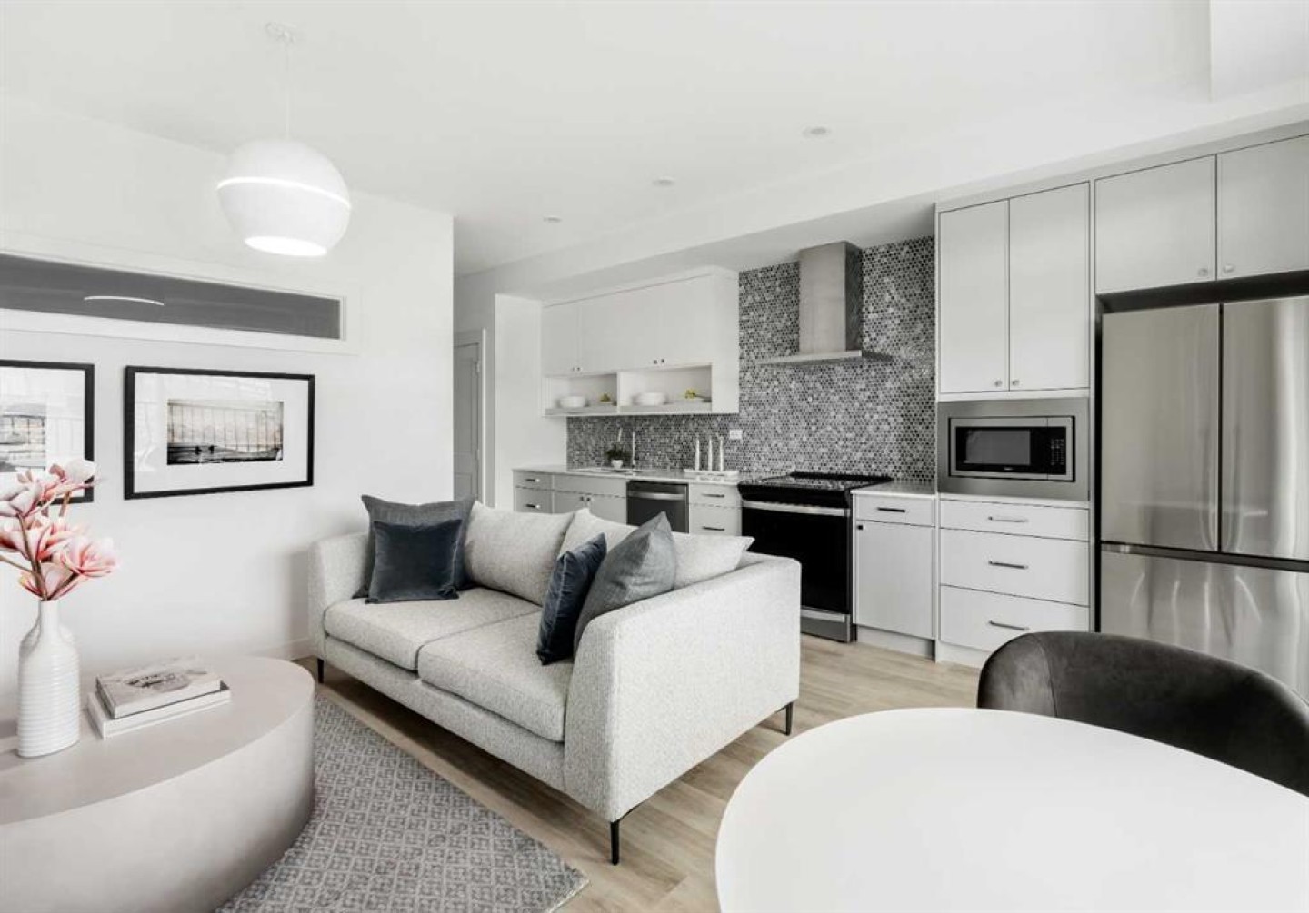 The Carr 2 is a 1-bedroom, 1-bath, offering 503 sq. ft. of thoughtfully designed living space. Features include stainless steel appliances and an upgraded kitchen equipped with quartz countertops, a full-height stylish backsplash, and soft-close cabinetry. The unit boasts 9-foot ceilings, extra-large double-pane windows, and 8-foot-wide patio doors that provide abundant natural light. In-suite laundry adds convenience. This home is ideally situated near walking trails, shopping centers, and Stoney Trail, ensuring easy access throughout the city. It also comes with a 5-year Alberta New Home Warranty for stress-free ownership. Also included in the purchase price is complimentry consultation with Logel Homes designers and a $10,000 credit towards any upgrades you may select.
