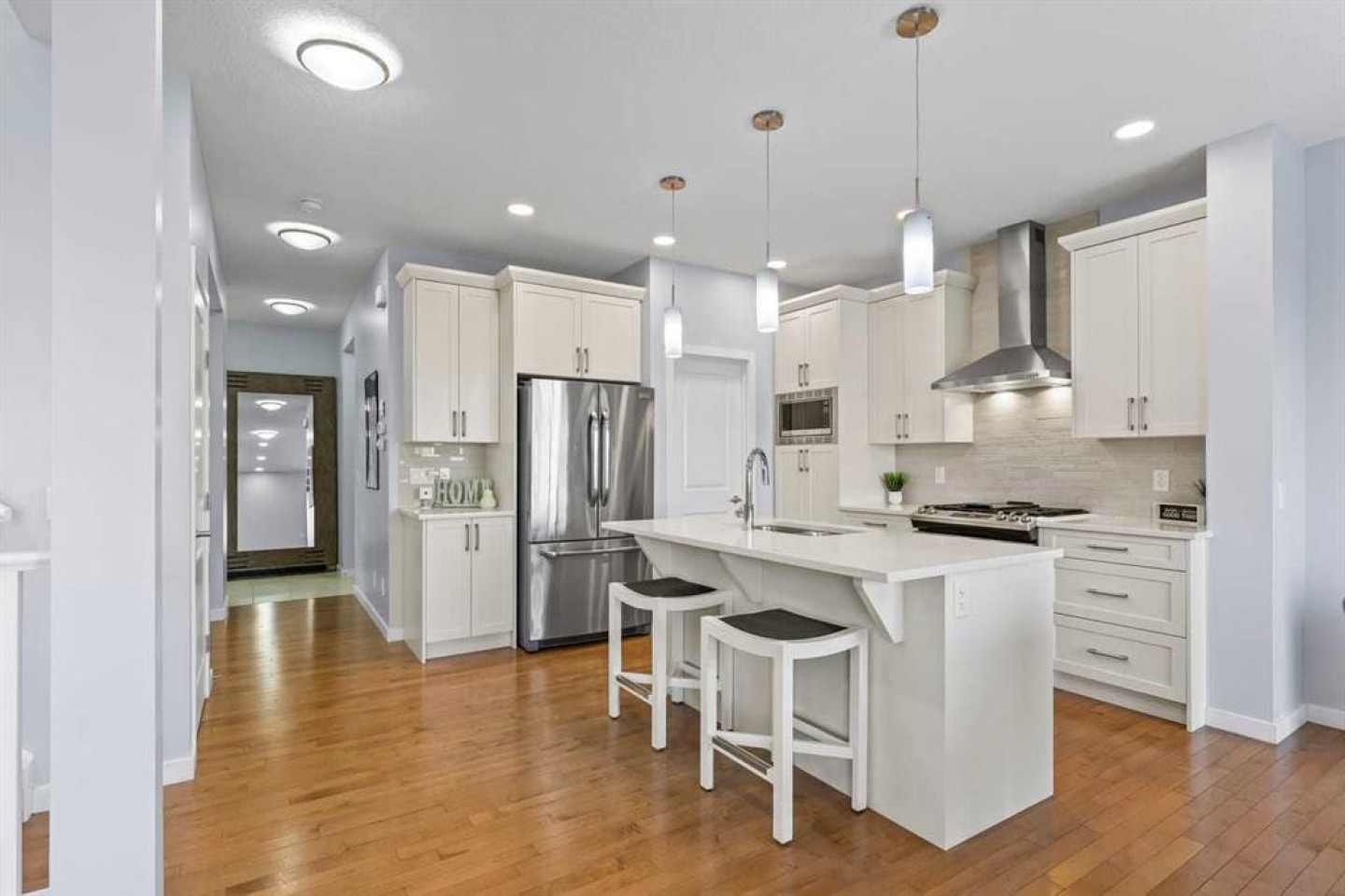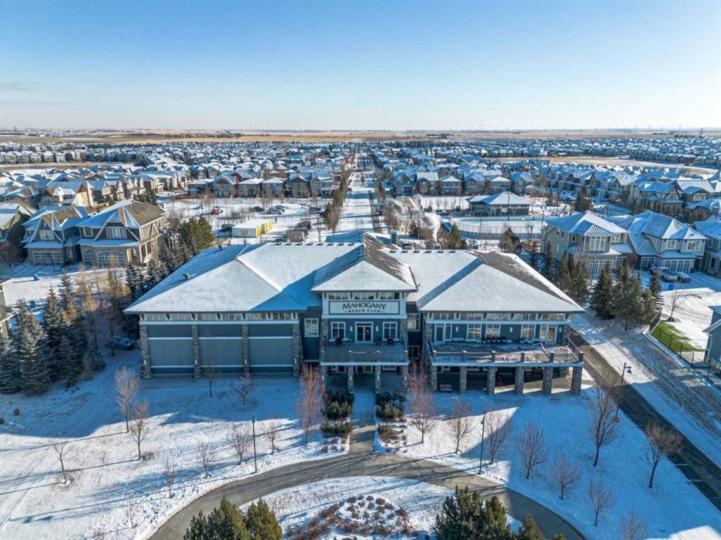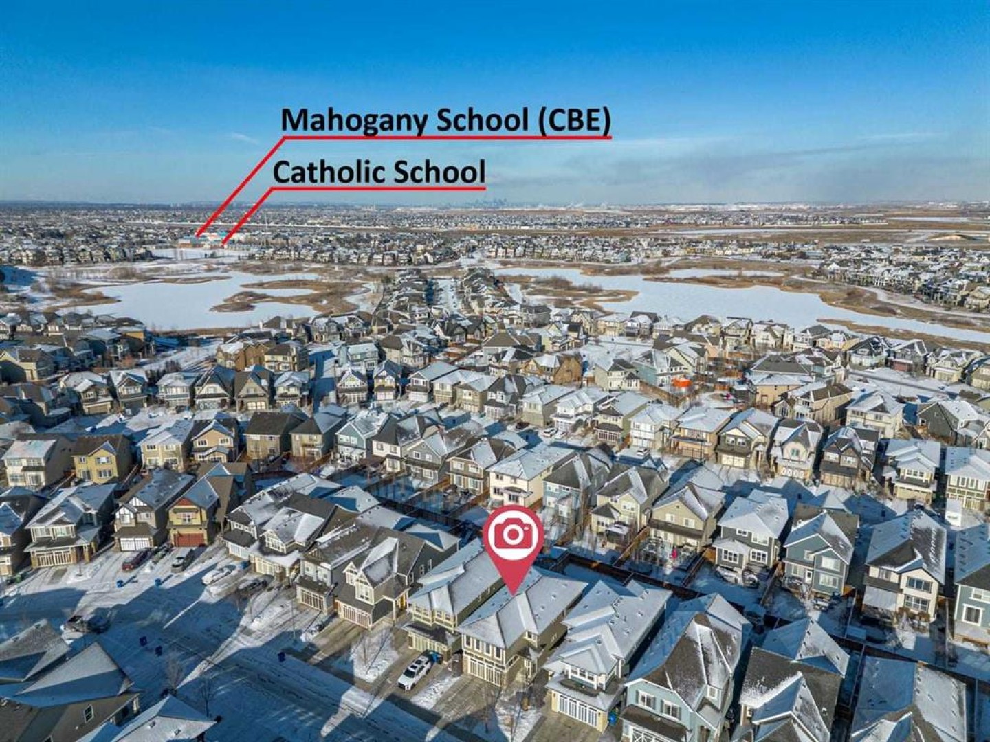 WELCOME TO THIS BRIGHT, BEAUTIFUL, THOUGHTFULLY DESIGNED 4 BEDROOM HOME located in the LAKE COMMUNITY OF MAHOGANY. This 4 bedroom, 2 1/2 bathroom home with DOUBLE ATTACHED GARAGE is situated in the coveted lake community of Mahogany. WELL MAINTAINED, it offers a welcoming OPEN CONCEPT MAIN FLOOR with a CONVENIENT DEN, ideal for work-from-home needs or a quiet study. Large windows flood the living spaces with natural light, while a cozy gas fireplace and stylish pot lights create an inviting ambiance. The main floor blends hardwood and tile with a modern aesthetic, featuring a chef’s kitchen that will delight any home cook. Cook and entertain in style with a bright kitchen that includes a WALK-IN PANTRY, a CENTRAL ISLAND, QUARTZ COUNTERTOPS, and STAINLESS STEEL APPLIANCES, including a GAS RANGE, HOOD FAN, and a BUILT-IN MICROWAVE. WHITE CABINETS paired with a STONE BACKSPLASH provide a timeless, high-end finish. Upstairs, retreat to a comfortable FAMILY BONUS ROOM perfect for movie nights or a play area. The SPACIOUS PRIMARY BEDROOM offers a walk-in closet and a luxurious 5 PIECE ENSUITE with DUAL SINKS, a SOAKER TUB, and an OVERSIZED SHOWER. Three additional well-sized bedrooms share the well-appointed upper level, along with a LARGE LAUNDRY ROOM featuring ample shelving for easy organization. The unfinished basement provides a blank canvas for future development to suit your needs. The fully fenced and landscaped yard is ready for outdoor enjoyment and gatherings. Mahogany is a premier lake community with schools, parks, playgrounds, pathways, and an abundance of amenities within reach. Shopping, restaurants, and professional services are nearby, making this location incredibly convenient. DON'T LET THIS BEAUTIFUL HOME SLIP AWAY! BOOK YOUR SHOWING TODAY.