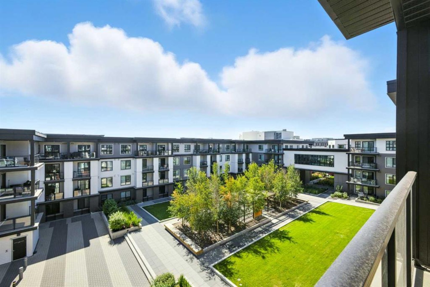 Bright top floor living with a quiet courtyard view and a southeast facing balcony. This 900 square foot 2 bedroom 2 bathroom home in Esquire offers high ceilings, a smart layout, and a clean modern finish package. The kitchen is built for real cooking with ceiling height cabinetry, quartz countertops, tile backsplash, a gas range, and a large island with seating. Herringbone vinyl plank flooring runs through the main living space, which is bright, open, and large enough for a dining setup plus a desk or study nook. Step outside to the southeast facing balcony and enjoy morning sun and evening unwind time overlooking the landscaped courtyard. The primary bedroom features a walk in closet and a 4 piece ensuite with dual sinks and a glass enclosed shower. A second bedroom and full bathroom add flexibility for guests, roommates, or a dedicated office. In suite laundry adds everyday convenience, and a titled underground parking stall keeps your vehicle secure and warm year round. Esquire residents enjoy premium amenities including a fitness centre, pet wash station, and bike storage with maintenance space. Steps from restaurants, cafes, grocery options, parks, pathways, and the off leash area, with quick access to the University of Calgary, Foothills Medical Centre, Alberta Children’s Hospital, and Market Mall. Book your showing today.