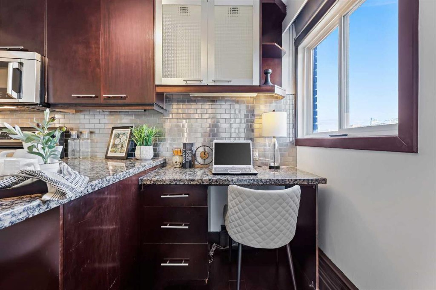 Welcome to this stunning condo with downtown views in the desirable community of Bankview! This one bedroom unit has been carefully planned to maximize space and has a great open concept living and kitchen area with engineered hardwood floors. The kitchen has granite countertops, espresso cabinets, and a breakfast bar! And an added bonus of a study nook which is a great spot for a university student or someone who works from home. The living room is a good size and has a beautiful feature wall with lights to highlight your artwork. What an amazing spot to entertain your friends and family! Next to the living room the primary bedroom has room for a queen-sized bed and has a large closet for all your clothes. A laundry room with a stacked Bosch washer and dryer combo and a 4 piece bathroom finish off the main floor. Moving onto the patio notice how private and quiet it is! And don’t forget the amazing downtown views. What a serene place to unwind at the end of the day with a glass of wine gazing at the twinkling lights of the city. And did we mention that this fantastic condo is in a CEMENT building so it is extremely quiet and private. Pets are allowed with board approval so you can bring your beloved fur baby to live here as well. And as an added bonus heat, water and ELECTRICITY are all included in the condo fees. Call your favorite realtor today for a showing. This one won’t last long!