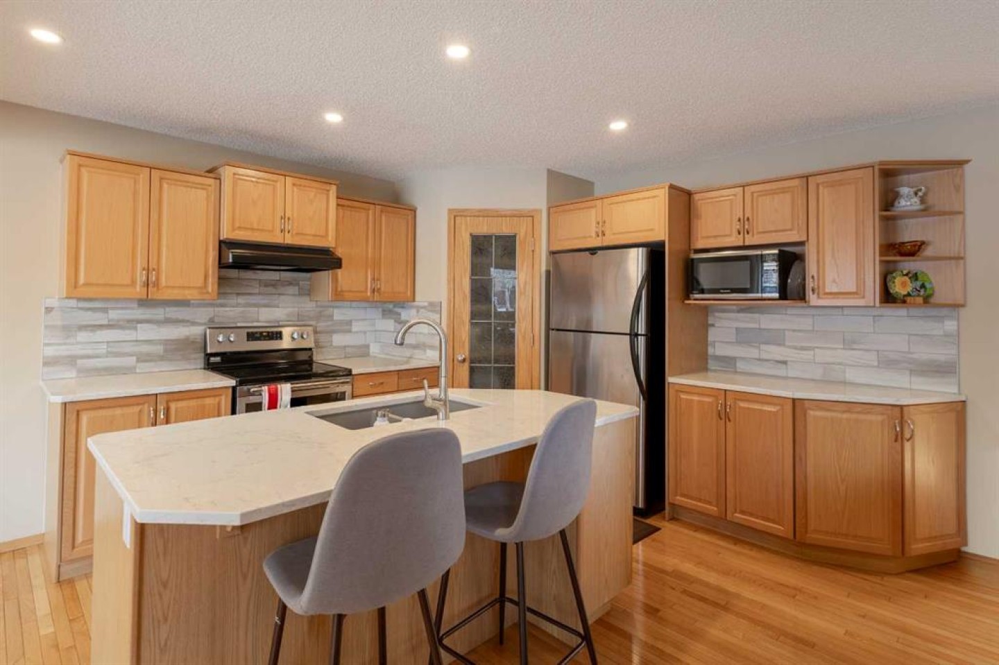 Welcome to this beautifully maintained family home offering a thoughtful layout, functional upgrades, and a backyard retreat designed for everyday enjoyment and entertaining. From the moment you step inside, you are greeted by an impressive open-to-below front entrance that creates a bright and welcoming first impression with soaring ceilings and an abundance of natural light. The main floor features a practical and flowing design, anchored by a spacious living room complete with a tile-surround fireplace and warm wooden mantle—perfect for cozy evenings or gathering with family and friends. The living room opens seamlessly into the kitchen and eating nook, creating an ideal open-concept space for modern living. The kitchen is both stylish and functional, featuring granite countertops, a central island with an eating bar, and a corner walk-through pantry that provides excellent storage and convenience. Select stainless steel appliances complement the space, while the layout allows for easy connection to the dining and living areas. The eating nook offers a large window overlooking the backyard and direct access to the deck, making it a perfect spot for morning coffee or family meals with a view of the outdoors. A main-level laundry room adds everyday convenience and keeps household tasks close at hand. The attached garage is equipped with built-in storage, offering an organized and practical solution for tools, seasonal items, and outdoor gear. Upstairs, the home continues to impress with a spacious bonus room that serves as a versatile space for movie nights, a playroom, or a home office. Two generously sized bedrooms share a well-appointed 4-piece bathroom, while the primary bedroom offers a true retreat. The primary suite features a walk-in closet with custom built-ins and a private 4-piece ensuite complete with a soaking tub and standalone shower—providing both comfort and functionality. The fully finished basement expands your living space with a large recreation and family room, ideal for entertaining, fitness equipment, or a games area. A full 4-piece bathroom completes this level, offering flexibility for guests or growing families. Step outside and enjoy a backyard designed for relaxation and outdoor living. The yard is fully fenced with mature trees, creating privacy and a tranquil setting. A great-sized deck provides space for barbecues and outdoor dining, while the paved cement patio offers an additional seating area for summer evenings and gatherings. An irrigation system ensures the yard stays lush and green with minimal effort. With its open layout, generous living spaces, and beautifully landscaped backyard, this home offers comfort, practicality, and timeless appeal—perfect for families looking to settle into a space that truly feels like home.