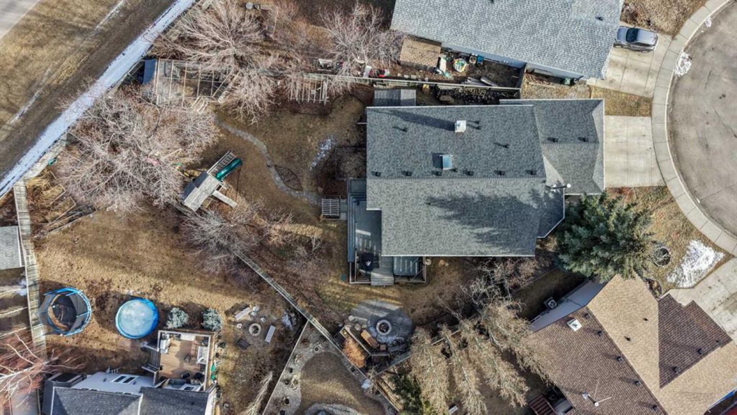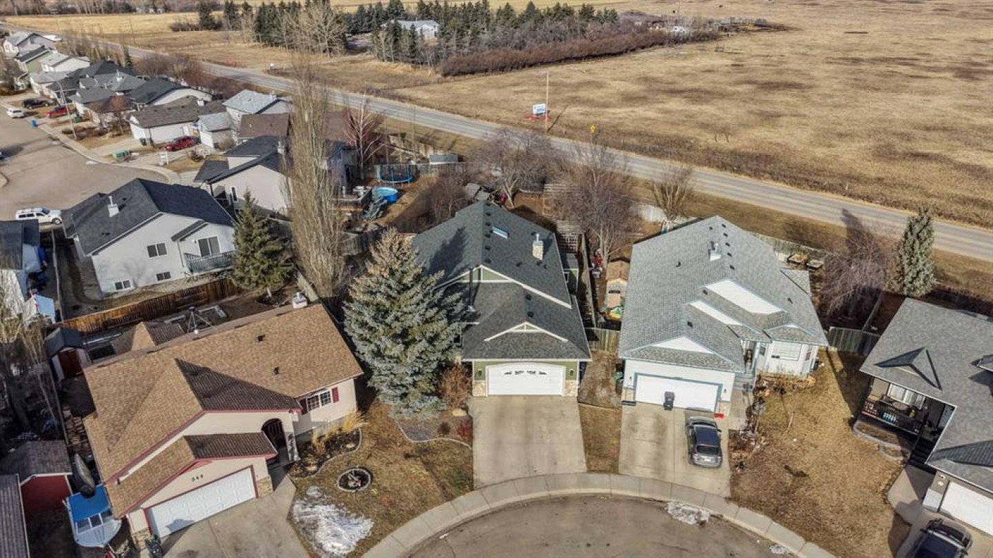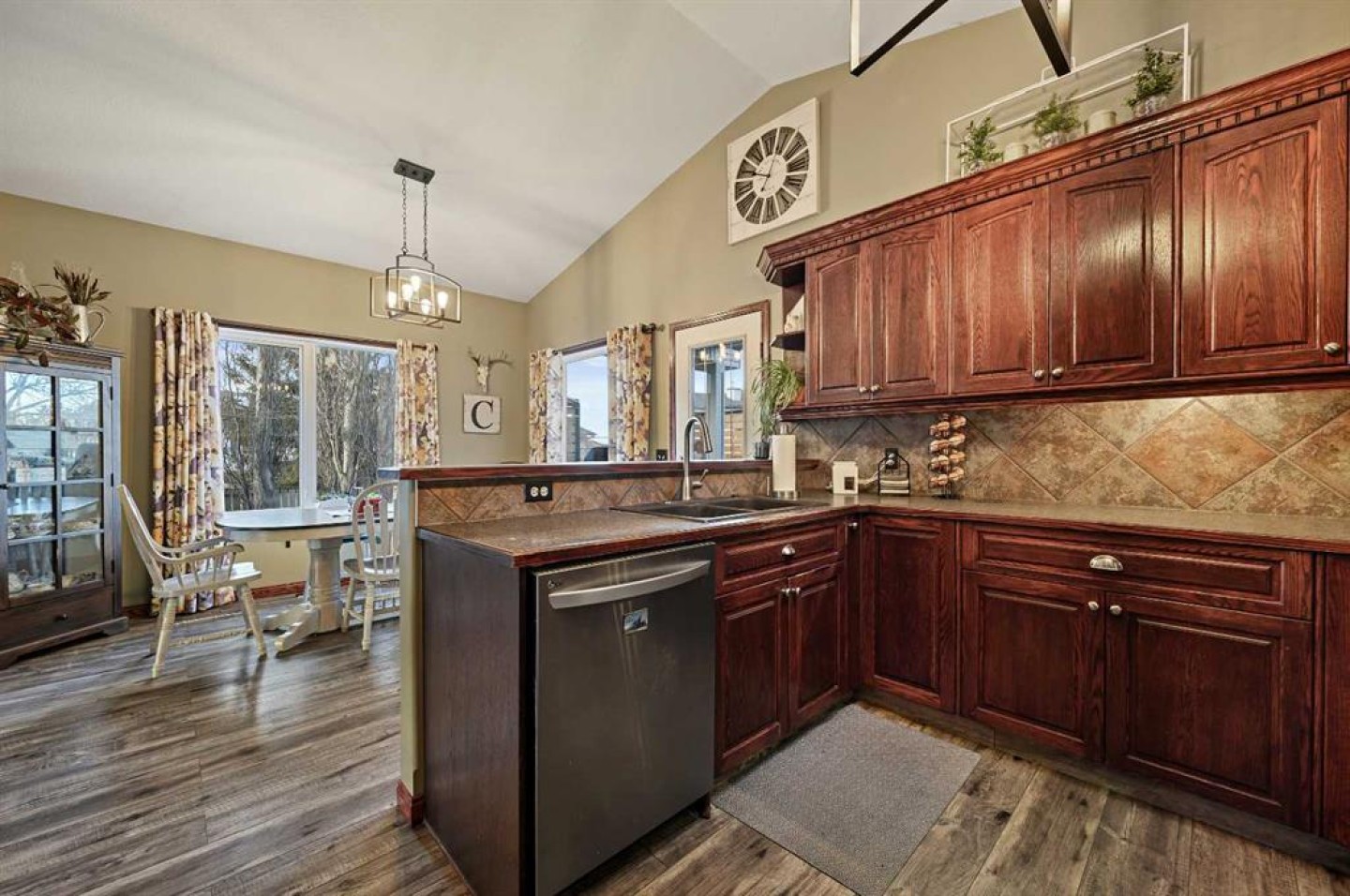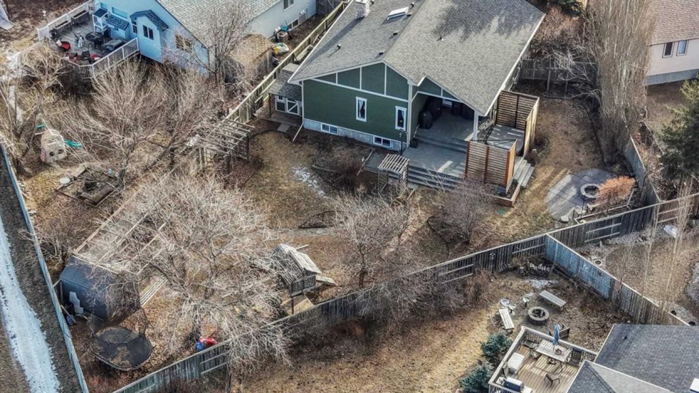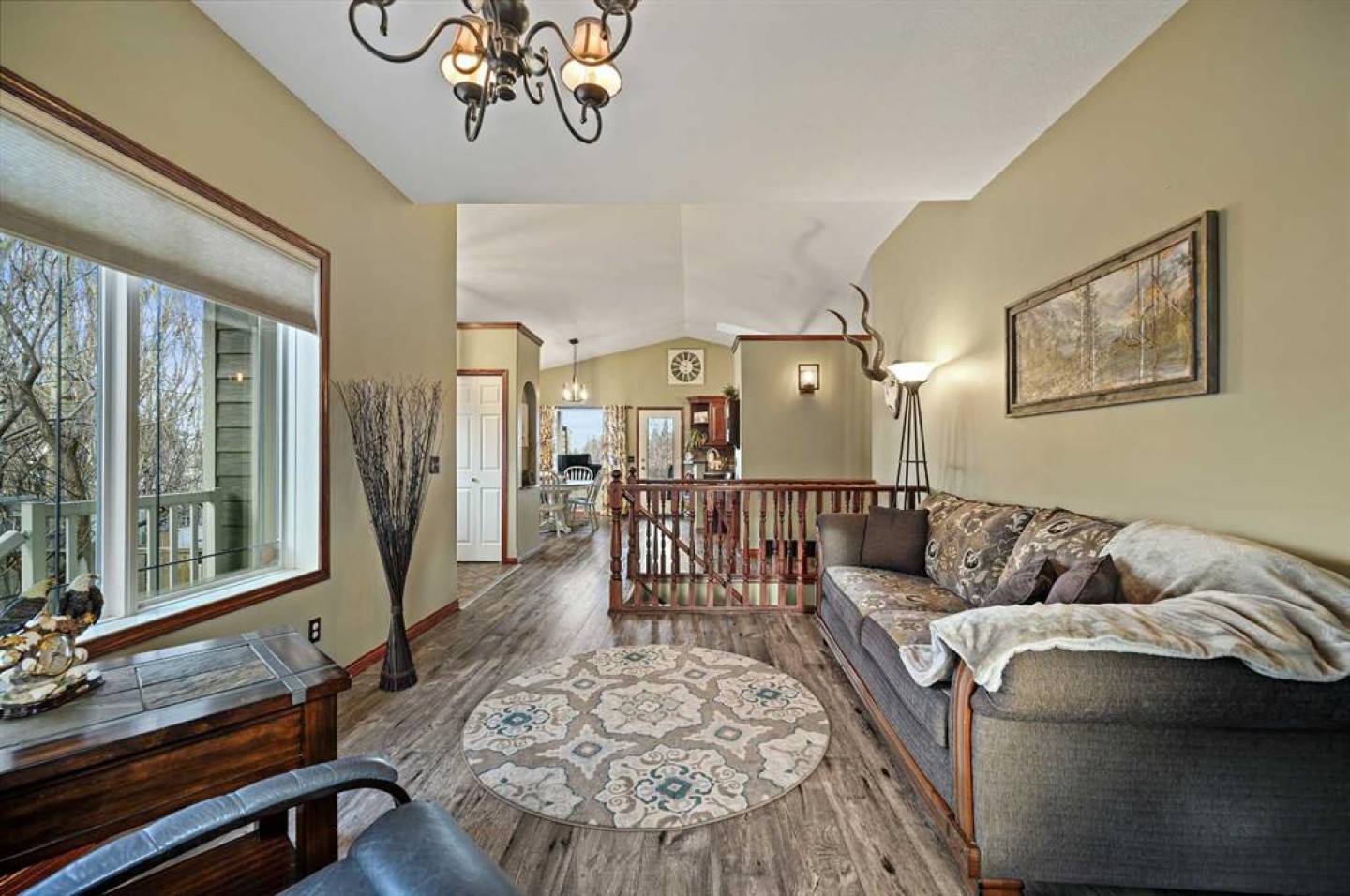 Welcome to this fully developed bungalow, perfectly situated on one of the largest private lots in a desirable, family-oriented neighbourhood. This beautifully maintained detached home offers comfort, functionality, and an exceptional outdoor retreat. The inviting layout features high vaulted ceilings, natural woodwork, abundant storage, and a fully finished basement designed for everyday living and entertaining. The kitchen offers a pantry, ample cabinetry, and seamless flow into the dining area and main living room, making it ideal for family gatherings and hosting guests. This home includes five bedrooms and three full bathrooms across two levels, along with two fireplaces. A cozy wood-burning fireplace warms the main floor, while the lower level showcases a gas fireplace with stone and wood detailing, perfect for movie nights or relaxing evenings. Designed for modern comfort, the home features central air conditioning, a jetted tub, and a forced-air natural gas furnace (2021). Recent upgrades provide peace of mind, including a new asphalt shingle roof (2025), new Hardie Board siding (2025), hot water tank (2020), and an insulated double attached garage complete with mezzanine, water, and 220-volt power. The exterior truly shines with a large private backyard and expansive deck with custom-built privacy screening. Additional outdoor features include underground sprinklers, garden space, a fire pit, dog run, and hot tub (as-is), creating the perfect setting for relaxation or entertaining. Located in a family-friendly community with nearby schools, playgrounds, sidewalks, and street lighting, this home offers both lifestyle and convenience. A rare opportunity to enjoy indoor comfort and outdoor living in one exceptional package