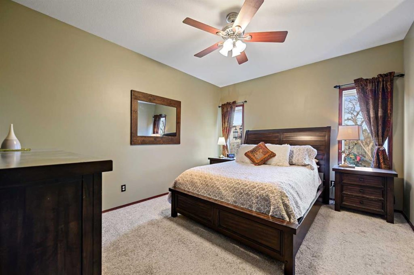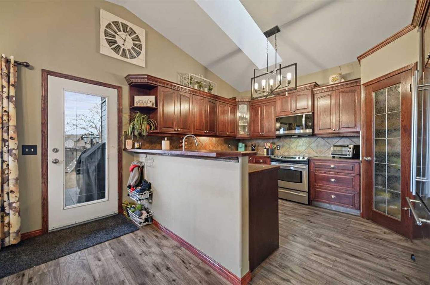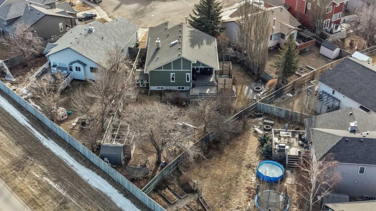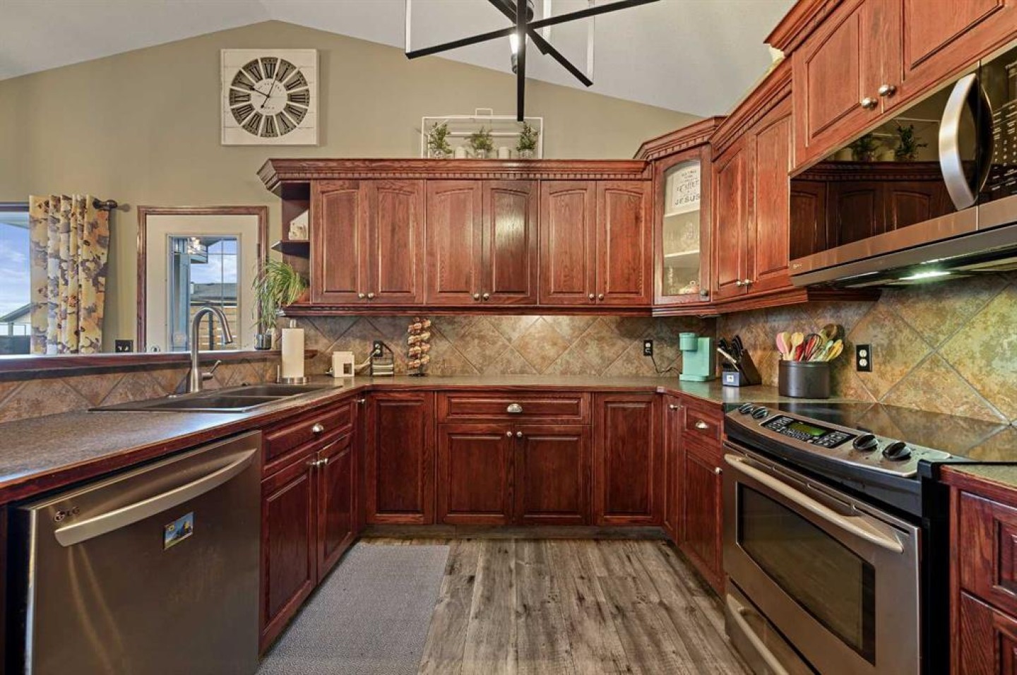 Welcome to this fully developed bungalow, perfectly situated on one of the largest private lots in a desirable, family-oriented neighbourhood. This beautifully maintained detached home offers comfort, functionality, and an exceptional outdoor retreat. The inviting layout features high vaulted ceilings, natural woodwork, abundant storage, and a fully finished basement designed for everyday living and entertaining. The kitchen offers a pantry, ample cabinetry, and seamless flow into the dining area and main living room, making it ideal for family gatherings and hosting guests. This home includes five bedrooms and three full bathrooms across two levels, along with two fireplaces. A cozy wood-burning fireplace warms the main floor, while the lower level showcases a gas fireplace with stone and wood detailing, perfect for movie nights or relaxing evenings. Designed for modern comfort, the home features central air conditioning, a jetted tub, and a forced-air natural gas furnace (2021). Recent upgrades provide peace of mind, including a new asphalt shingle roof (2025), new Hardie Board siding (2025), hot water tank (2020), and an insulated double attached garage complete with mezzanine, water, and 220-volt power. The exterior truly shines with a large private backyard and expansive deck with custom-built privacy screening. Additional outdoor features include underground sprinklers, garden space, a fire pit, dog run, and hot tub (as-is), creating the perfect setting for relaxation or entertaining. Located in a family-friendly community with nearby schools, playgrounds, sidewalks, and street lighting, this home offers both lifestyle and convenience. A rare opportunity to enjoy indoor comfort and outdoor living in one exceptional package