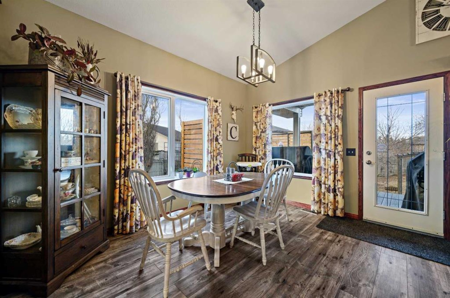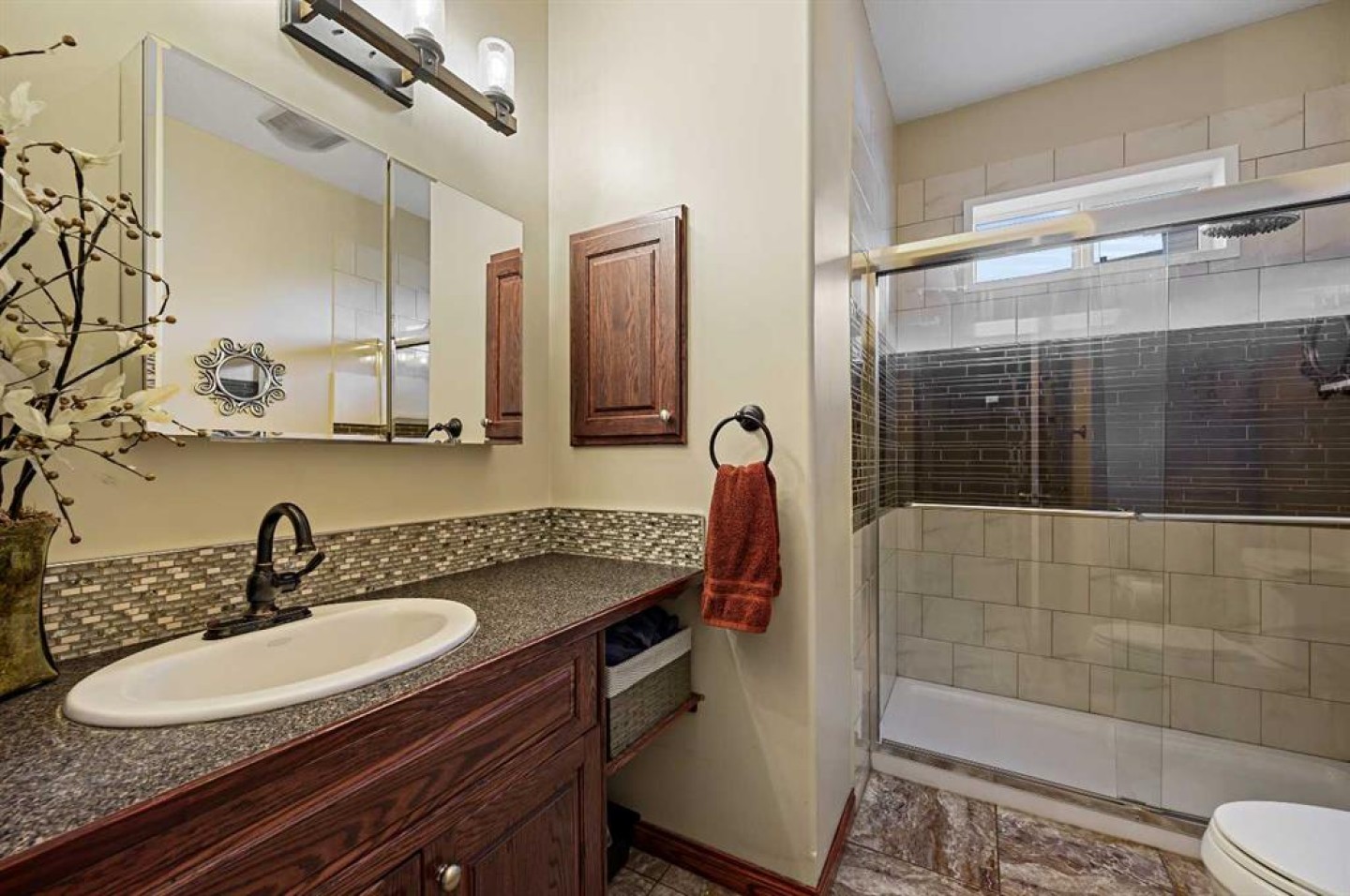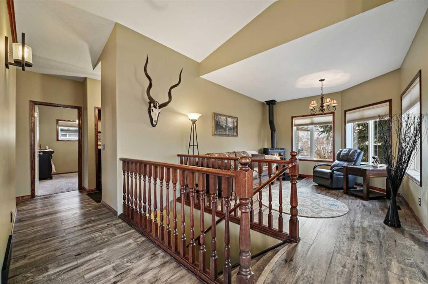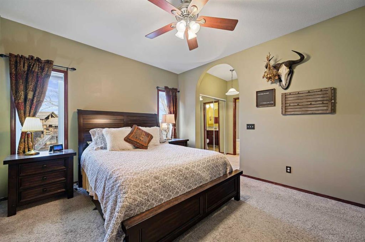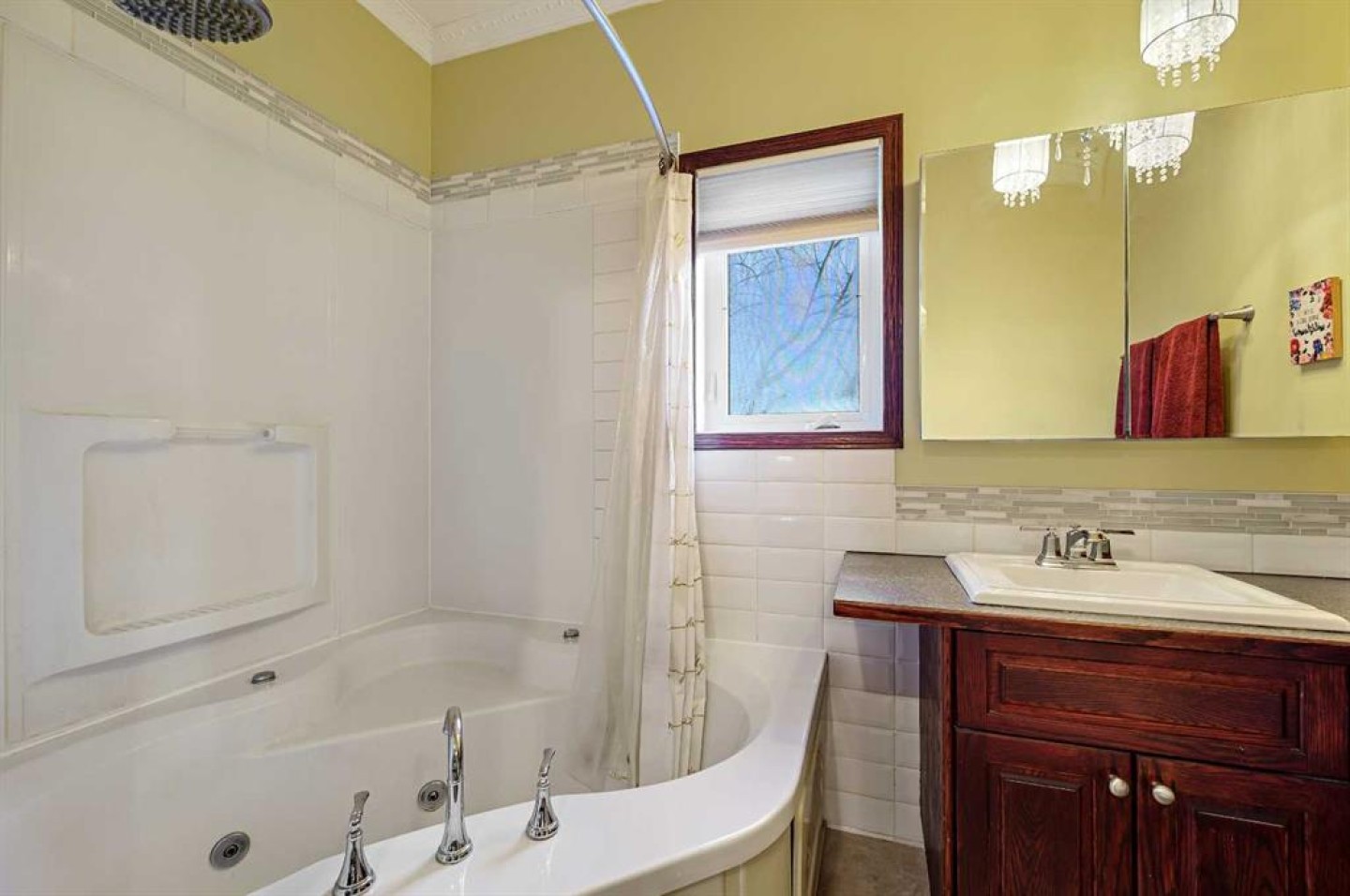 Welcome to this fully developed bungalow, perfectly situated on one of the largest private lots in a desirable, family-oriented neighbourhood. This beautifully maintained detached home offers comfort, functionality, and an exceptional outdoor retreat. The inviting layout features high vaulted ceilings, natural woodwork, abundant storage, and a fully finished basement designed for everyday living and entertaining. The kitchen offers a pantry, ample cabinetry, and seamless flow into the dining area and main living room, making it ideal for family gatherings and hosting guests. This home includes five bedrooms and three full bathrooms across two levels, along with two fireplaces. A cozy wood-burning fireplace warms the main floor, while the lower level showcases a gas fireplace with stone and wood detailing, perfect for movie nights or relaxing evenings. Designed for modern comfort, the home features central air conditioning, a jetted tub, and a forced-air natural gas furnace (2021). Recent upgrades provide peace of mind, including a new asphalt shingle roof (2025), new Hardie Board siding (2025), hot water tank (2020), and an insulated double attached garage complete with mezzanine, water, and 220-volt power. The exterior truly shines with a large private backyard and expansive deck with custom-built privacy screening. Additional outdoor features include underground sprinklers, garden space, a fire pit, dog run, and hot tub (as-is), creating the perfect setting for relaxation or entertaining. Located in a family-friendly community with nearby schools, playgrounds, sidewalks, and street lighting, this home offers both lifestyle and convenience. A rare opportunity to enjoy indoor comfort and outdoor living in one exceptional package