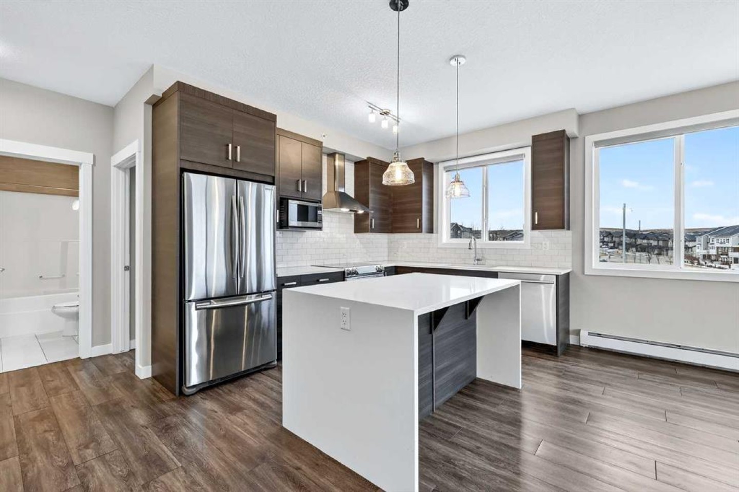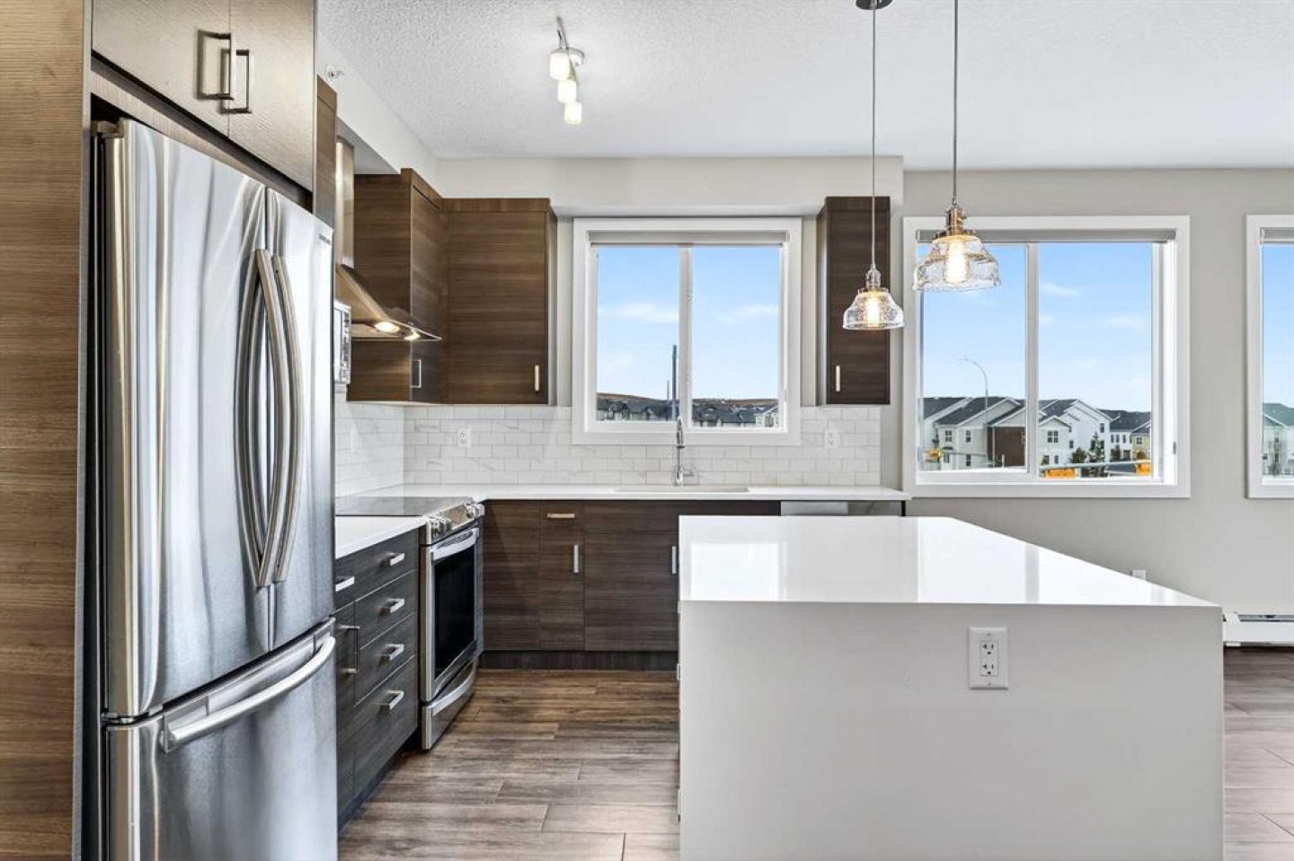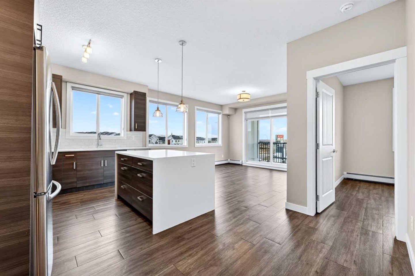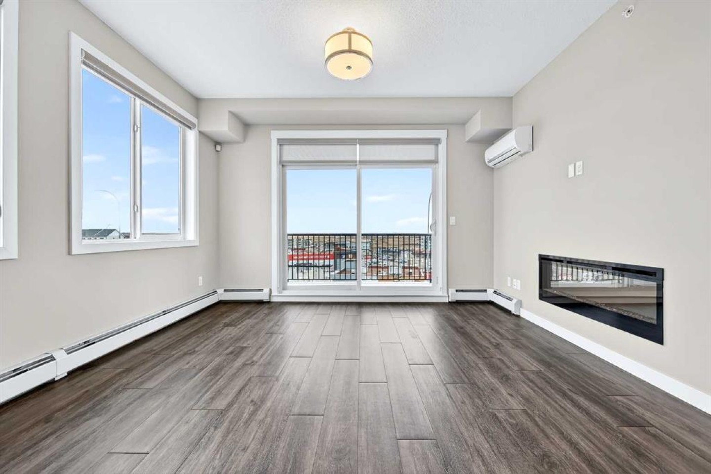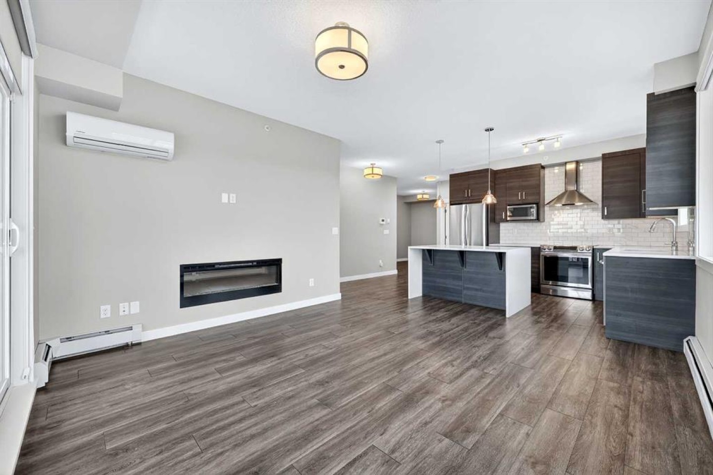 Welcome to refined top-floor living in the heart of NW Calgary’s Sage Hill. This spacious 2-bedroom, 2-bathroom corner residence offers 975 sq.ft. of thoughtfully designed living, ideal for professionals, families, or those seeking a well-appointed downsize without compromise. Positioned on the top floor, the home is flooded with natural light through multiple windows, enhanced by 9-foot ceilings that create an airy and comfortable sense of openness. Upon entry, a versatile den provides the perfect space for a home office, reading nook, formal dining or additional seating area. The open-concept living and kitchen area forms the heart of the home, anchored by an upgraded oversized island—ideal for everyday living and effortless entertaining. Finished with luxury vinyl plank flooring, a premium appliance package, and clean contemporary lines, the kitchen balances style with functionality. The living area is warmed by a sleek electric fireplace, creating a welcoming atmosphere year-round. The primary bedroom features a private ensuite, while the second bedroom offers flexibility for guests or work-from-home needs. Step outside to the private balcony and enjoy open, panoramic views—a quiet place to unwind at the end of the day. Additional highlights include air conditioning, custom built-in closet shelving for efficient storage, an extra large underground parking stall, assigned storage locker, and a location steps from the elevator for seamless access from parkade to suite. Thoughtfully designed and exceptionally well located, this top-floor corner unit offers a rare combination of space, light, and comfort. Whether you’re entering the market or simplifying your lifestyle, this home delivers a balanced, low-maintenance living experience in one of NW Calgary’s most connected communities. Call your favourite Realtor to book a private showing today!
