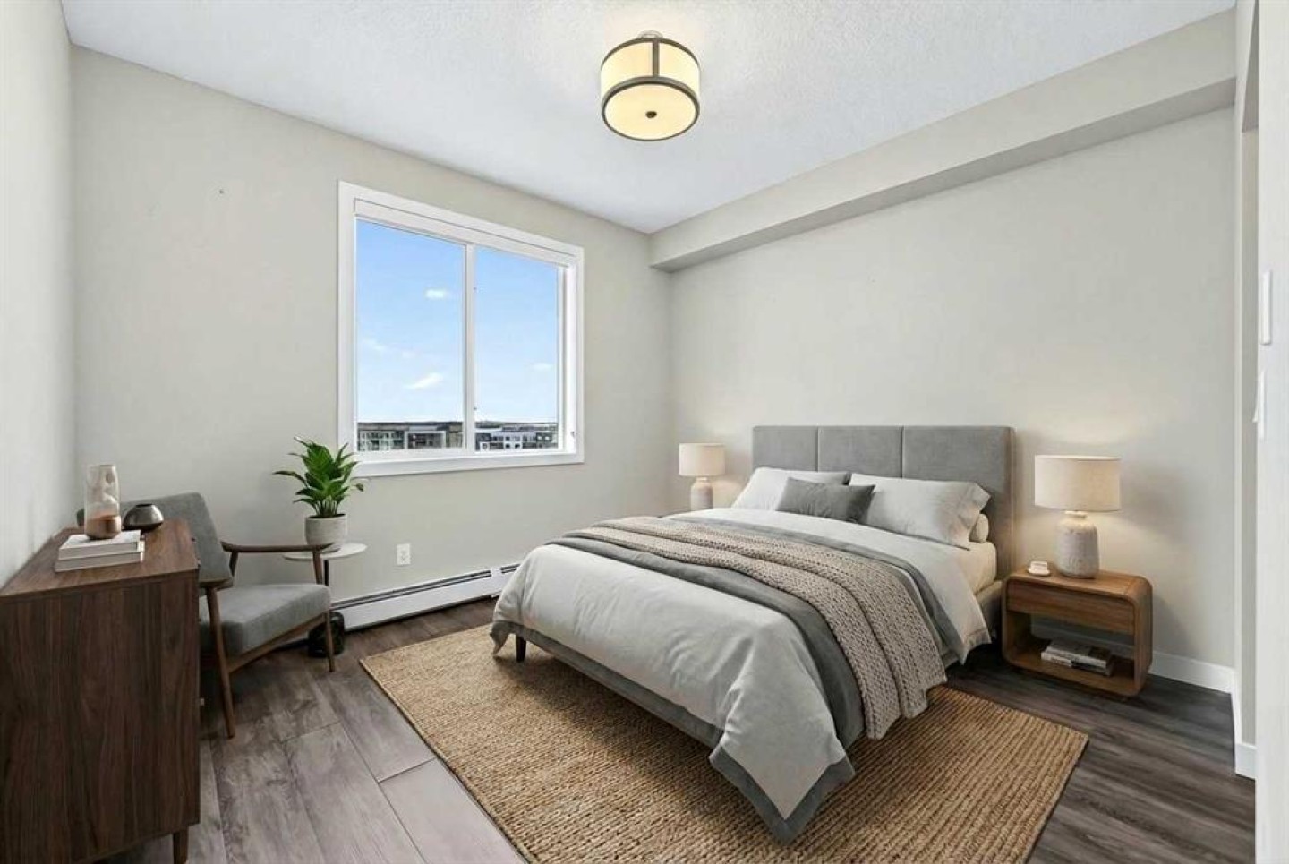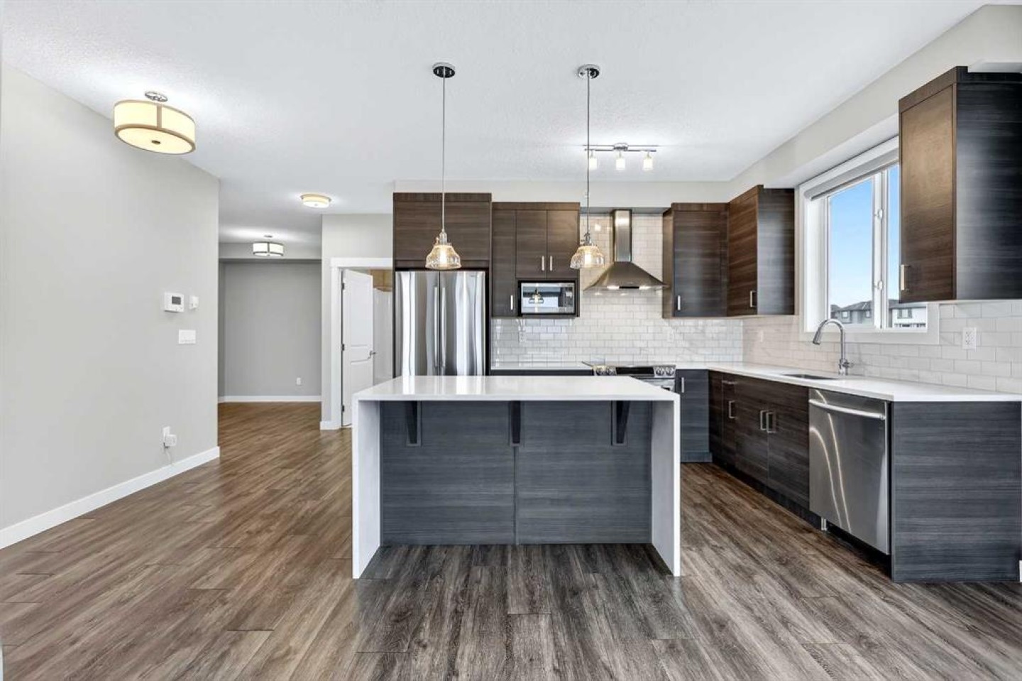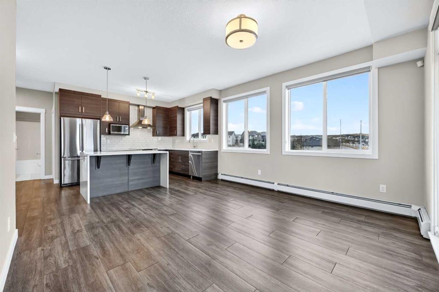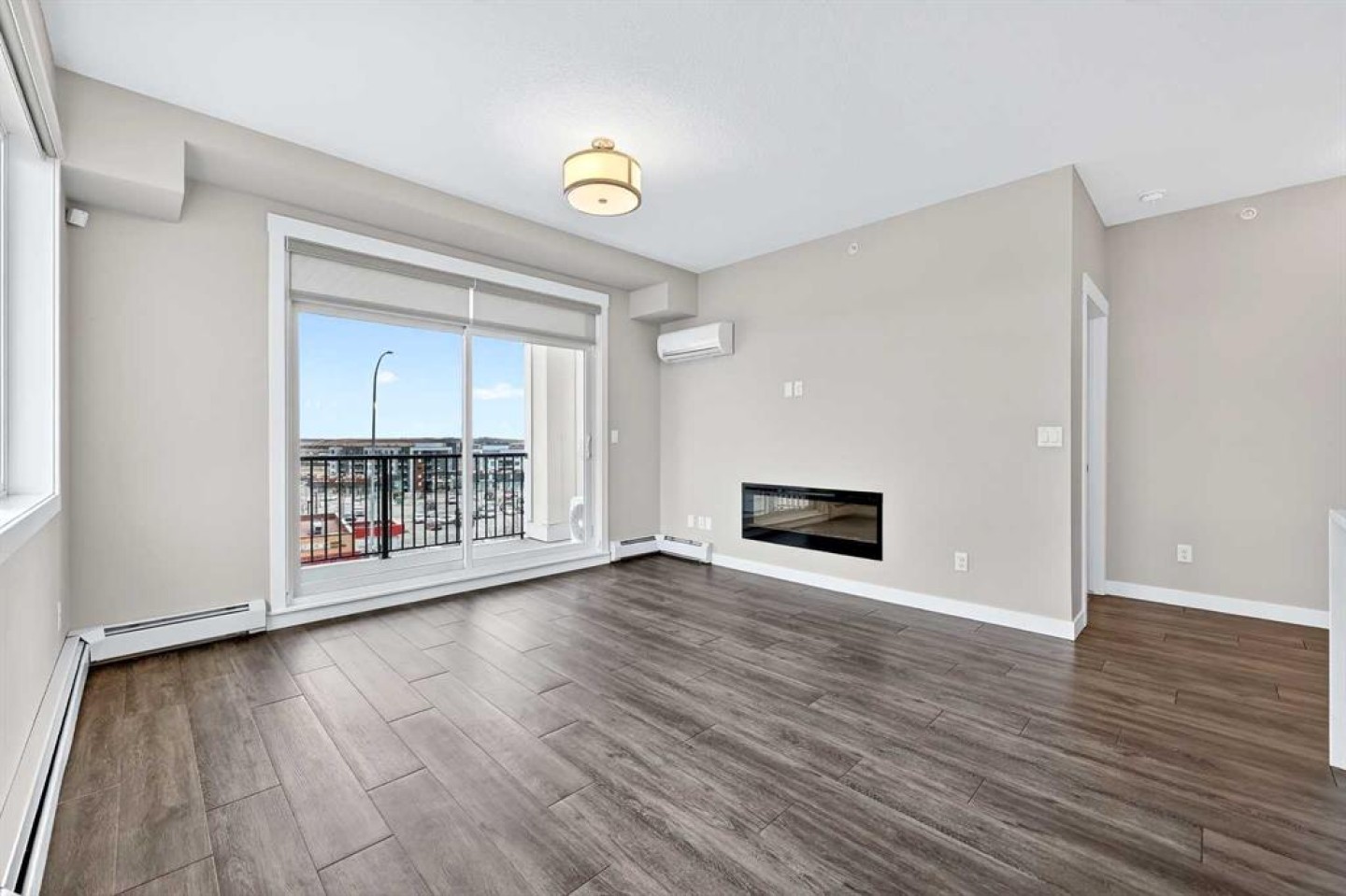 Welcome to refined top-floor living in the heart of NW Calgary’s Sage Hill. This spacious 2-bedroom, 2-bathroom corner residence offers 975 sq.ft. of thoughtfully designed living, ideal for professionals, families, or those seeking a well-appointed downsize without compromise. Positioned on the top floor, the home is flooded with natural light through multiple windows, enhanced by 9-foot ceilings that create an airy and comfortable sense of openness. Upon entry, a versatile den provides the perfect space for a home office, reading nook, formal dining or additional seating area. The open-concept living and kitchen area forms the heart of the home, anchored by an upgraded oversized island—ideal for everyday living and effortless entertaining. Finished with luxury vinyl plank flooring, a premium appliance package, and clean contemporary lines, the kitchen balances style with functionality. The living area is warmed by a sleek electric fireplace, creating a welcoming atmosphere year-round. The primary bedroom features a private ensuite, while the second bedroom offers flexibility for guests or work-from-home needs. Step outside to the private balcony and enjoy open, panoramic views—a quiet place to unwind at the end of the day. Additional highlights include air conditioning, custom built-in closet shelving for efficient storage, an extra large underground parking stall, assigned storage locker, and a location steps from the elevator for seamless access from parkade to suite. Thoughtfully designed and exceptionally well located, this top-floor corner unit offers a rare combination of space, light, and comfort. Whether you’re entering the market or simplifying your lifestyle, this home delivers a balanced, low-maintenance living experience in one of NW Calgary’s most connected communities. Call your favourite Realtor to book a private showing today!