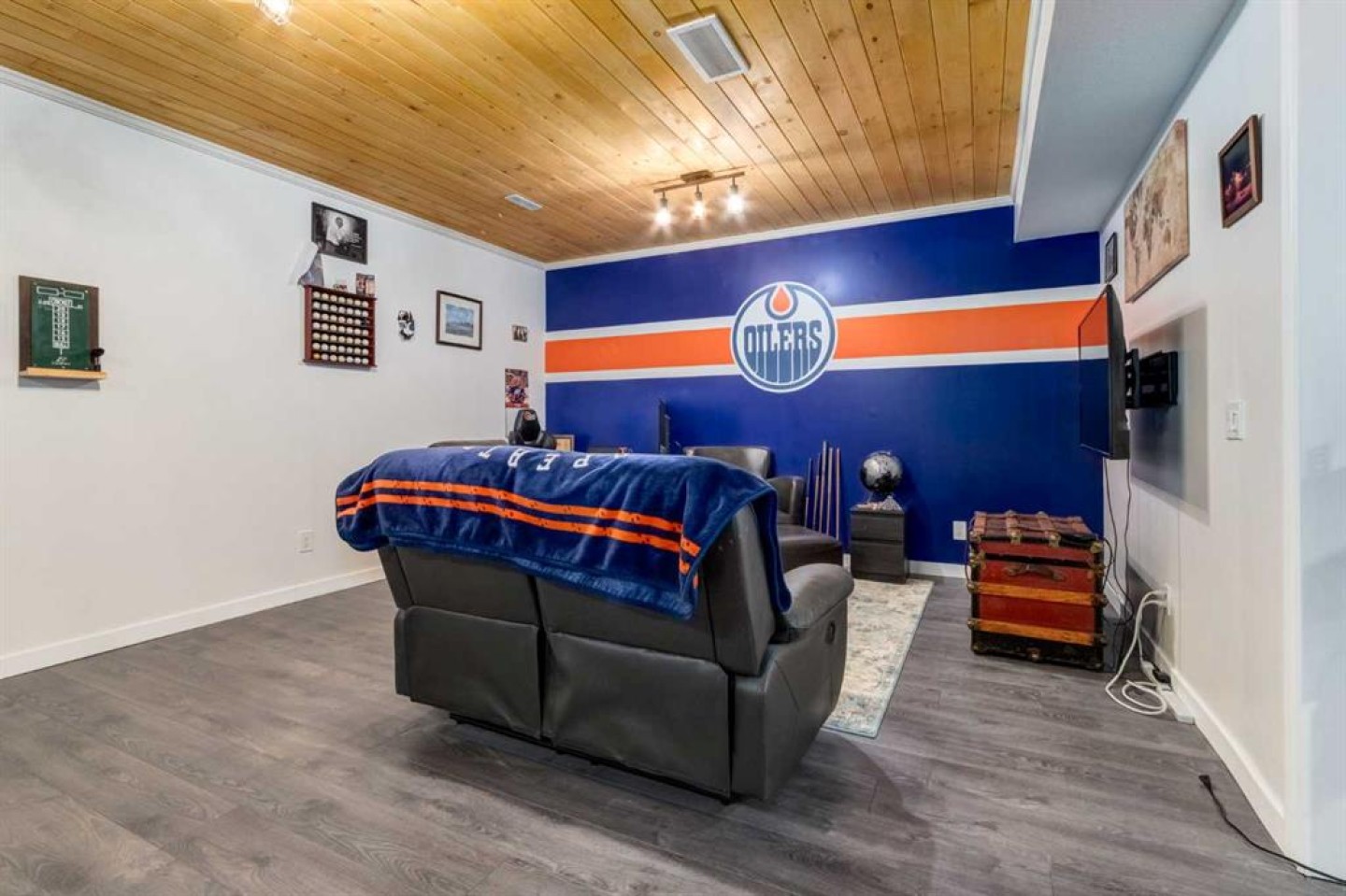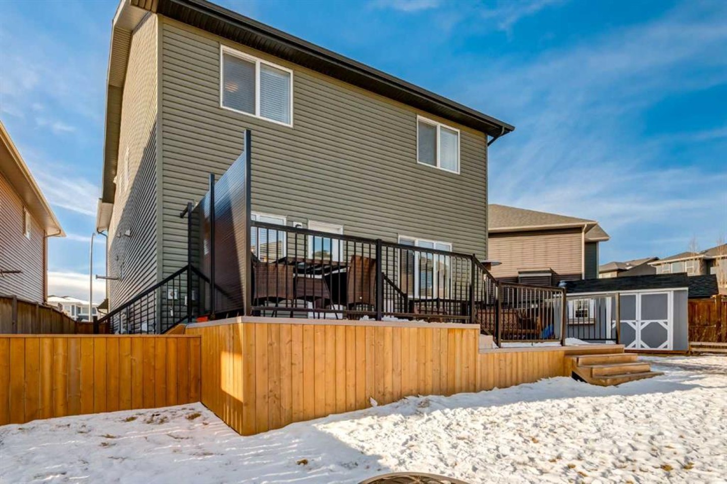 26 Mount Rae Terrace is the perfect family-friendly home to raise a family. The welcoming entry features a tiled foyer paired with the warmth of hand-scraped hardwood flooring, creating an inviting first impression for family & guests. The walk-through mudroom acts as an extension of the kitchen, featuring a stylish coffee bar, pantry with custom shelving, plus the everyday convenience of custom shoe shelving, built-in bench seating & coat hooks. Direct access to the heated garage with gas heater adds exceptional functionality. The chef’s kitchen features extended cabinetry, ample counter space, granite countertops, abundant lower drawers & full-height uppers, with new custom lighting in the kitchen & dining area. A large centre island offers seating for two, wine racks & cookbook shelving. Gas cooktop & stainless steel built-in oven/microwave complete the space. The dining area & family room are open to the kitchen & highlighted by a stone-surround fireplace & large windows overlooking the massive east-facing backyard. Enjoy the expansive composite deck with new privacy screen, ideal for outdoor entertaining, with added trees enhancing privacy. Upstairs, all three children’s bedrooms include walk-in closets. The main bath features dual sinks, granite counters & a pocket door separating the toilet & bathing space from the wash area, allowing multiple children to get ready at once. The laundry room includes storage shelving, a raised custom pedestal for front-load washer & dryer & a folding shelf. The primary suite offers west-facing windows with mountain views, a walk-through closet with custom built-ins & an ensuite with dual sinks, high-profile cabinetry & a separate shower. The finished basement includes a refreshed recreation room with wood slat ceiling, central gym space & rough-ins for a future bathroom. New central air conditioning adds year-round comfort. New custom lighting & granite finishes complete this exceptional family home.