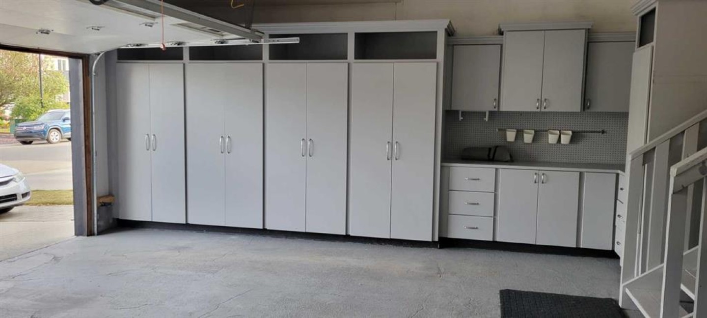 Shed, Pergola, Firepit, Attached Shelving and Cabinets in the garage