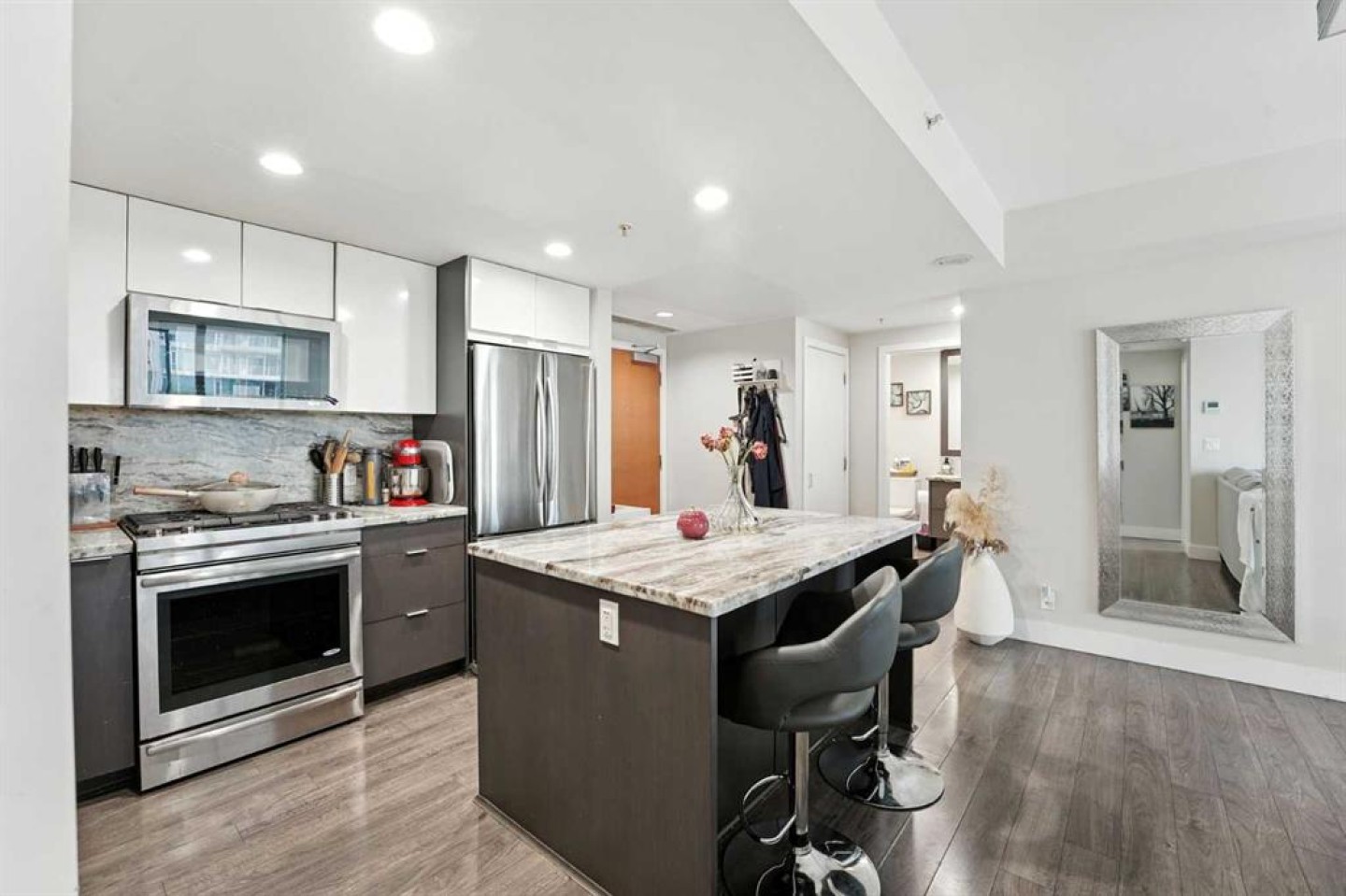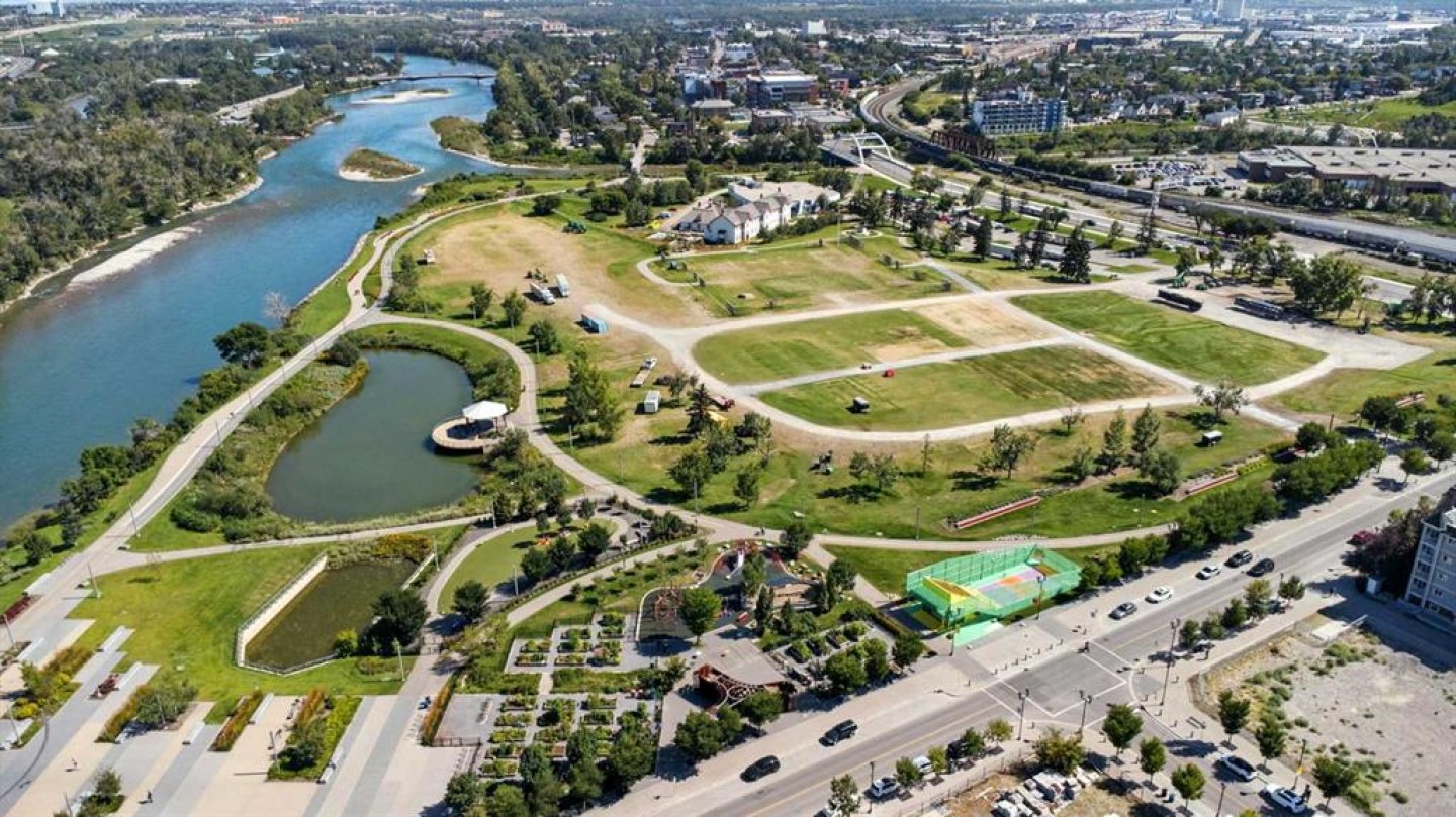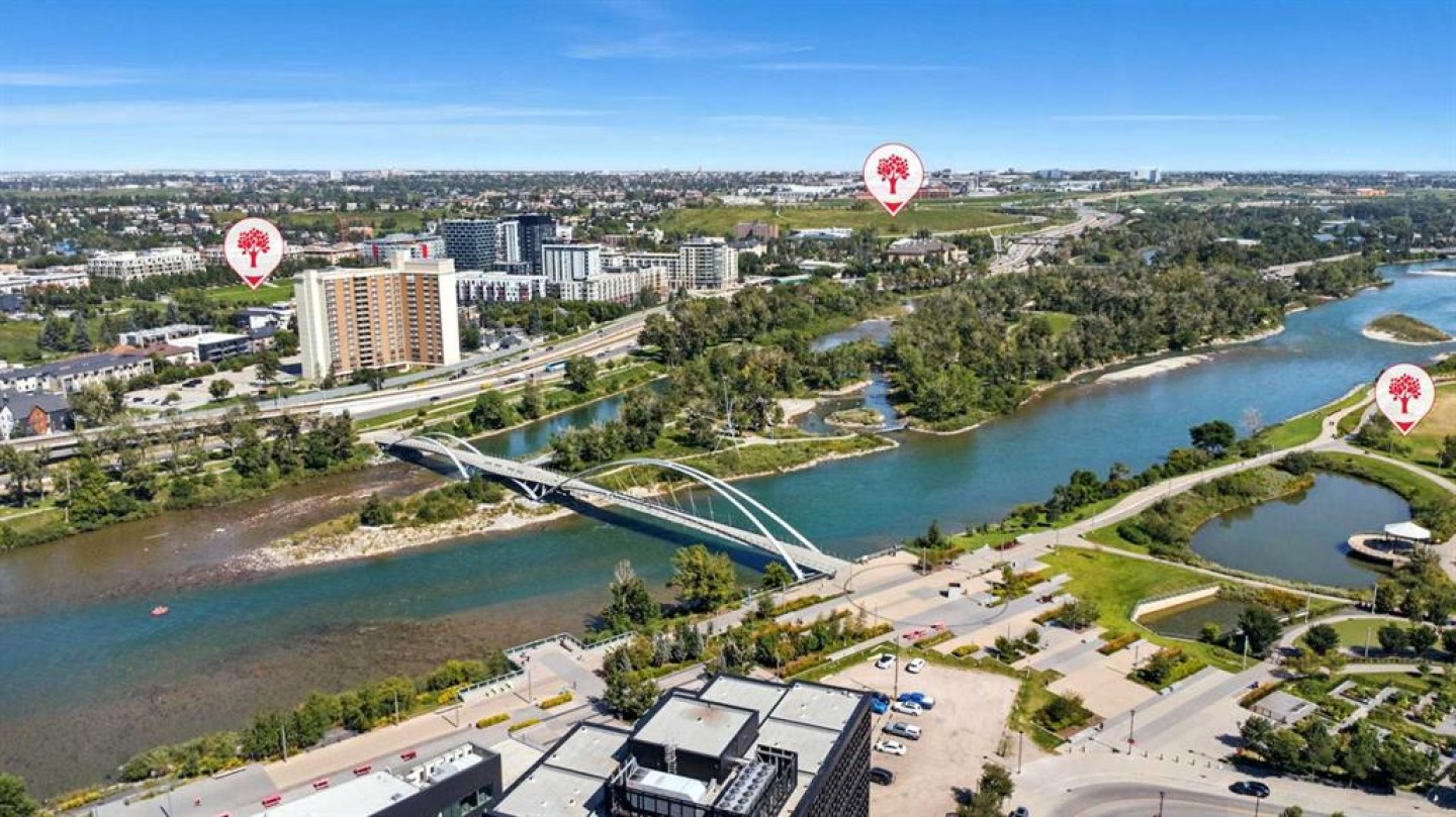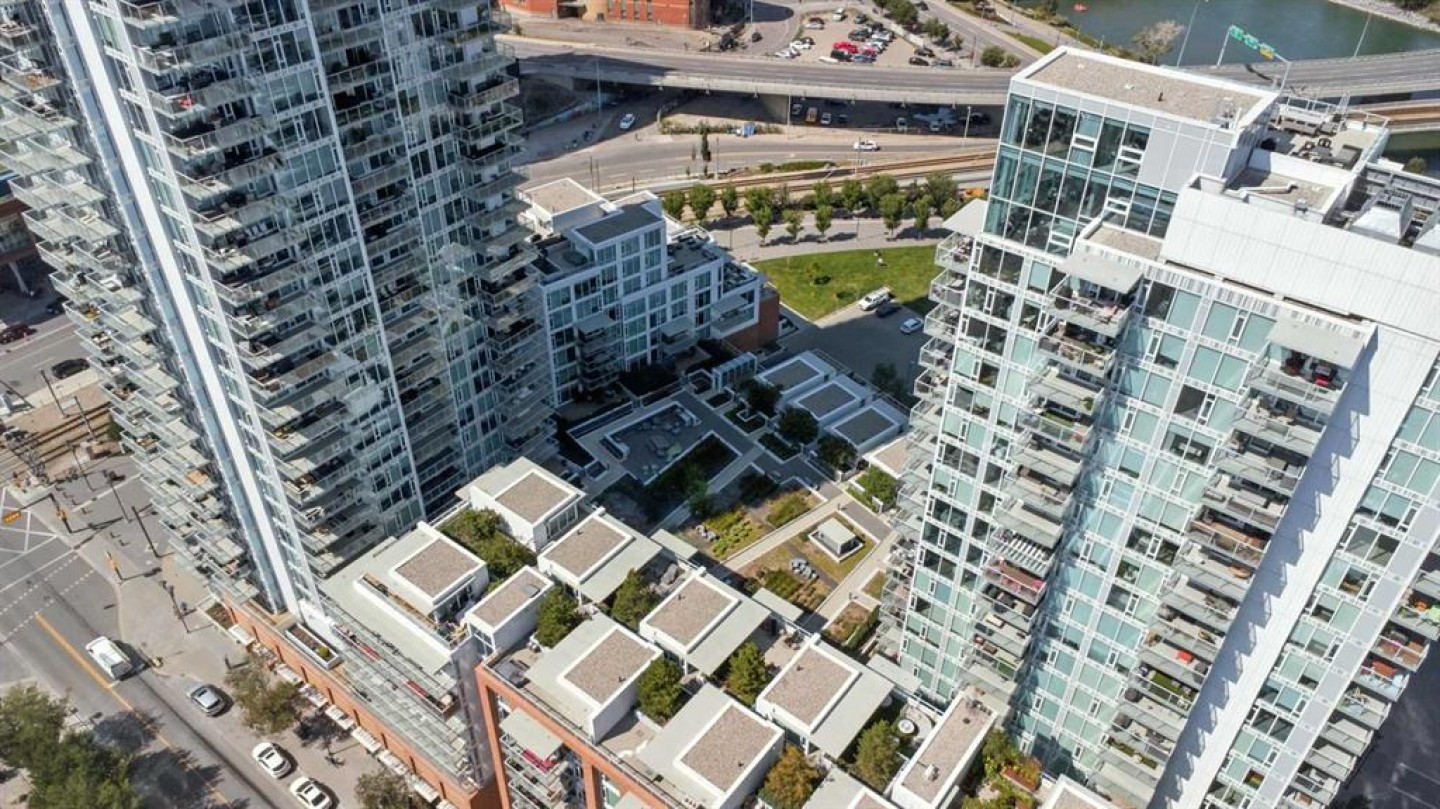 Welcome to your urban sanctuary in the vibrant heart of East Village! This modern 2-bedroom, 2-bathroom suite the Evolution building is a perfect fit for both first-time buyers seeking a dynamic lifestyle and savvy investors eyeing a prime downtown asset. This is a space where style meets function. The bright, open-concept layout is framed by floor-to-ceiling windows that fill the home with natural light. The contemporary kitchen features a gas range, granite countertops, and stainless steel appliances—perfect for a quick meal or a gourmet dinner. Both bathrooms offer the luxury of heated floors, while the primary ensuite boasts dual sinks and a separate tub and shower. Central A/C, in-suite laundry, and secure underground parking and storage add to the low-maintenance appeal. Beyond your door, a world of premium amenities awaits. Residents enjoy a 24/7 concierge, a fitness facility with sauna and steam rooms, a social lounge, and a rooftop patio with BBQs—all designed for a life of convenience and relaxation. With a Walk Score of 94, East Village is your playground. Stroll to the Bow River pathways, the Central Library, Studio Bell, and an array of shops, cafes, and restaurants. The C-Train and Superstore are just a few steps away, making daily errands a breeze. This is more than a condo—it's a smart investment in a thriving, walkable community. Don't miss this opportunity to own a piece of Calgary's most exciting neighbourhood!