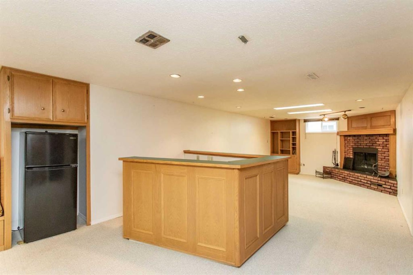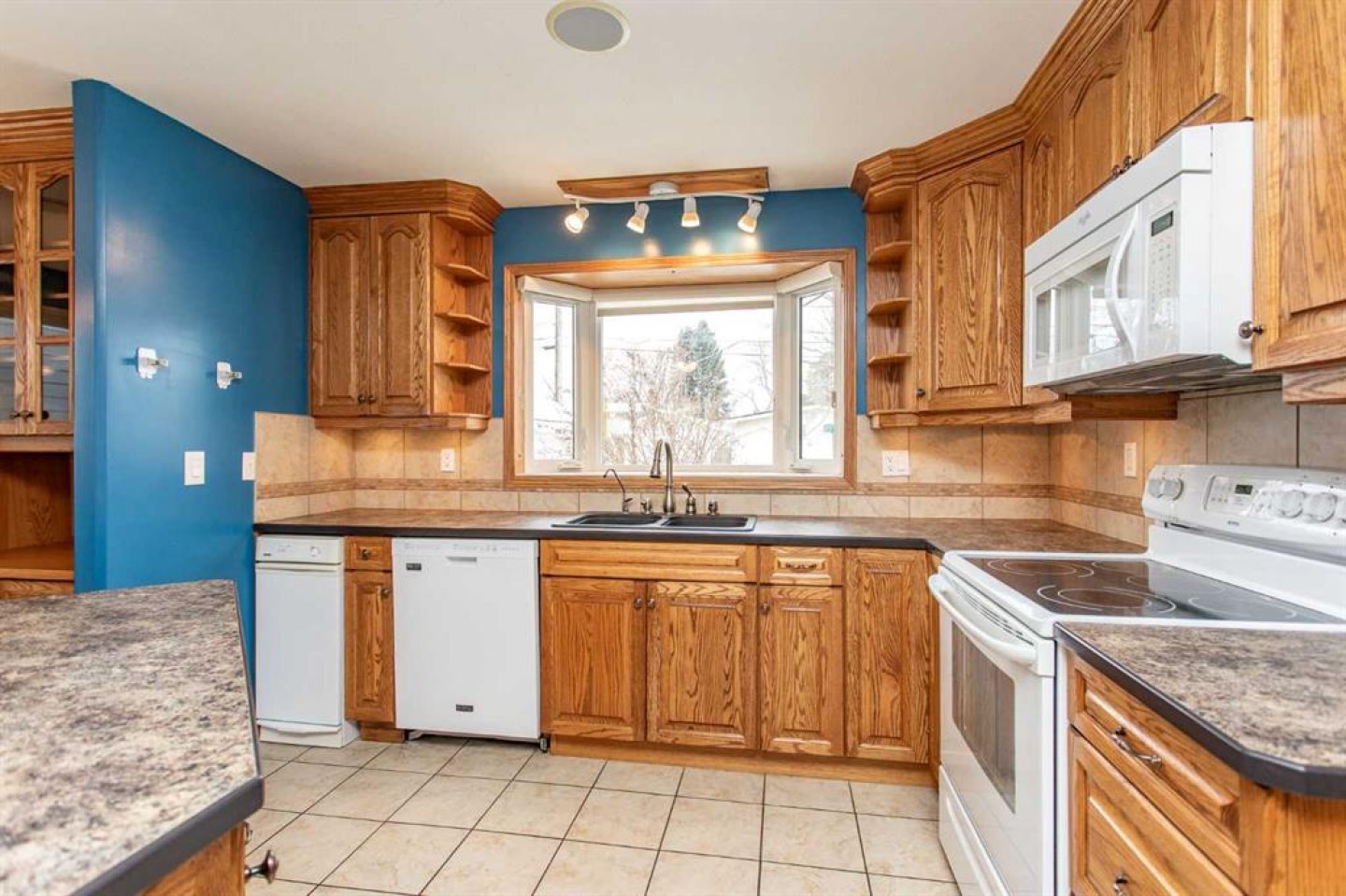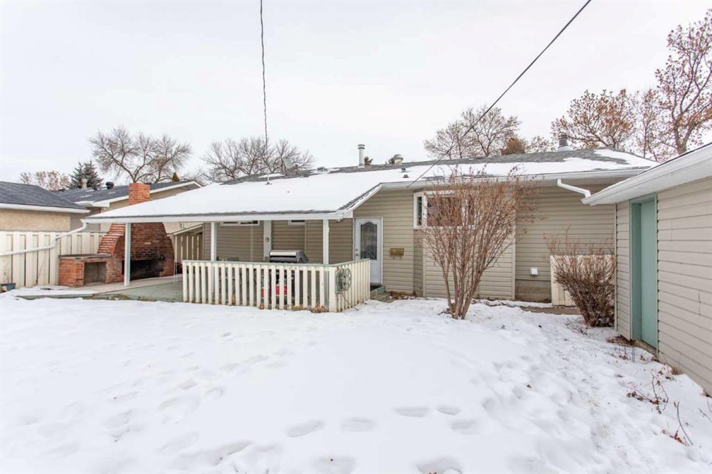 If you are seeking a home in the heart of downtown Lacombe, this well-maintained bungalow offers an excellent opportunity. As only the second owner since its construction in 1967, pride of ownership is evident throughout. The main floor features a spacious kitchen with ample countertop space, a dining area, and a comfortable living room. There are three bedrooms on this level, including a primary bedroom with a two-piece ensuite. One bedroom has been converted to accommodate main floor laundry but may be reverted to serve as a third bedroom if desired. The basement includes a fourth bedroom, a three-piece bathroom, and a large family/games room fitted with a dry bar. Built-in benches convert into double-size beds, making the area ideal for hosting guests. Notable updates include new countertops, cabinetry, backsplash, a large island, abundant oak cabinetry, custom built-ins, modern tile flooring, and the majority of windows replaced. Additional insulation was also added when the siding was updated. Outdoor amenities feature a covered patio with a wood-burning brick fireplace, perfect for use during spring, summer, and autumn. The property includes a single-car garage, fenced yard, garden shed, garden area, and convenient back alley access. Shingles were replaced around 2015.