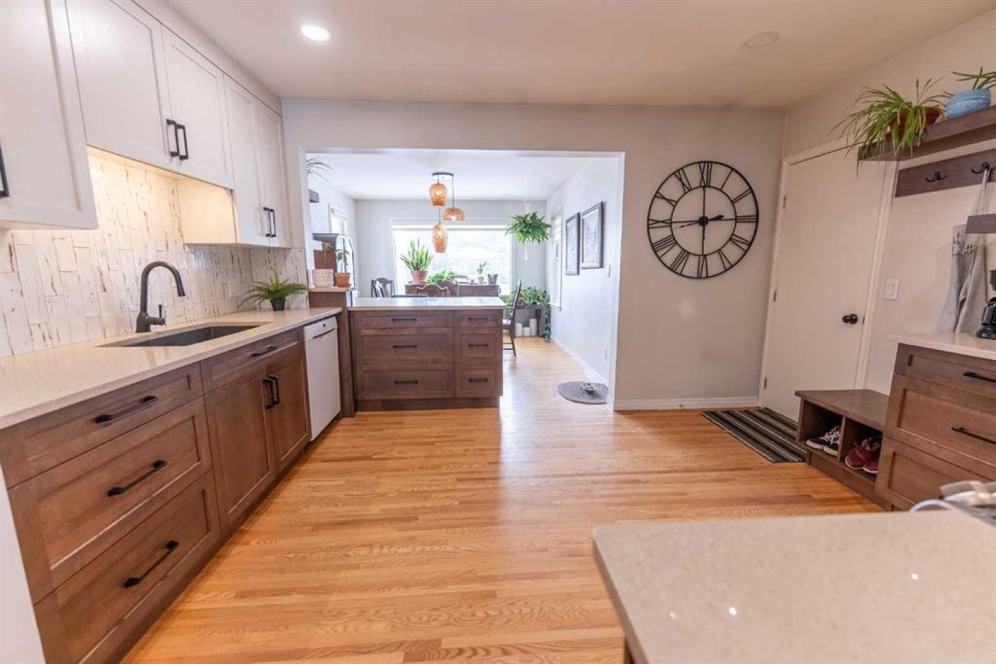 **Suite Sensation Meets Modern Luxury** Welcome to a home where high-end design meets functional living. This property has undergone over $100,000 in gorgeous custom renovations, blending "suite sophistication" with thoughtful, modern upgrades. From the moment you step onto the matching red oak hardwood floors that flow throughout the main level, you will feel the quality and care poured into every square inch. The heart of the home is a spectacular kitchen that has been professionally opened up to a sunny, south-facing dining room, creating a bright and airy atmosphere perfect for entertaining. This chef’s dream features sparkling quartz countertops, a pantry , extra cabinetry, and custom built-in shelving and bench seating. The main level offers two huge bedrooms and a designer bathroom that feels like a private spa, complete with trendy penny tile flooring, a stunning stone vessel sink, and a beautifully finished shower. Adding to the incredible value of this home is a separate rear entrance that leads directly downstairs to a fully finished and furnished lower level. This versatile space includes a functional second kitchen, a large third bedroom, a three-piece bathroom, and a flexible room perfect for a home office or gym, all while maintaining access to a shared laundry area. Step outside to enjoy the covered back deck overlooking a large, private yard—an ideal oasis for summer evenings. The property is rounded out with a single detached garage, an additional storage shed, and convenient off-street parking. Situated in a quiet, prime south-side location, you are just two blocks away from the Michener Recreation Centre, making this the perfect home for families or those seeking a premium investment. A Pleasure to View; a Privilege to Own. Its a great home isn't it! Shouldn't it be yours?