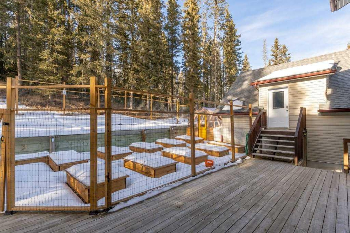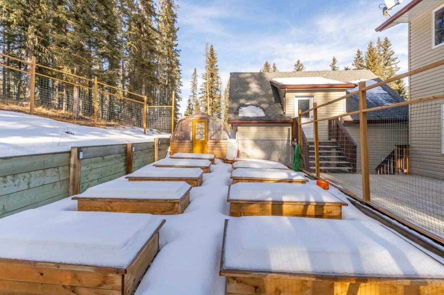 Greenhouse, raised beds, patio furniture top balcony, movie screen on balcony