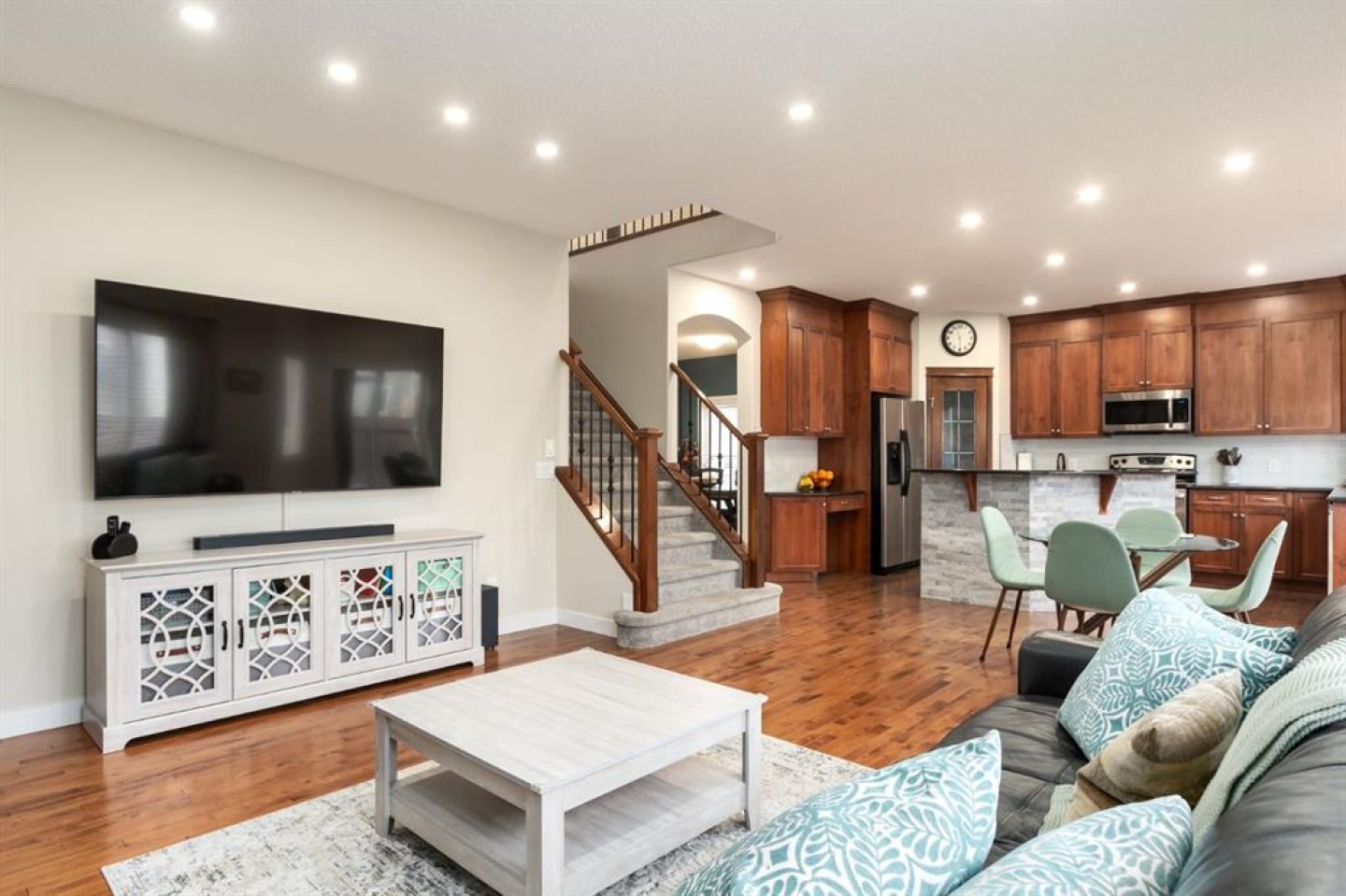 *OPEN HOUSE SATURDAY 12:00-3:00PM* Beautiful family home seeking new owner! Located on a quiet and well established street in Rainbow Falls, within walking distance to all amenities. You will be immediately impressed by the spacious entrance and bright, natural light. The main floor boasts HARDWOOD FLOORS, an open floor plan, and a cozy GAS FIREPLACE with floor-to-ceiling tile. The kitchen is set up perfectly for cooking and entertaining, with ample cabinet space, GRANITE COUNTERTOPS, STAINLESS STEEL APPLIANCES and a spacious pantry. RENOVATED 2pc guest washroom, dining room and laundry room complete the main floor. Head upstairs and you will find 3 spacious bedrooms and a large bonus room. Primary bedroom has an awesome walk-in closet and 5pc ensuite, equipped with dual vanities and a relaxing SOAKER TUB. Partially finished basement is framed and roughed-in for a bathroom and wet bar. All it needs is your creative touch! You will enjoy hanging in your sunny SOUTH FACING BACKYARD, featuring a large deck with BBQ gas line, stamped concrete patio and huge garden shed. Mature landscaping provides privacy. Other notable features include: OVERSIZED DOUBLE CAR GARAGE, CENTRAL AIR CONDITIONING, water-filtration system and some updated carpet and tile flooring. This family friendly community is the perfect place to settle. Within walking distance to the Elementary school, Middle school, Seagreen community gardens, hockey rink, skate park, community waterfalls and Chestermere Lake - You will LOVE living here! Book a showing before it's too late and CHECK OUT THE 3D VIRTUAL TOUR!