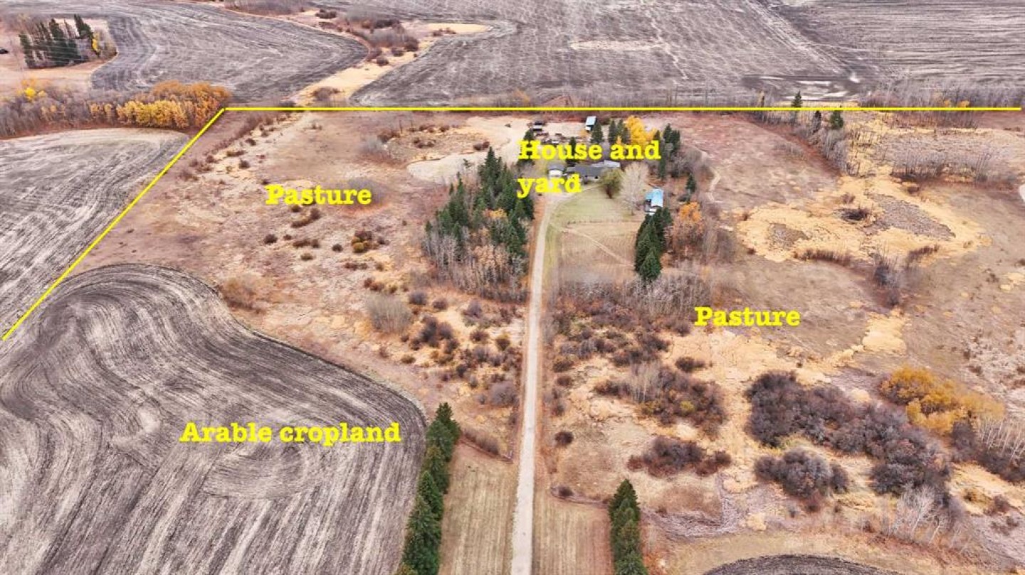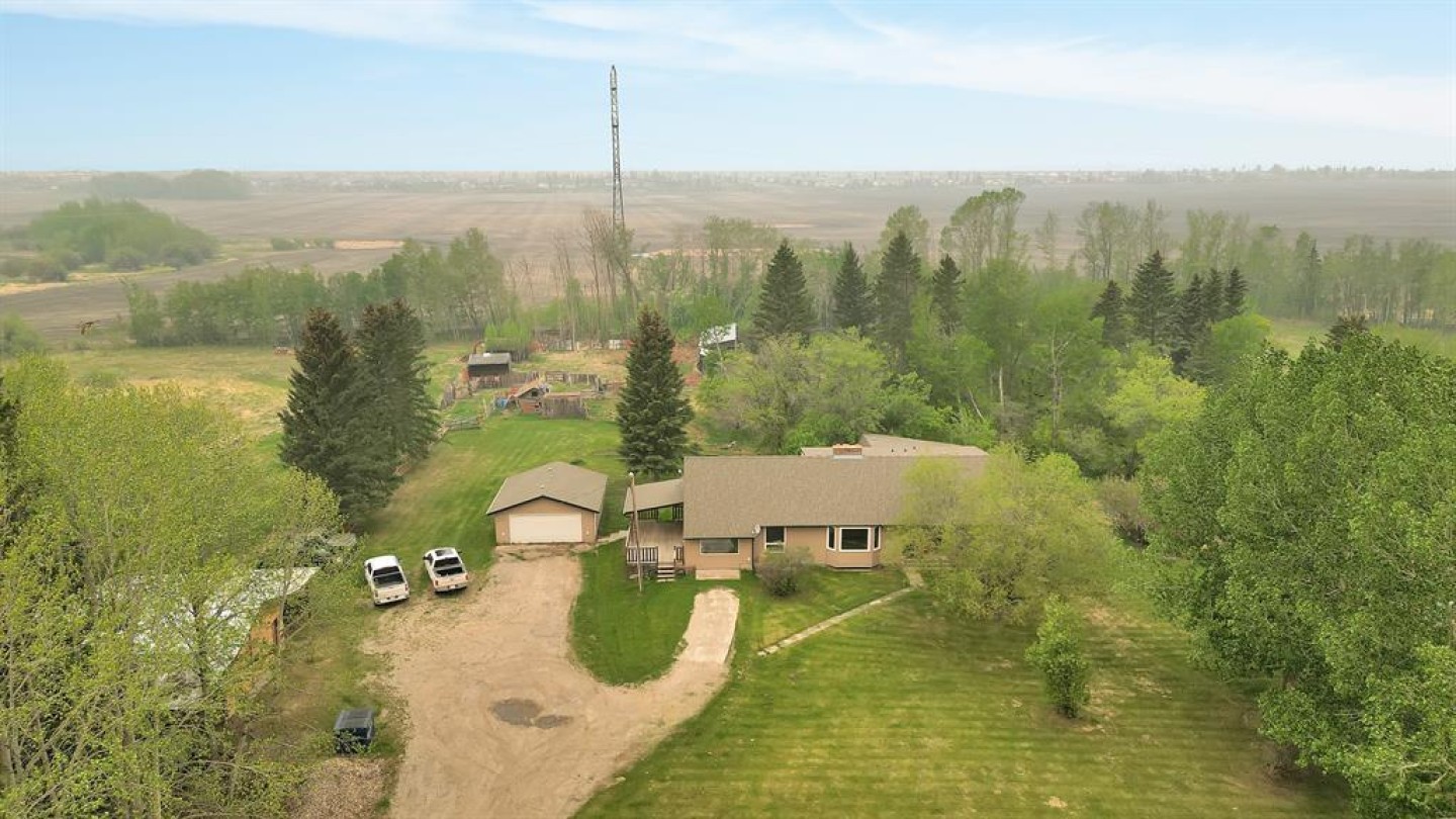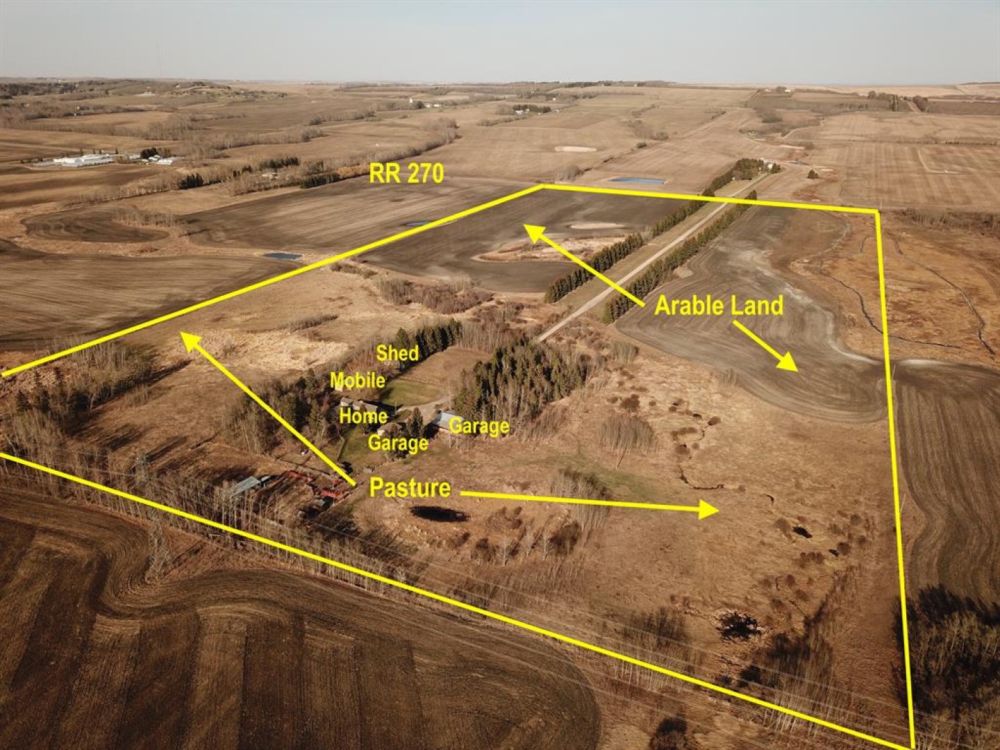 Fabulous opportunity with recent renovation upgrades! Invest in your future and enjoy complete privacy on this 80-acre parcel, located within Red Deer’s intermunicipal district along its eastern boundary. This property offers a wonderful rural lifestyle, a solid investment hold, dual-residence living, and multiple streams of farming income, including livestock, equestrian, tree farming, market gardening, and grain. With its proximity to the city, this is a unique opportunity where your living investment is sure to appreciate over time. The property features a 2-storey main house (built in 1974), a mobile home (1991), a 24'x24' detached garage (1976), a 40'x26' insulated shop with cement flooring, a 50'x24' cold storage pole-style shop (1998), and numerous other outbuildings. The land is level, with approximately 32 acres of arable farmland featuring excellent soil quality, expansive pastures, low-lying areas, treed and brush sections, and a beautiful tree-lined driveway that leads from paved Range Road 270 to the yard site. The main home offers a functional layout with a main floor master bedroom, two living areas (one with a wood-burning fireplace), a kitchen complete with an indoor barbecue, and a renovated 2-piece bath. The expansive bonus room addition features a gas fireplace, patio doors to the south-facing deck, and a bar area perfect for entertaining. Upstairs, you'll find a roomy bedroom with a Juliette balcony, a 4-piece bathroom, and an adjoining space with two additional sleeping areas. The lower level is wide open and offers ample storage, a utility area, and laundry. The well-maintained mobile home includes 2 bedrooms, 1 bathroom, upgraded vinyl windows (2007), a south-facing covered deck, and a parking shelter. Renovation highlights include new windows for both the house and mobile home (2007), a fully renovated main floor 2-piece bath, and a complete second floor renovation with new doors, trim, and paint. Also a complete bathroom reno including shower, flooring, vanity, and paint. Additional upgrades include shingles and siding on the house (2011) and a replacement of the septic tank (1992). Zoned A1 Future Urban Development District, this property allows for agricultural and related uses until the land is needed for urban development. This property is a rare combination of lifestyle, investment, income potential, and privacy—an opportunity that rarely comes along!