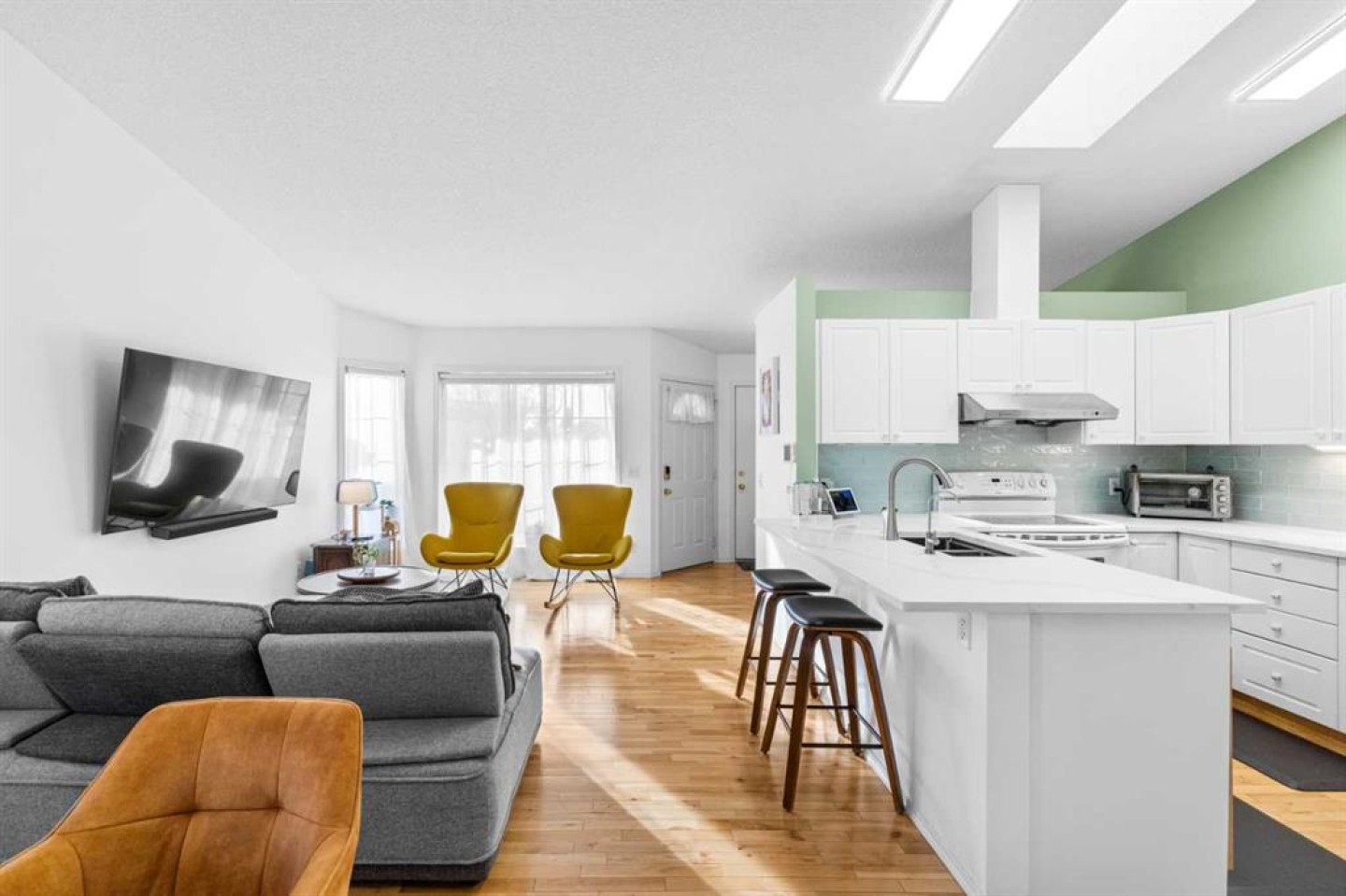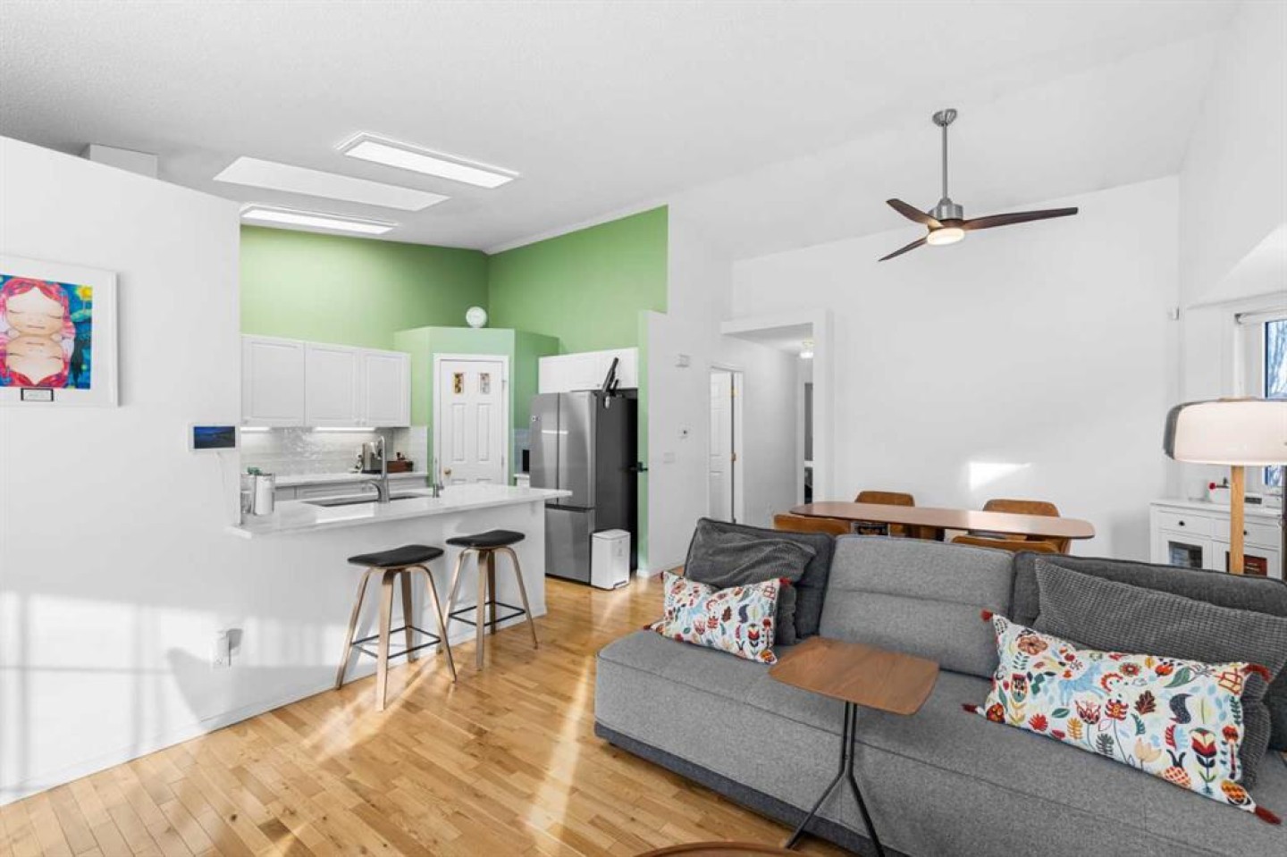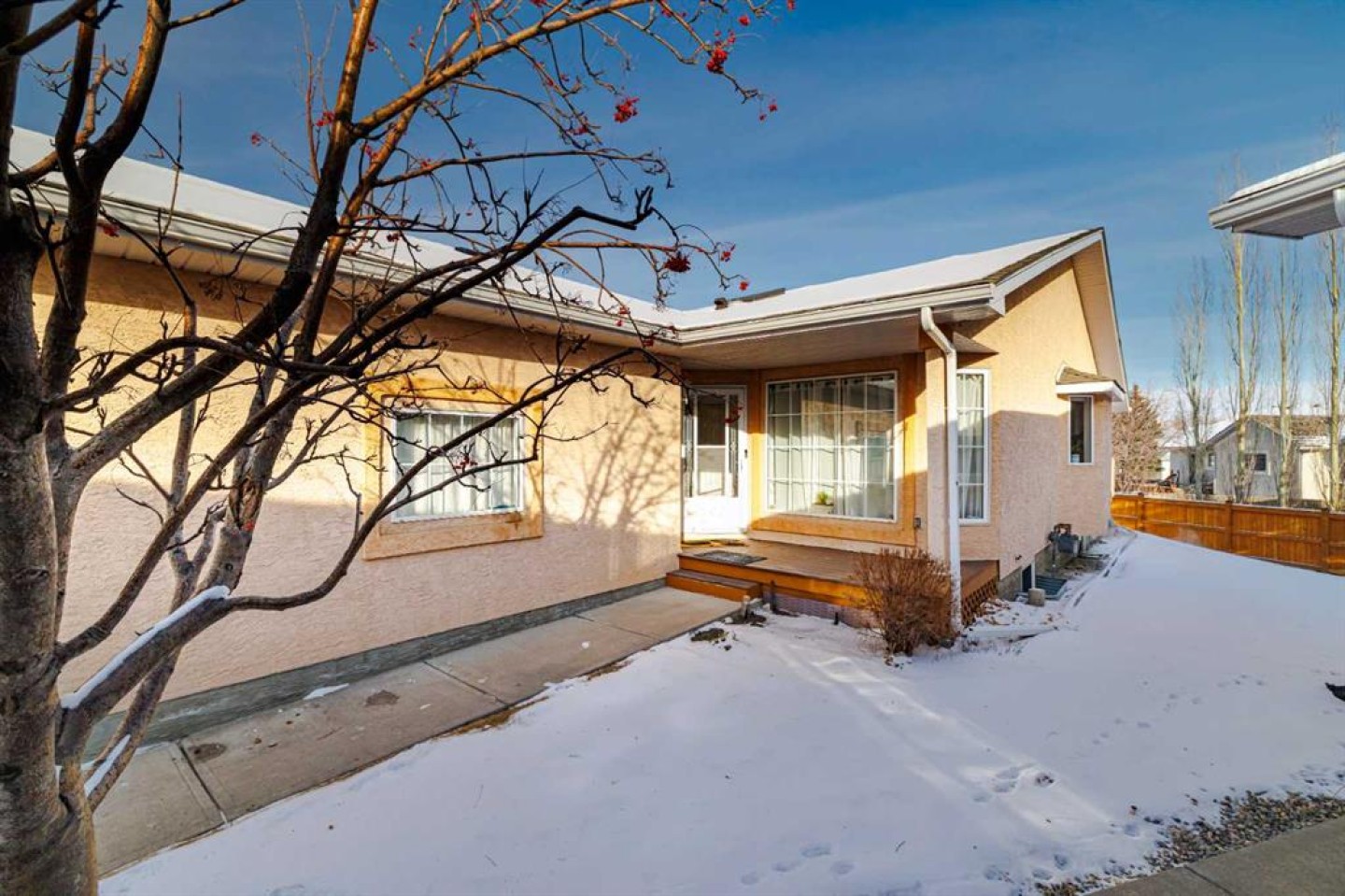A rare opportunity to own in this highly sought-after complex in the community of Harvest Hills. This immaculate bungalow villa is ideally suited for empty nesters and offers an attached single garage with a paved driveway providing additional parking. This property is not a condominium. Affordable monthly HOA fees of $231 include snow removal, landscaping and lawn care, common area maintenance, common insurance, and professional management. Located in a quiet and desirable 55+ age-restricted community where homes are seldom available, this residence demonstrates exceptional pride of ownership. Numerous recent upgrades include brand-new roof shingles (2025), brand-new eavestroughs (2025), a water pressure monitor (2025), comprehensive Poly B pipe replacement throughout the property (2022), a reverse osmosis system (2022), fresh paint throughout (2022), quartz countertops throughout (2022), an upgraded 800 CFM hood fan (2022), a new kitchen skylight (2024), and upgraded kitchen lighting (2026). Situated on a peaceful cul-de-sac, the home features a bright and open-concept main floor with vaulted ceilings in the living room, dining area, and kitchen. The recently renovated gourmet kitchen is beautifully appointed with quartz countertops, a glass subway tile backsplash, under-cabinet lighting, a powerful hood fan, and a generous pantry—ideal for both daily living and entertaining. Natural oak hardwood flooring and abundant natural light enhance the main level throughout. The main floor offers 944 sq. ft. of thoughtfully designed living space, including two bedrooms and a 4-piece main bathroom. The spacious primary suite features a walkthrough closet, while the generous second bedroom includes a large window and an exterior French door leading to a full-width deck overlooking the backyard and adjacent green space. The fully developed basement provides a large family/recreation room with a cozy free-standing fireplace, a spacious bedroom, a 3-piece bathroom, ample storage, and built-in shelving in the laundry/utility area. The recreation room can easily be reconfigured to accommodate a fourth bedroom, if desired. Enjoy quiet summer evenings on the private deck, take in beautiful sunsets, and even admire the Northern Lights from the comfort of your home. This exceptional property offers a serene setting with easy access to public transit and convenient routes to Country Hills Boulevard, Deerfoot Trail, and Stoney Trail. Located within minutes to T&T Supermarket, Tim Hortons, McDonald’s, Superstore, Sobeys, and much more! Be sure to view the Virtual Tour for a complete experience. Don’t miss this opportunity to own this Beautiful Home!