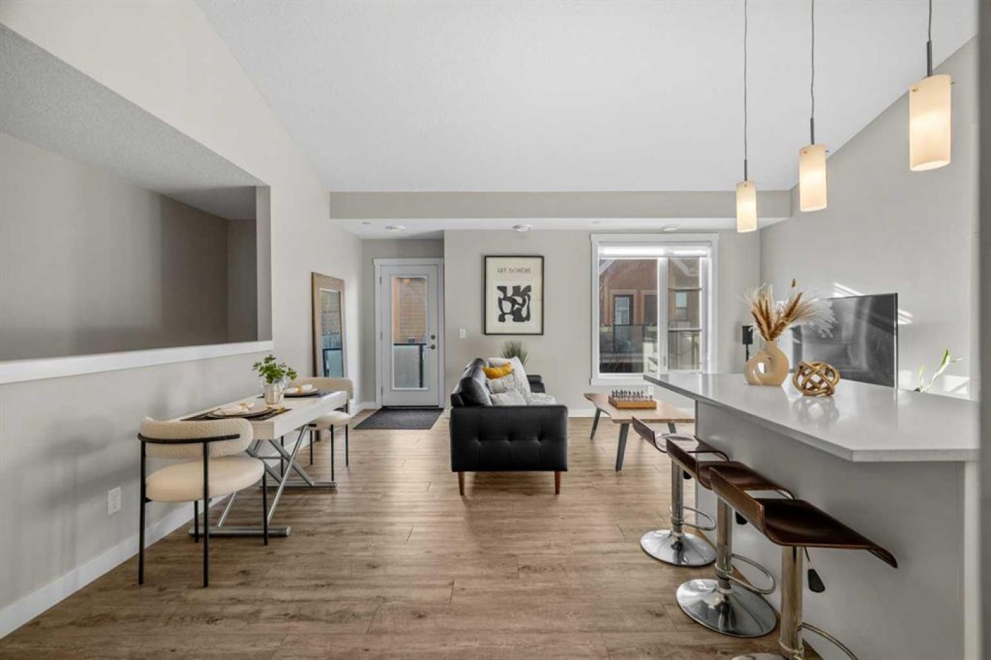OPEN HOUSE THIS SAT FEBRUARY 7 from 11:00 AM to 1:00 PM and 2:00 PM to 4:00 PM and SUN FEBRUARY 8 from 12:00 PM to 3:00 PM. Welcome to 124 Livingston Common NE, a modern and beautifully maintained top-floor townhouse in the heart of Livingston, one of North Calgary’s most thoughtfully planned and fast-growing communities. Built in 2019 and still protected under the Alberta New Home Warranty, this home offers peace of mind, style, and value. It is currently one of the best-priced townhouses in all of North and NW Calgary with an attached garage, making it an exceptional opportunity for first-time buyers or smart investors. Inside, you’ll find 946 square feet of bright, open-concept living enhanced by vaulted ceilings, oversized windows, and a warm, neutral colour palette. The kitchen is both stylish and functional, featuring white soft-close cabinetry, a full pantry, white quartz countertops, durable luxury vinyl plank flooring, stainless steel appliances, and a generous island ideal for everyday living or casual entertaining. The layout includes two well-proportioned bedrooms and a full bathroom, with the primary bedroom offering a walk-in closet and excellent natural light. Plush carpet with 8 lb underlay, ceramic tile in key areas, and thoughtful finishes throughout make this home both comfortable and low maintenance. Downstairs, you’ll appreciate extra storage under the stairs leading directly into the single attached garage, which also provides access from a paved rear alley. This pet-friendly condo allows up to two dogs or cats, features low condo fees, and is supported by an active, well-managed condo board. Visitor parking and abundant street parking make hosting guests easy. Perfect location, just steps from the Livingston Hub, a 35,000 sq ft HOA facility, residents enjoy access to a gym, splash park, skating rink, community events, and gathering spaces. Livingston is planned for seven future schools, the future Green Line C-Train, and offers over 250 acres of parks, pathways, and green space. With quick access to Stoney Trail, Deerfoot Trail, and Calgary International Airport, commuting and travel are effortless. This is walkable, connected, and modern living, all at a price that won't break the bank, Don't miss out!
