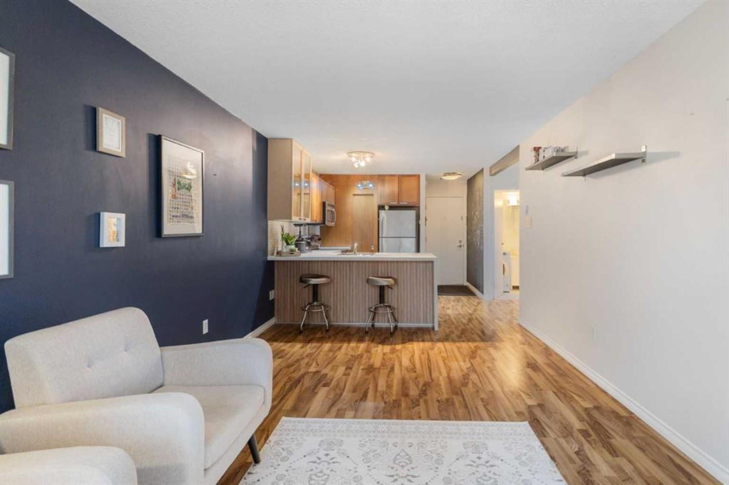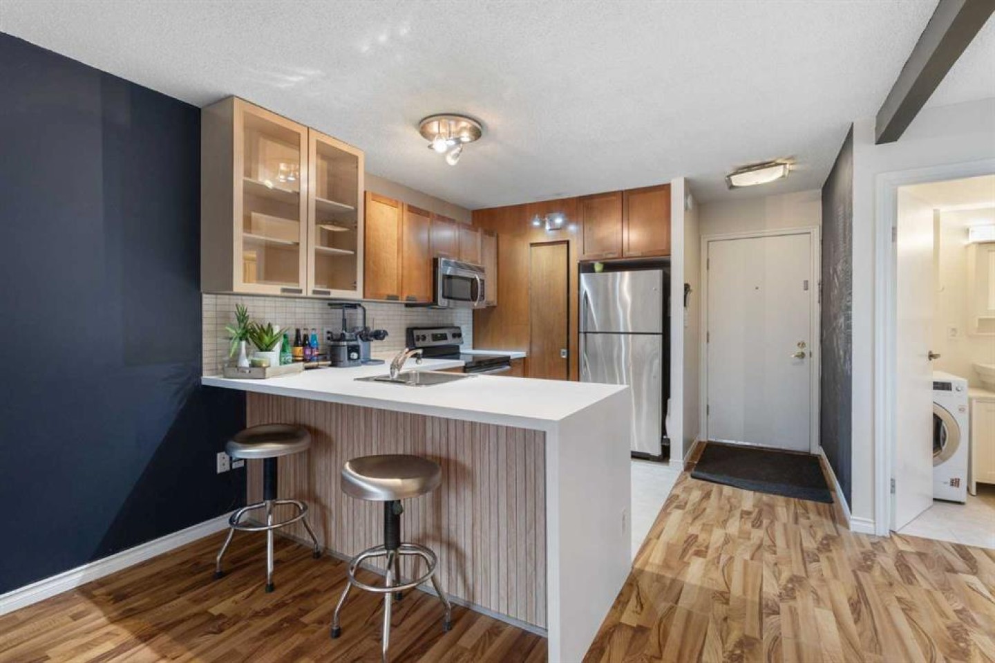 Welcome to inner-city living in the heart of the Beltline. Move in Ready 1 Bed, 1 Bath, with In-suite laundry. Situated on a quiet, tree-lined street just steps from the 17th Avenue shopping and dining district, this well-located condo offers the perfect balance of energy and privacy. This unit features a functional, owner-focused layout with laminate flooring throughout, fresh recent paint, and a bright, open living space ideal for everyday living and entertaining. The kitchen is both practical and inviting, offering ample cabinet and counter space, newly refinished countertops, and a rare walk-in pantry. The bathroom includes a convenient in-suite washing machine, a valuable bonus that adds comfort and everyday convenience. Located in a pet-friendly, well-managed building close to cafés, restaurants, shopping, transit, and downtown amenities, this move-in-ready home is ideal for first-time buyers, professionals, or anyone seeking a smart Beltline lifestyle.