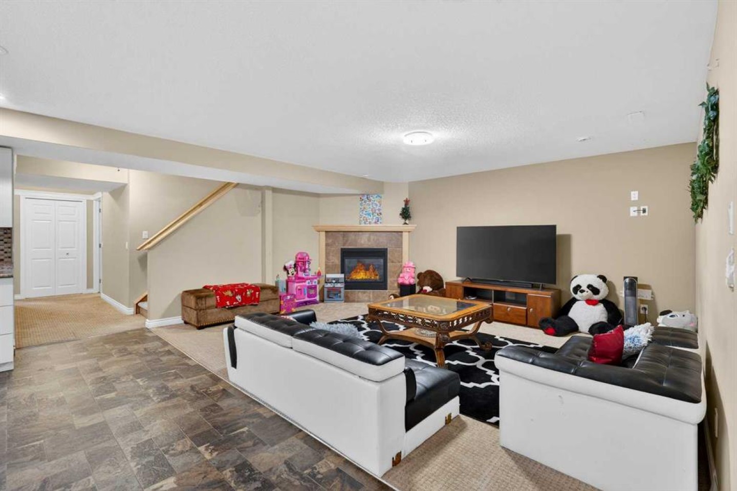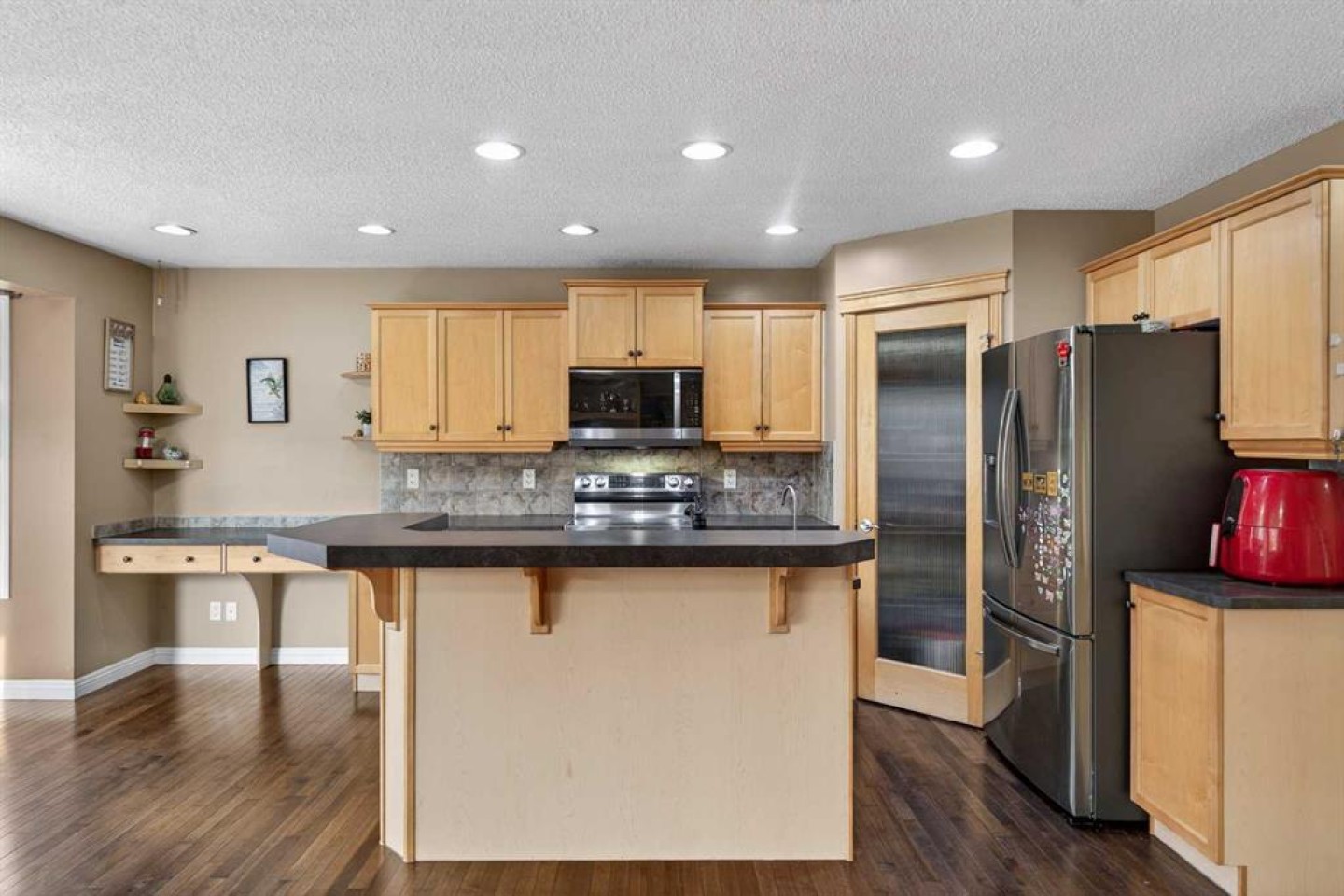 Located on a landscaped corner lot in the desirable community of Kings Heights, Airdrie, this fully finished two-storey residence offers four bedrooms, a functional layout, and extensive upgrades throughout. The property is conveniently situated near schools, parks, shopping, and community amenities. The main level features hardwood flooring and an open-concept design anchored by a living room with gas fireplace and custom built-in entertainment unit. A formal dining area provides flexibility for entertaining, workspace, or additional living use. The kitchen is equipped with ample cabinetry, a breakfast nook, and direct access to a west-facing deck overlooking the private backyard. A two-piece bathroom and a laundry area with garage access complete the main floor. An open-to-below hallway enhances natural light and architectural interest, leading to the upper level where a bonus room offers additional living space. The primary bedroom includes a walk-in closet and three-piece ensuite, while two further bedrooms and a four-piece bathroom complete the level. The professionally finished basement provides added versatility, featuring a recreation room, family room with corner fireplace, a fourth bedroom, four-piece bathroom, and a second kitchen. The basement is developed as an illegal suite and may be suitable for extended family living or supplemental income, subject to municipal approval. The west-facing backyard is fully fenced and landscaped, offering a spacious deck with privacy screen, rock accents, and a storage shed—ideal for outdoor living and entertaining. The heated double attached garage includes its own furnace for year-round comfort and functionality. Additional highlights include central air conditioning, central vacuum system, and garburator. This well-maintained home presents pride of ownership and is move-in ready.Located on a landscaped corner lot in the desirable community of Kings Heights, Airdrie, this fully finished two-storey residence offers four bedrooms, a functional layout, and extensive upgrades throughout. The property is conveniently situated near schools, parks, shopping, and community amenities. The main level features hardwood flooring and an open-concept design anchored by a living room with gas fireplace and custom built-in entertainment unit. A formal dining area provides flexibility for entertaining, workspace, or additional living use. The kitchen is equipped with ample cabinetry, a breakfast nook, and direct access to a west-facing deck overlooking the private backyard. A two-piece bathroom and a laundry area with garage access complete the main floor. An open-to-below hallway enhances natural light and architectural interest, leading to the upper level where a bonus room offers additional living space. The primary bedroom includes a walk-in closet and three-piece ensuite, while two further bedrooms and a four-piece bathroom complete the level. The professionally finished basement provides added versatility, featuring a r