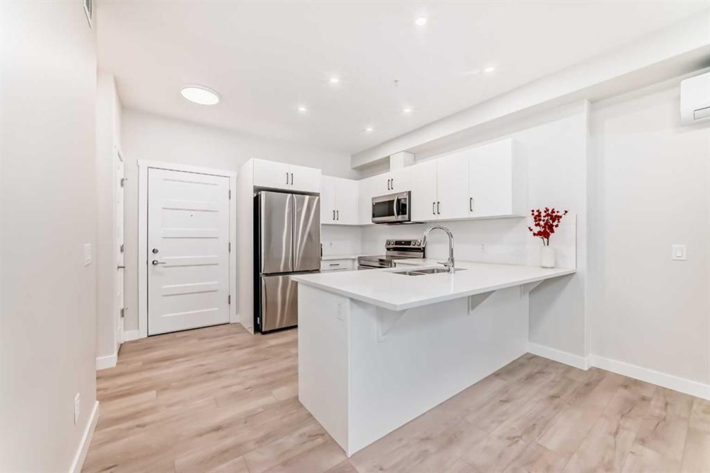 Welcome to Unit 2111, 2117 81 Street SW—a brand-new, 2-bedroom, 1-bath condo offering sophisticated low-rise living in Springbank Hill, one of Calgary’s most sought-after southwest communities. The unit features an efficient, open-concept layout filled with natural light and finished with wide-plank luxury vinyl flooring, designer tilework, and elevated details throughout. The contemporary kitchen is designed to impress with quartz countertops, cabinetry, a central eating bar, and a sleek stainless steel appliance package—perfect for everyday life and effortless entertaining. The bright living area opens to a private oversized patio, ideal for morning coffee or unwinding after work, all just steps from ravine-side pathways and scenic walking trails. Additional highlights include in-suite laundry, a built-in A/C unit, titled heated underground parking. Built by Cove Properties and thoughtfully positioned near Aspen Landing, top schools, dining, and transit options including the 69 Street CTrain Station—plus quick access downtown and easy weekend escapes toward the Canadian Rockies. A rare opportunity to own a luxury, air-conditioned home in a premium southwest location—book your private showing today.