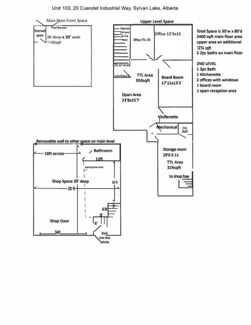 LOCATION, LAYOUT & FLEXIBILITY. Situated just east of Highway 20 in Sylvan Lake’s fast-growing Beju Industrial Area, this well-designed professional industrial bay presents an excellent opportunity for both owner-users and investors. The 30’ × 80’ unit features fully engineered second-floor office space with a separate exterior entrance, complete with two private offices, a boardroom, open reception area, lunchroom, storage room, and a 3-piece bathroom. The main level offers a functional split layout with a 30’ × 38’ front workspace and a rear 30’ × 39’ shop area equipped with a 16’ overhead door. Two 2-piece bathrooms and a work area, full rear access to the upper level adds operational flexibility. A gated rear yard provides secure outdoor storage or additional parking, making this an adaptable space for a wide range of business uses. Photos are prior to current tenant. Tenant would stay, is month to month.