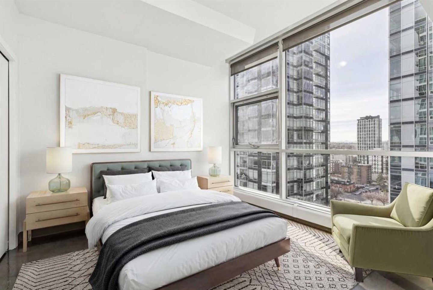 Step into urban living at Colours, where architecture, light, and location come together in all the right ways. This west-facing one bedroom plus den residence delivers a front-row seat to Calgary’s skyline, with sweeping Downtown and Rocky Mountain views showcased through an impressive wall of floor-to-ceiling glass. As the sun sets, the entire space is washed in warm afternoon and evening light—an everyday luxury you’ll never tire of. The open-concept layout is designed for both style and function. The kitchen anchors the home with sleek ebony flat-panel cabinetry, granite countertops, and stainless steel appliances, offering a modern, streamlined aesthetic that pairs perfectly with the building’s industrial edge. Acid-stained polished concrete floors and 9-foot ceilings reinforce the loft-inspired feel, while central air conditioning keeps the space comfortable year-round. The versatile den is ideal for a 2nd bedroom, home office, creative studio, or reading nook—proof that smart design can do more with less. The bedroom enjoys the same west exposure and city outlook, while the contemporary four-piece bathroom, in-suite laundry, and sliding glass door to the window wall complete the interior. A titled underground parking stall adds everyday convenience and long-term value. Colours is known for its bold glass façade and unmistakable presence in the streetscape, reflecting the energy of the neighborhood itself. Located in Victoria Park, you’re surrounded by an eclectic mix of culture, cuisine, and nightlife. From 17th Avenue to the Downtown Core, and from Mission to Inglewood, everything Calgary has to offer is just minutes away. This is more than a condo—it’s a lifestyle defined by views, vibrancy, and walkable city living.