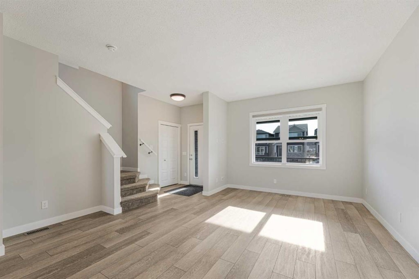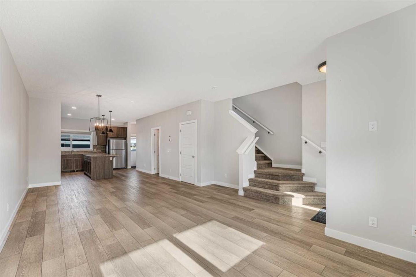 This beautifully designed 1,626 sq. ft. duplex by Shane Homes combines high-end style with everyday functionality in the heart of Pine Creek. Move-in ready, the home features a sun-drenched, open-concept main floor with soaring ceilings, durable LVP flooring, and a stunning kitchen boasting quartz countertops, stainless steel appliances, and a convenient walk-in pantry. A south-facing front veranda invites you inside, while the rear entrance provides easy access to a 2-piece powder room and leads out to your double detached garage. Upstairs you will find a central bonus room, with a large primary bedroom, 3pc ensuite bathroom and a walk-in closet to one side, and two additional bedrooms, a 4pc bathroom and a laundry area on the other side. All bathrooms are finished with quartz countertops and tile flooring. The basement adds incredible value with a separate side entrance and plumbing rough-ins for a future suite. Perfectly situated within walking distance of schools, shopping, and pathway trails, this home also offers quick access to Macleod and Stoney Trails for an effortless commute.