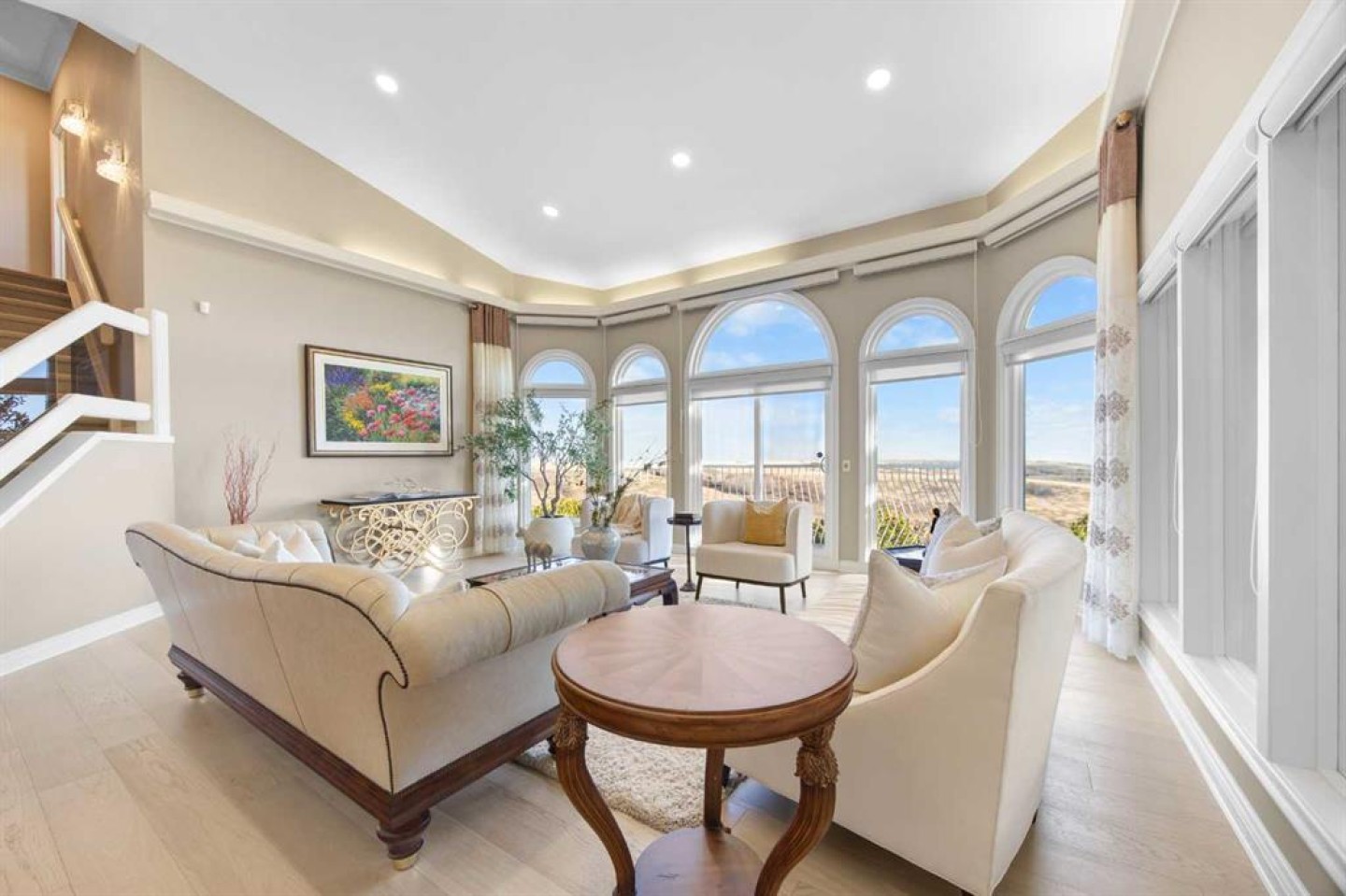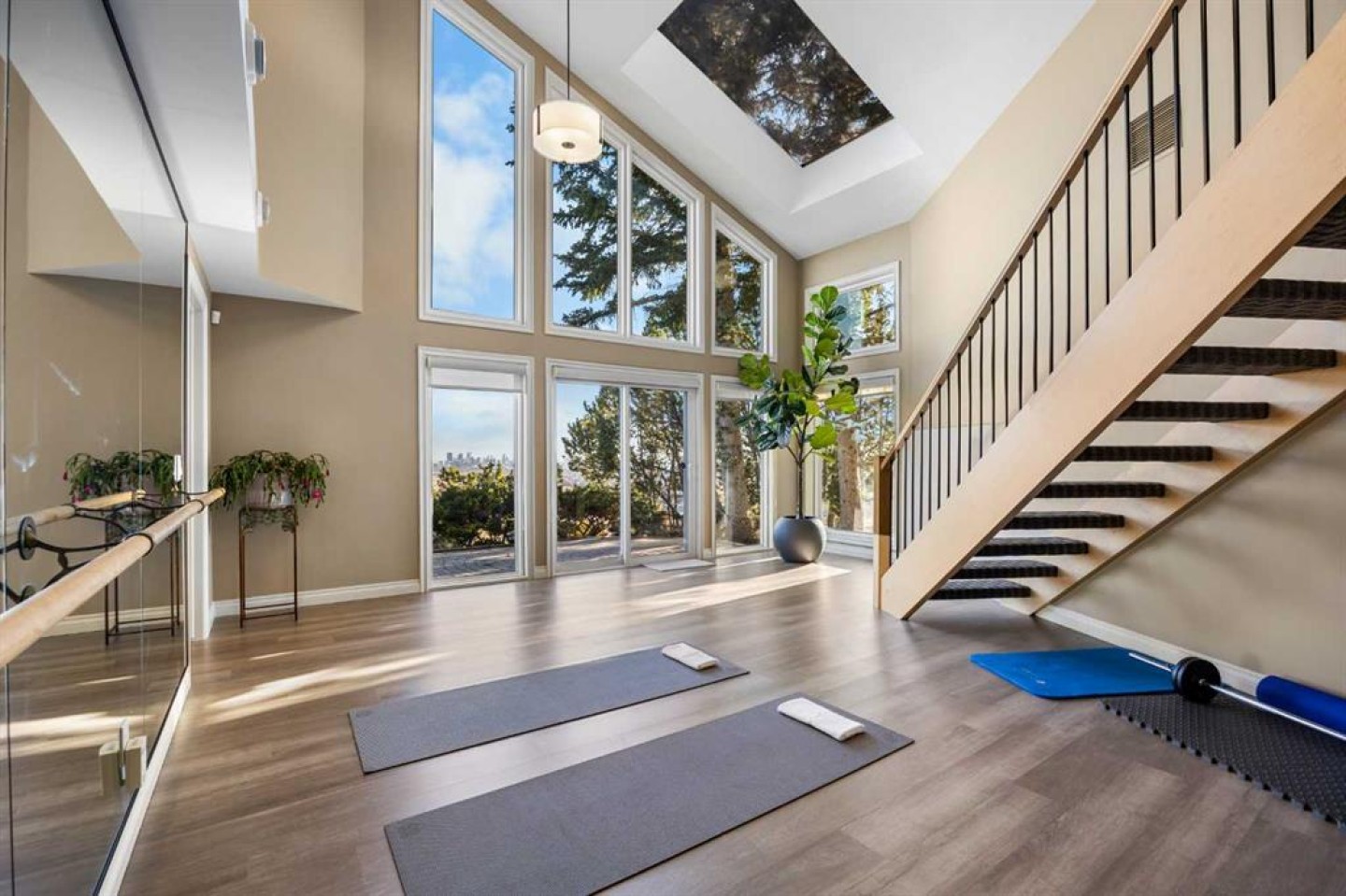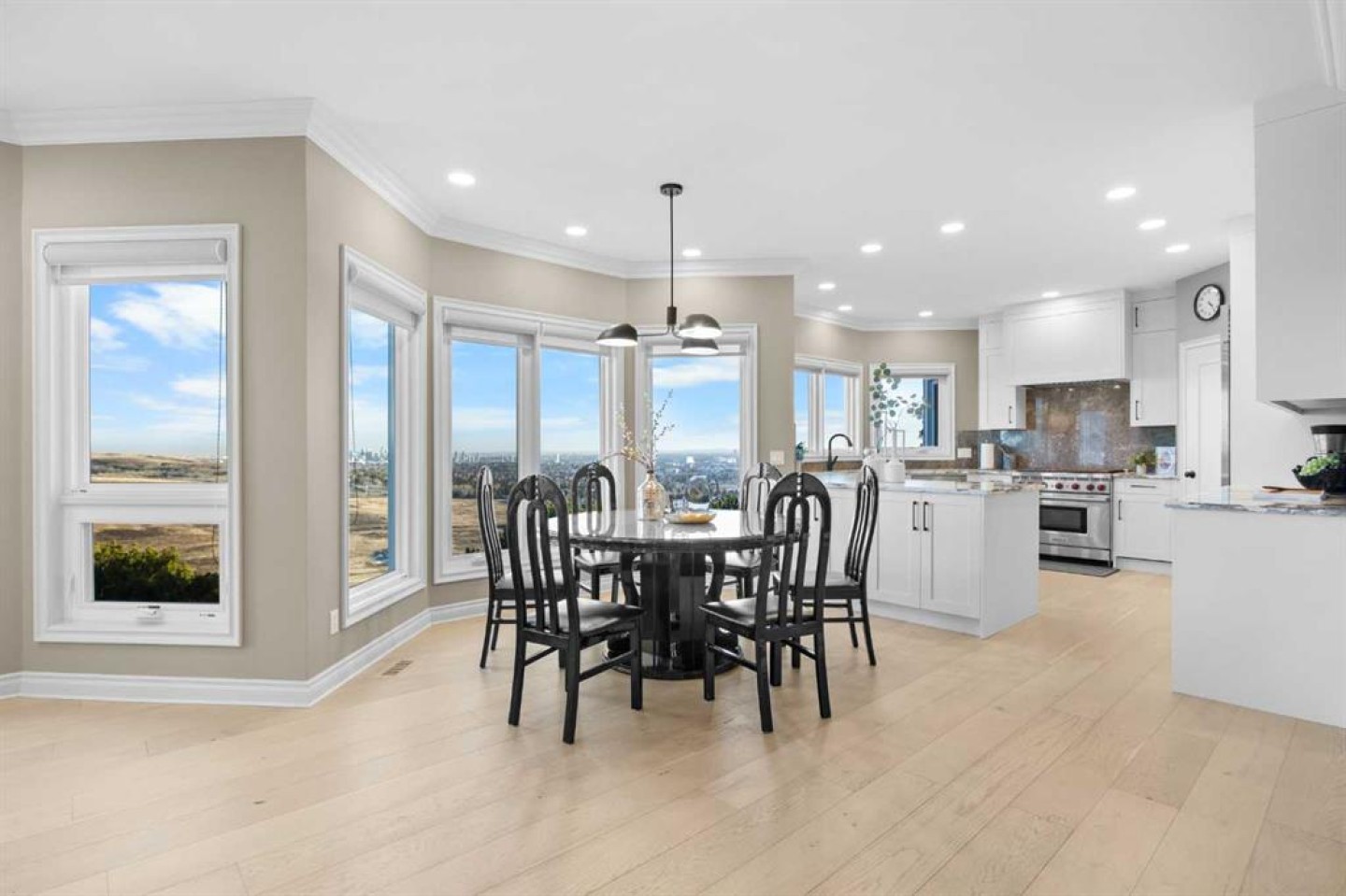 Welcome to the Pinnacle of luxury living at Edelweiss Point, an exclusive hilltop enclave in the prestigious community of Edgemont. This extraordinary 5+2 bedroom, 6 bathroom two-storey walkout estate offers over 6,800 sq ft of refined living space with breathtaking, unobstructed views of Nose Hill Park and Calgary's downtown skyline. Step through double doors to soaring vaulted ceilings and new engineered hardwood flooring throughout the main level, extending into the Living room where walls of windows frame spectacular panoramic views. The Living room opens to a sunny South-East-facing balcony to capture the breathtaking city and sunrise views. A 13-foot ceiling Den with built-in bookcases provides an inspiring workspace. The main level features floor-to-ceiling windows flooding the space with light. The newly renovated white Kitchen boasts quartz countertops, pantry, stainless steel Wolf six-burner gas stove, Sub-Zero fridge, and Bosch dishwasher. The Family room with gas fireplace connected well with the kitchen and Eating Nook, steps out to another Balcony to capture the Views. The elegant formal Dining room features French doors and recessed ceiling. A bedroom with cheater door to 3-piece bath offers guest or office flexibility, and the triple attached garage completes this level. Extensively renovated (2023-2024): all Poly-B are replaced, Navien boiler system, and updated bathroom fixtures. On the upper level, a loft with built-in desk provides versatile space for study. The luxurious Primary bedroom features a cozy seating area with gas-lit fireplace positioned perfectly for enjoying breathtaking views through large windows. The newly renovated 5-piece ensuite bath featuring heated floors, skylight above freestanding soaker tub, separate double vanity, oversized tiled standing shower, and walk-in closet. Three additional well-sized bedrooms complete this level—two share a Jack-and-Jill bathroom, while the other one has a cheater door to another full bath. All upper bathrooms updated (2023-2024). The fully finished walkout basement (2021) with renovated kitchen and bathroom is designed for entertaining and versatile living. A spectacular highlight is the 19-foot vaulted ceiling gym/dance room with skylight and three large mirrors, perfect for fitness enthusiasts, yoga practice, or dance rehearsals. An indoor jacuzzi room and Recreation room offer additional luxury amenities. A full Kitchen with large island, Living room with gas-lit fireplace, Dining area, and 2 bedrooms with 2 full baths complete this exceptional level. Step outside to your South-East-facing backyard backing onto green space with magnificent views of Nose Hill Park and downtown Calgary. Low-maintenance paved patio gardens and mature landscaping, with direct green space access for peaceful walks. Additional highlights include all windows replaced (2012/2013) and 2 decks with new vinyl (2024). Located in prestigious Edgemont—a rare opportunity at Calgary's most coveted hilltop address.