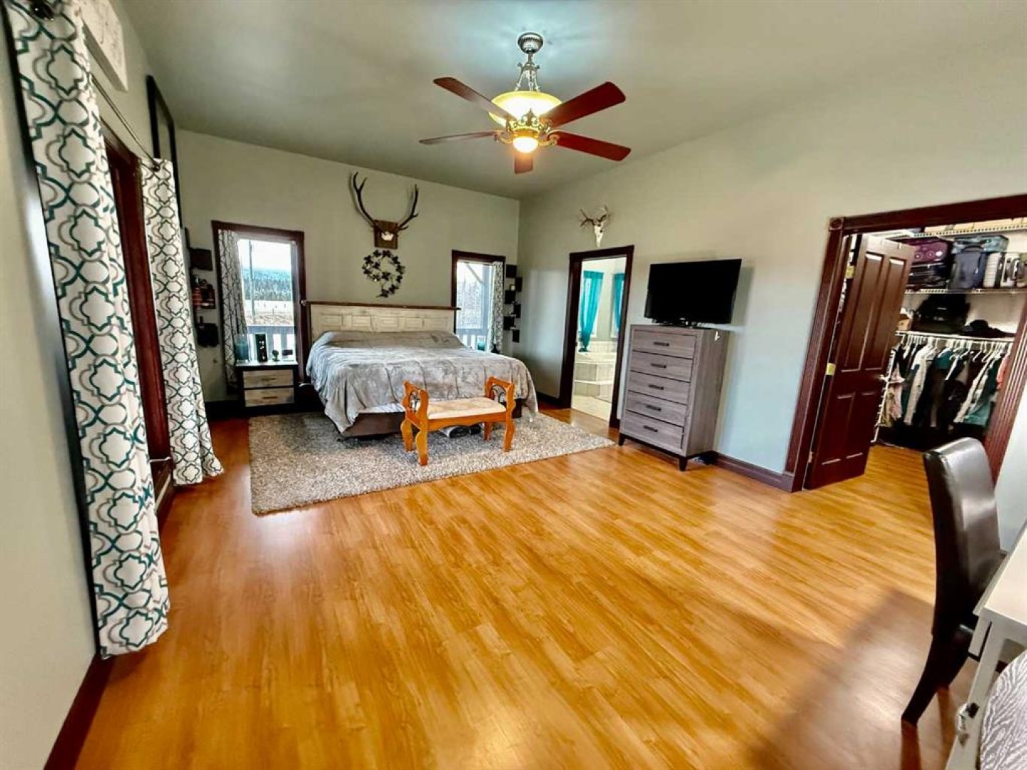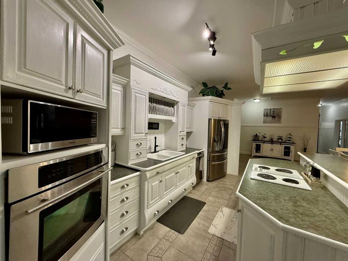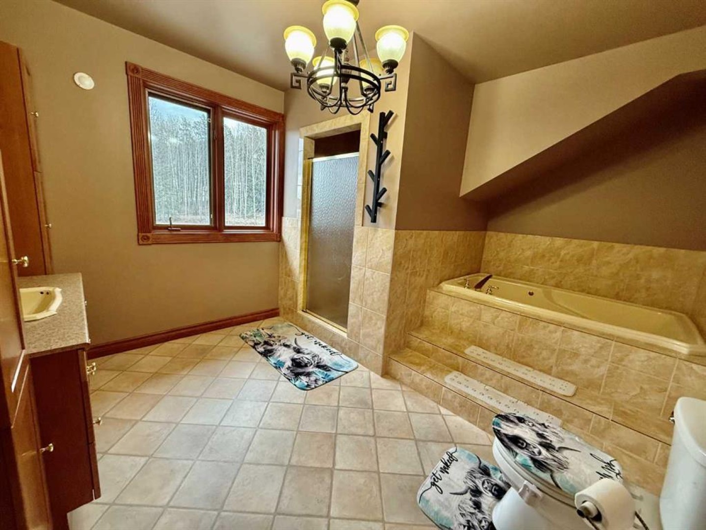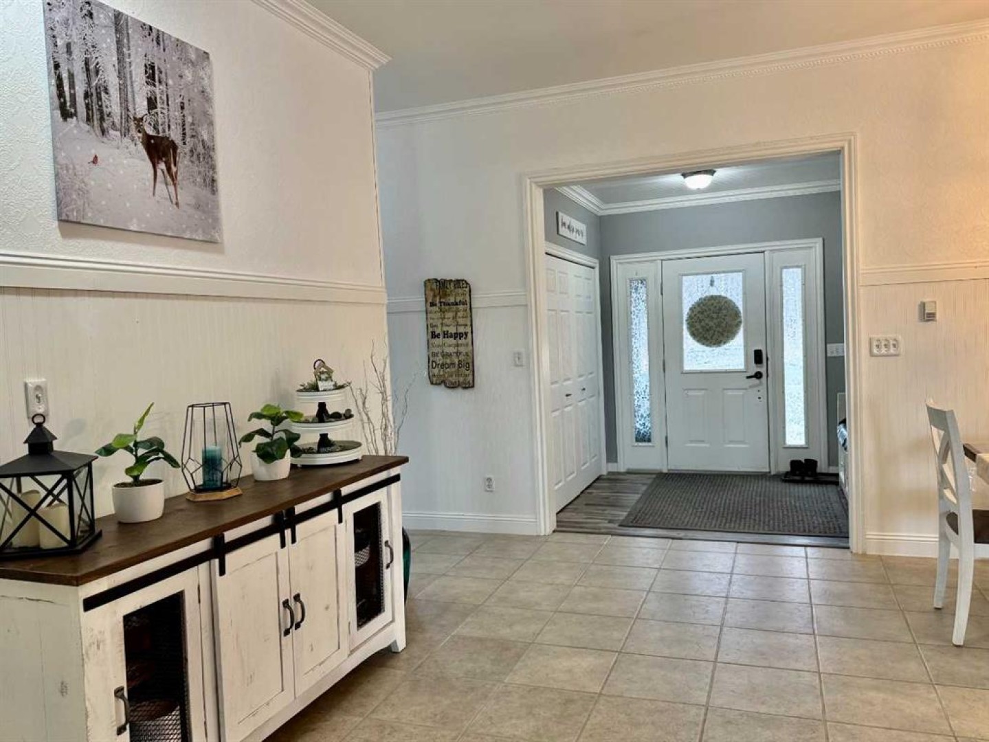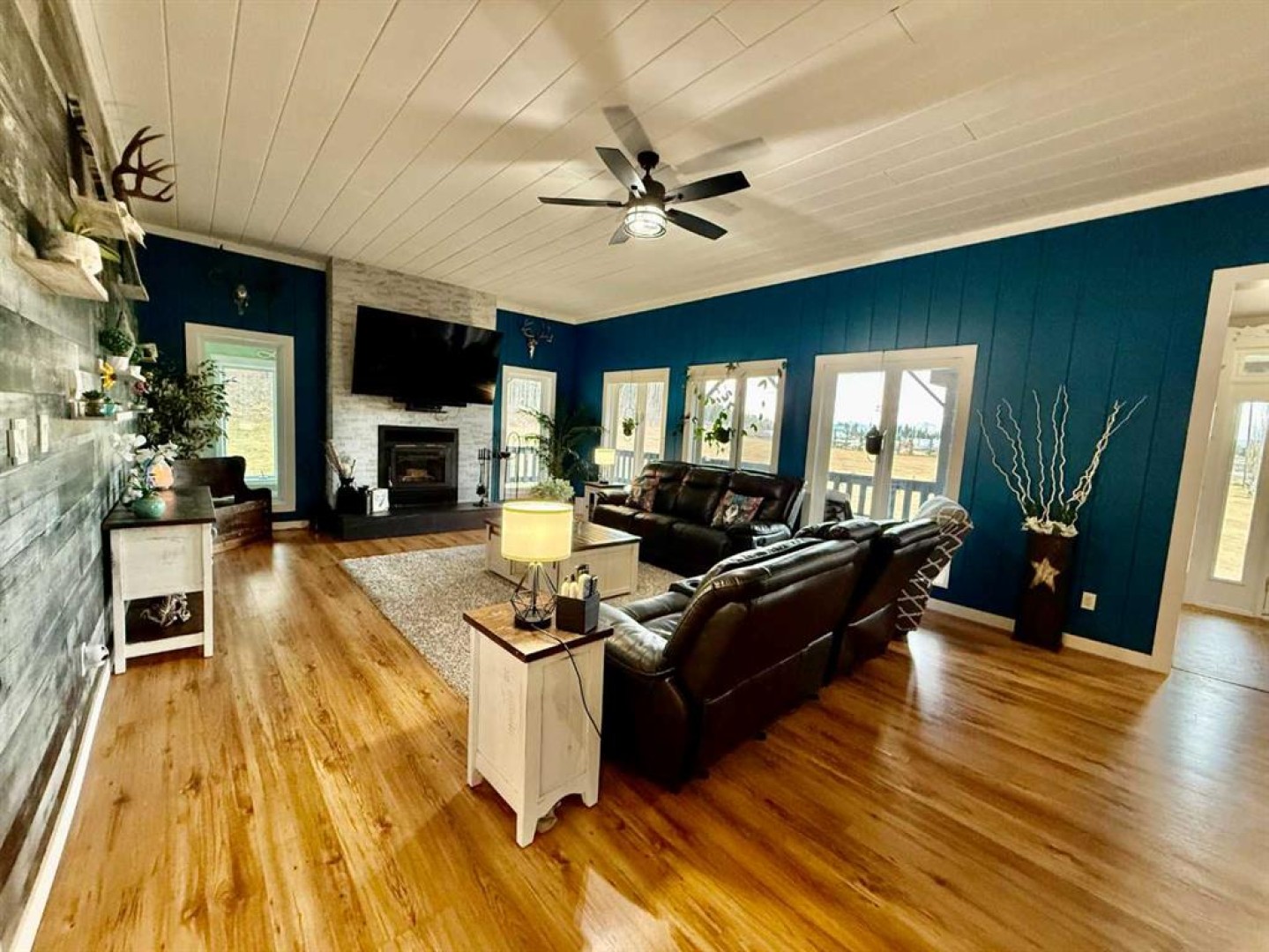 Set on 9.96 private acres surrounded by crown land, this exceptional 5,412 sq. ft. estate offers the perfect blend of luxury, functionality, and breathtaking mountain views. With a stunning 1,688 sq. ft. wrap-around deck, this property is designed to embrace its peaceful setting and expansive surroundings. The versatile zoning allows for a variety of uses, making this acreage as practical as it is beautiful. Step inside through the east entrance and you’re welcomed by an impressive sense of space. The expansive dining area flows seamlessly into the thoughtfully designed kitchen, featuring tile flooring, an eating bar, updated fridge and wall oven, walk-in pantry, and soaring 10 ft. ceilings. Just off the kitchen, the 3-season sunroom—roughed in for electric heat—offers the perfect place to unwind while enjoying the views. The living room showcases detailed custom trim work, a cozy wood stove, and large west-facing windows that frame stunning mountain vistas. The primary suite is a private retreat, complete with a walk-in closet and luxurious ensuite. The main floor also includes a full bathroom, spacious laundry room, and additional walk-in pantry for added convenience. Upstairs, you’ll find two oversized bedrooms (with a framed doorway to easily convert into three), along with a beautifully appointed bathroom featuring a soaker tub and walk-in shower—an ideal space for children or guests. The fully developed basement offers 9 ft. ceilings, a generous family room, two additional bedrooms, a 3-piece bathroom with updated sink and vanity, a second kitchen, new flooring throughout, and a utility room—perfect for extended family or added flexibility. Comfort is paramount with in-floor heating on every level, controlled by seven separate zones for customized climate control. Outdoors, the property continues to impress with stamped concrete walkways, a greenhouse, partial fencing with secure gates, and a heated 28' x 36' shop complete with mezzanine, cold room, and roughed-in in-floor heat. An additional hay shed with seacan storage on either side adds even more utility to this remarkable acreage. This is a rare opportunity to own a private mountain-view estate that truly has it all.