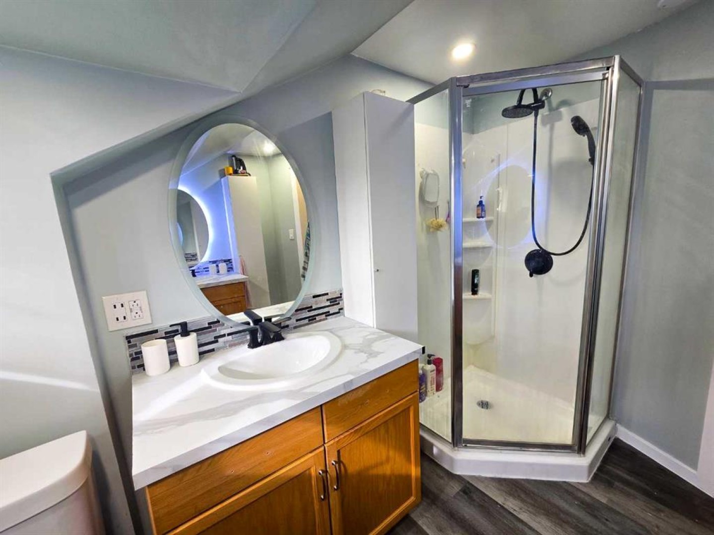 Bookcases, Breakfast Bar, Ceiling Fan(s), Central Vacuum, Double Vanity, Kitchen Island, Natural Woodwork, Primary Downstairs, Storage, Sump Pump(s)