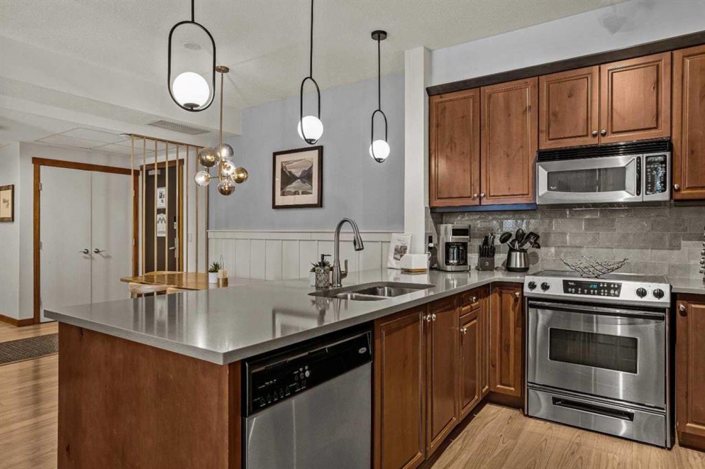 One of Canmore’s most sought after hotel complexes, Blackstone Mountain Lodge offers impressive revenue potential and an ideal family mountain retreat. Step into a stylish main living area featuring a fully equipped kitchen with a large eating bar and a separate dining area, ideal for entertaining or relaxing after a day in the mountains. The thoughtful layout offers excellent privacy, with two spacious bedrooms and direct access to a spacious south facing balcony. Guests will appreciate the convenience of two full four piece bathrooms, generous in suite storage including an owner’s closet, and in suite laundry. Over $50,000 has been invested in recent renovations and furnishing upgrades, enhancing both comfort and rental appeal. Blackstone Mountain Lodge amenities elevate the experience with a heated outdoor pool, hot tubs, fitness facility, fire tables, BBQ station, and secure underground parking with an electric vehicle charging station. Zoning permits short term nightly rentals, maximizing investment potential. Canmore’s reputation as a year round destination ensures consistent demand, with shops, restaurants, spas, gyms, public transit, hiking, and biking trails all within walking distance. LIST PRICE INCLUDES GST. CONSULT YOUR ACCOUNTANT ABOUT DEFERRING GST.