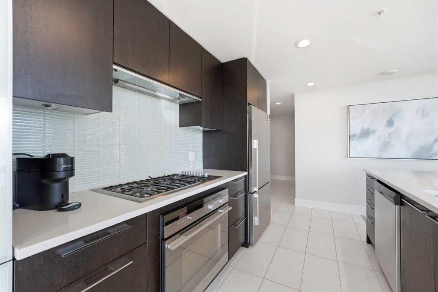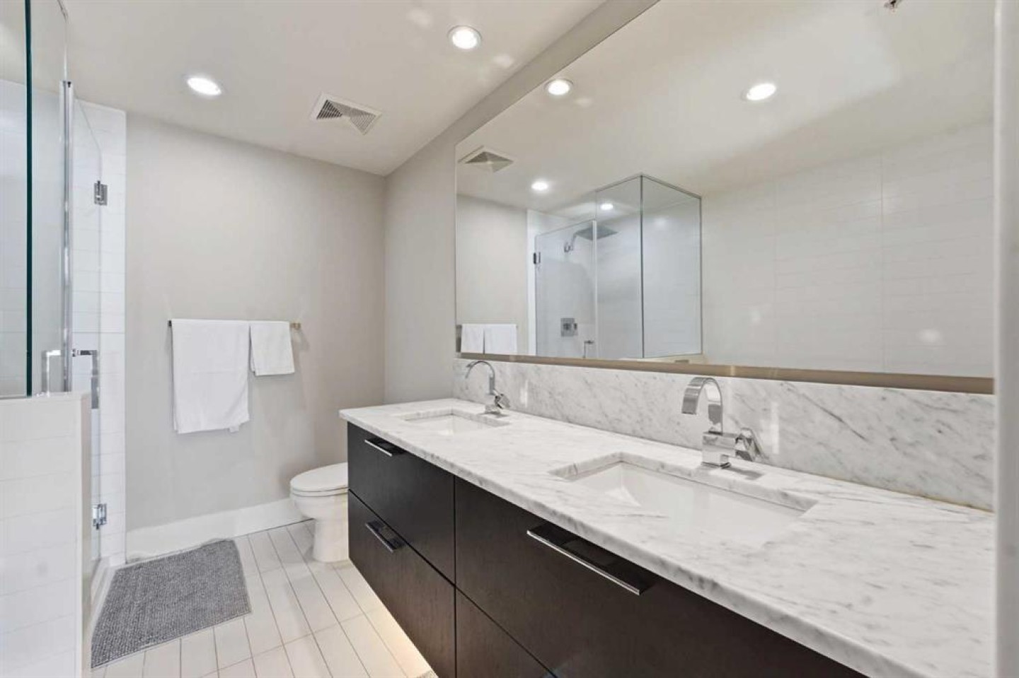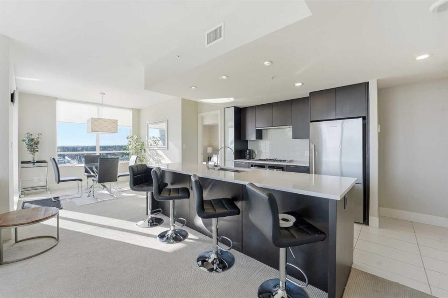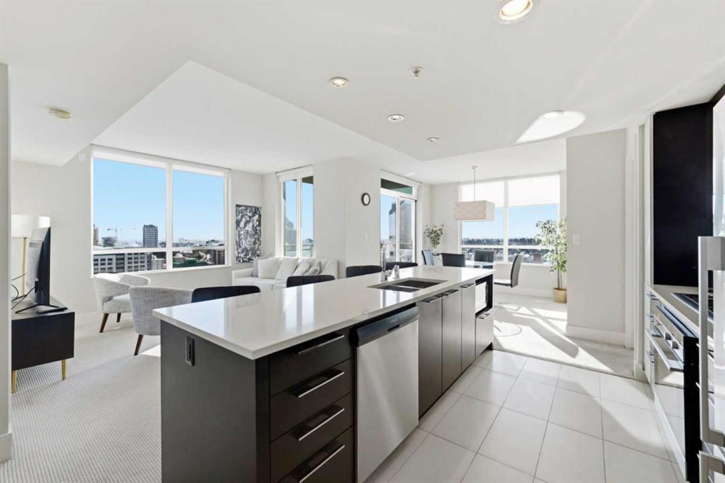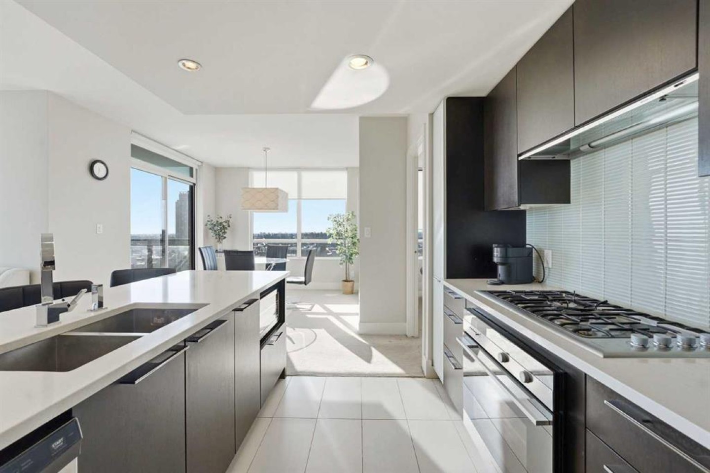 Elevate your lifestyle in this stunning 19th-floor corner unit at the prestigious LUNA. Drenched in natural light from South and East-facing floor-to-ceiling windows, this 967 sq. ft. sanctuary offers breathtaking skyline and mountain views from every angle. The open-concept floor plan is an entertainer’s dream. The gourmet kitchen features a massive quartz island, full-height cabinetry, and a premium 5-burner gas range. Retreat to a primary suite that rivals a five-star hotel, boasting a walk-through closet and a spa-like 5-piece ensuite with a deep soaker tub and heated floors. A second bedroom with its own private 3-piece ensuite ensures total privacy for guests or a home office. Building amenities include a YOGA Studio, an Owner's Lounge with a pool table and kitchen (Great for Birthdays and Hockey Games), underground parking and a large STORAGE ROOM. The building has 2 guests suites for those times your family comes to town for a visit.
