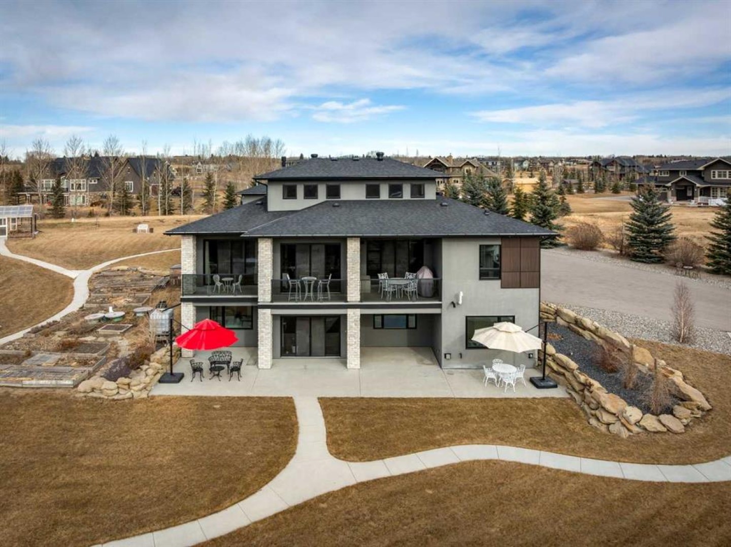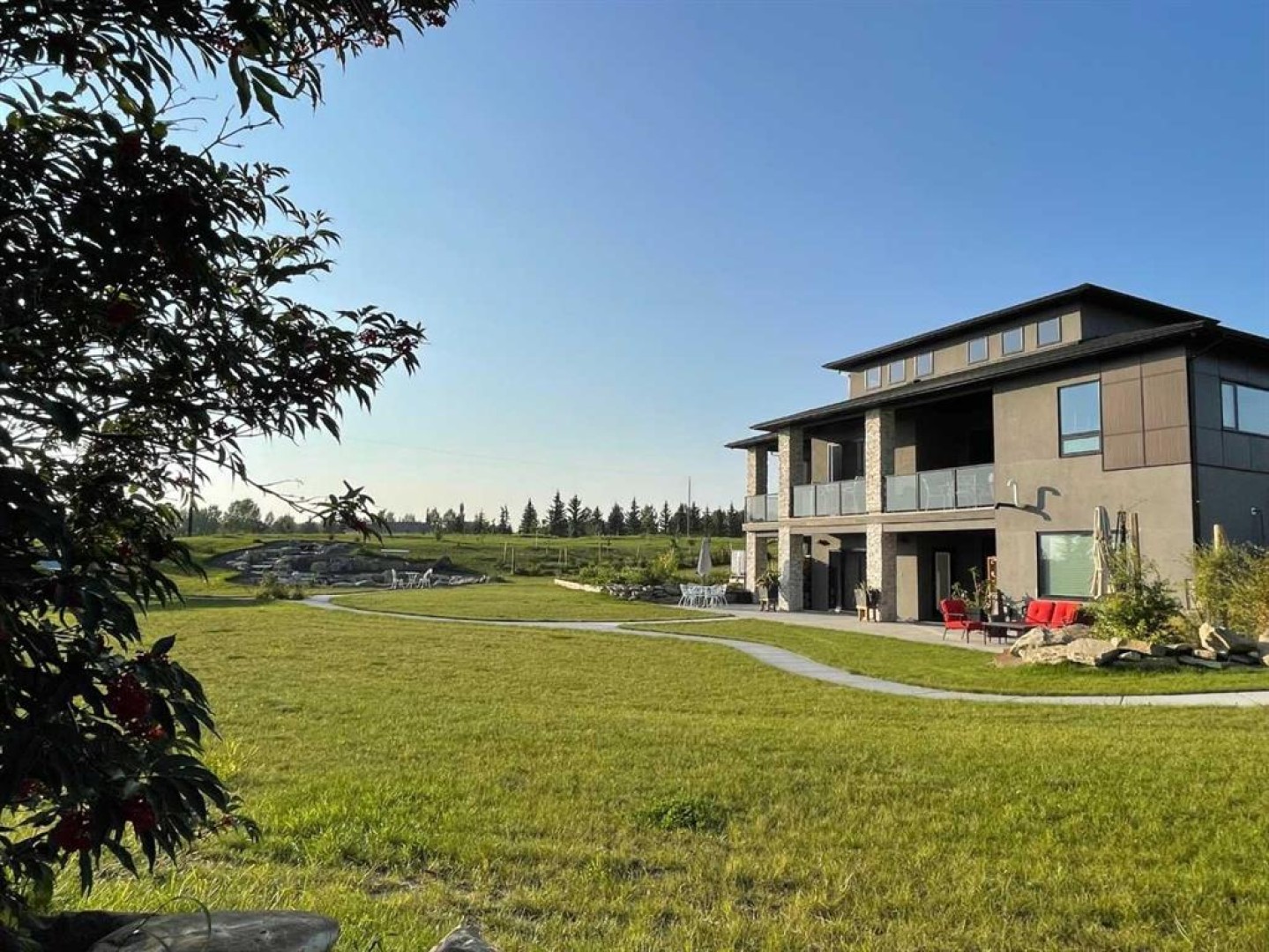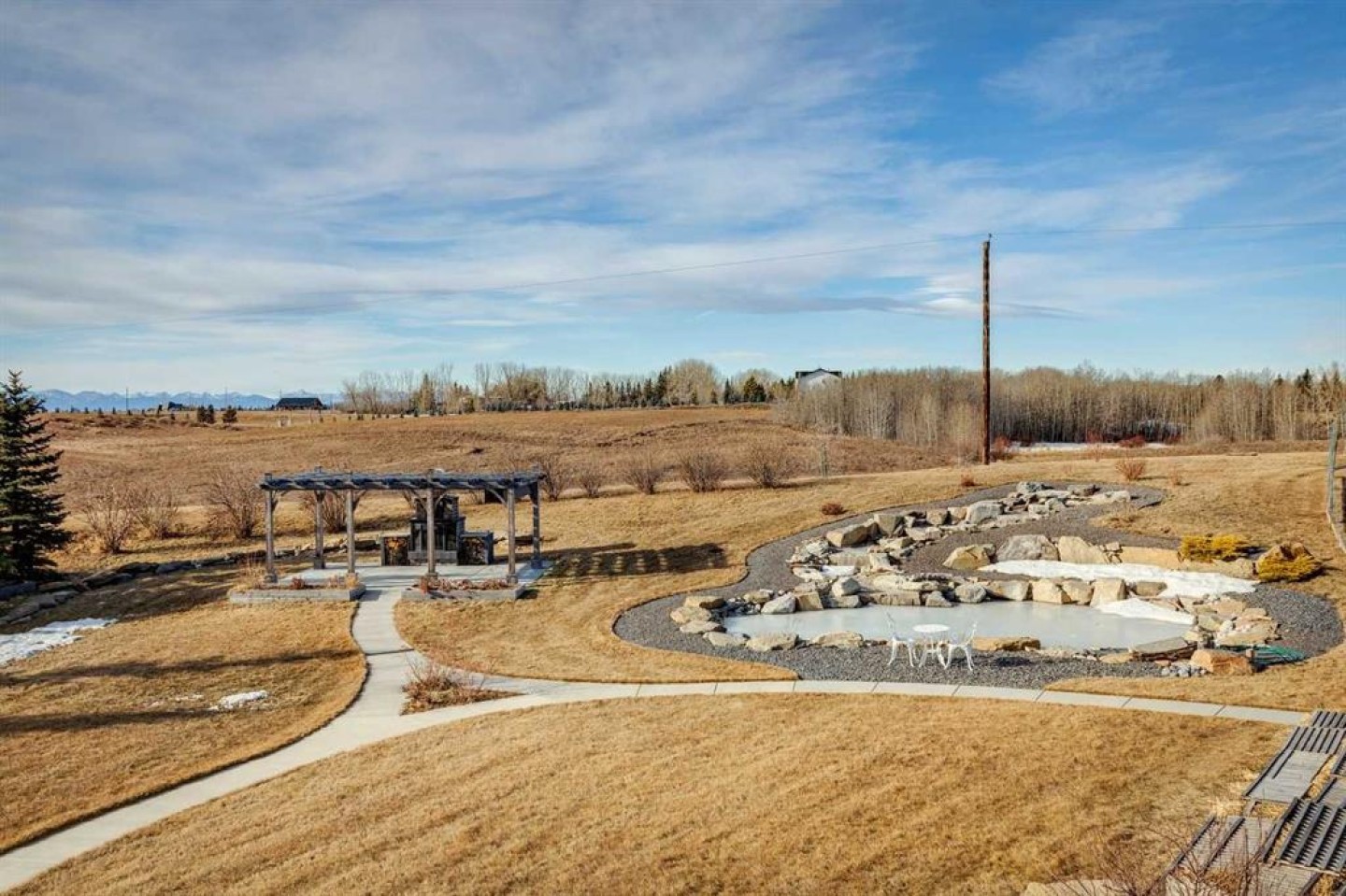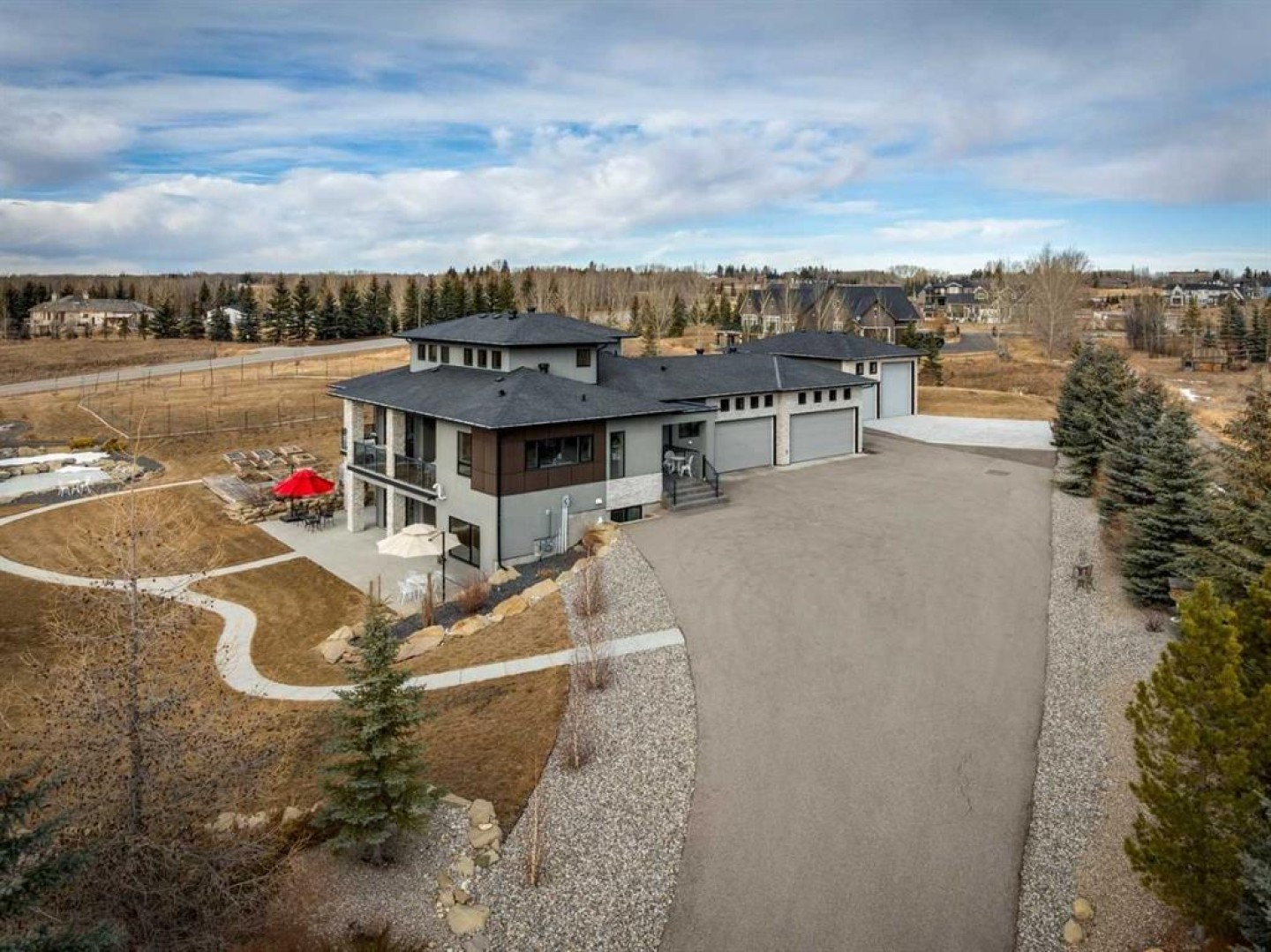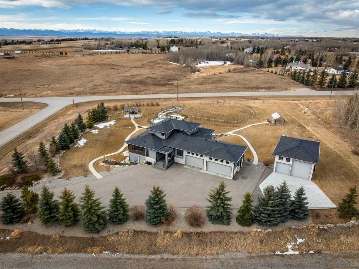 Set on 2 beautifully landscaped acres, this exceptional country residential estate offers a rare blend of luxury construction, high-end mechanical systems, & thoughtfully designed outdoor living, all just 20 minutes from downtown Calgary w/ quick access west to the mountains & positioned to capture breathtaking mountain views, including views enjoyed directly from your kitchen & dining table. The professionally landscaped grounds (completed 4 yrs ago for $110,000) showcase a stunning waterfall feature, rock garden, expansive garden beds, mature fruit orchard w/ apple, cherry, plum, & pear trees, plus saskatoons & raspberries, along w/ a greenhouse & an exterior wood-burning fireplace seating area under a pergola w/ sunshade, all connected by concrete pathways for enhanced accessibility. The property also offers room to park 6 vehicles inside plus an exceptional amount of additional exterior parking, ideal for guests, recreational vehicles, & equipment. The home itself is flooded w/ natural light through extensive windows & features 10-foot ceilings w/ vaulted ceilings in the main living area, solid core interior doors throughout, oak hardwood flooring, in-floor heat, air conditioning (new in 2024 for $10,000), a 2-zone furnace, boiler, & new windows and insulation added in 2025 ($50,000) for improved energy efficiency, w/ the entire home professionally repainted in 2024. The main level offers 2 bedrooms & 2 full bathrooms w/ quartz countertops throughout, including a luxurious primary retreat w/ mountain views, a large walk-in closet w/ built-in shelving, & an elegant ensuite w/ dual sinks, custom tiled shower, & jetted tub, while the living room is anchored by a gas fireplace w/ an oversized tiled feature wall. The chef-inspired kitchen is finished w/ quartz countertops, ceiling-height soft-close cabinetry, under-cabinet lighting, a 5-burner gas stove, in-wall oven, Bosch dishwasher, prep sink, large island, & a spacious walk-in pantry, complemented by a functional mudroom w/ sink & secondary laundry hook-up. The fully developed walk-out basement features a 2nd primary suite w/ covered patio access, dual sinks, quartz counters, tile flooring, oversized tiled shower, jetted tub, & a large custom walk-in closet, plus 2 additional bedrooms (3 total in the basement), a full bathroom w/ steam shower, bench seating, & quartz counters, a wine room, basement laundry w/ shelving, cupboards, & a 2024 dryer, & an expansive recreation space complete w/ surround sound, gas fireplace, & a wet bar w/ quartz counters & light that changes colour. Multiple covered balconies include 2 gas BBQ hook-ups & exterior Bluetooth speakers. The attached quad garage is insulated, drywalled, features 12-foot ceilings, & includes an EV charging panel (charger excluded), while the detached RV shop ($110,000) offers 24x36 dimensions, 14-foot ceilings, a 12-foot RV door, loft, 100-amp service, & 220V power, making this property an exceptional offering in a prestigious price category.