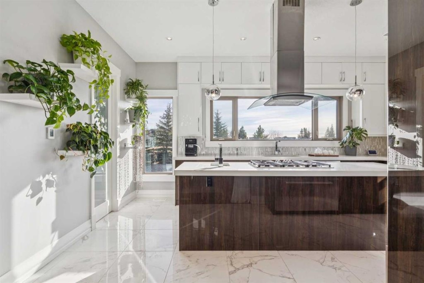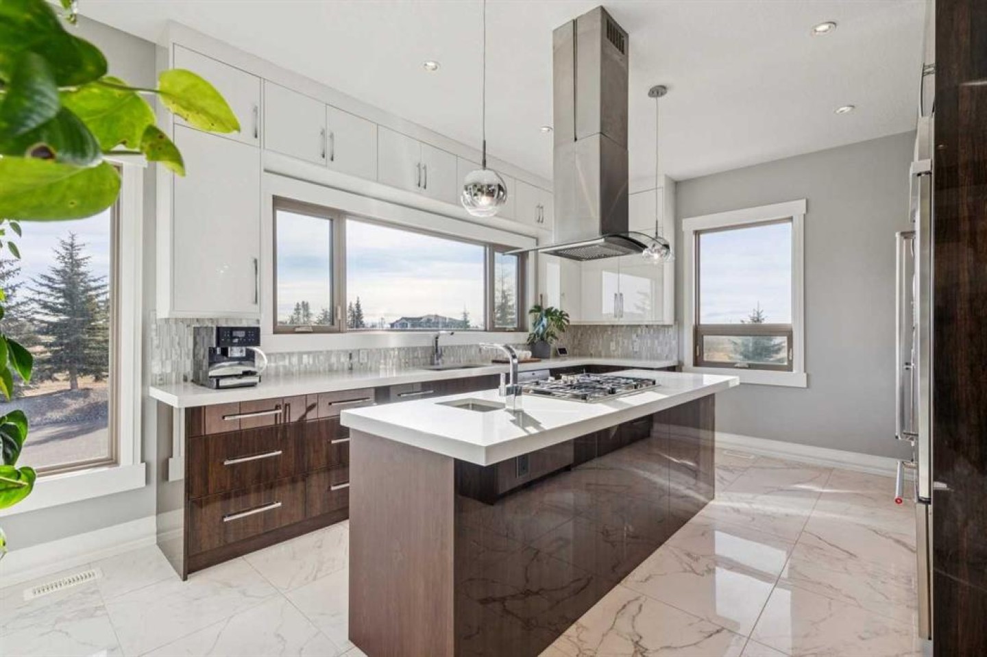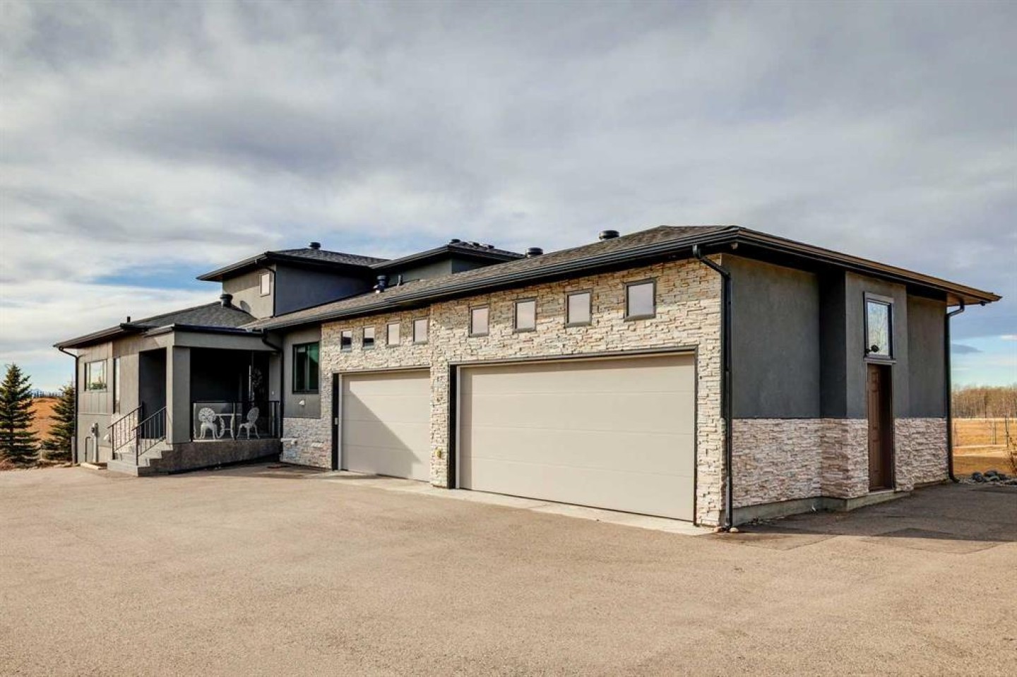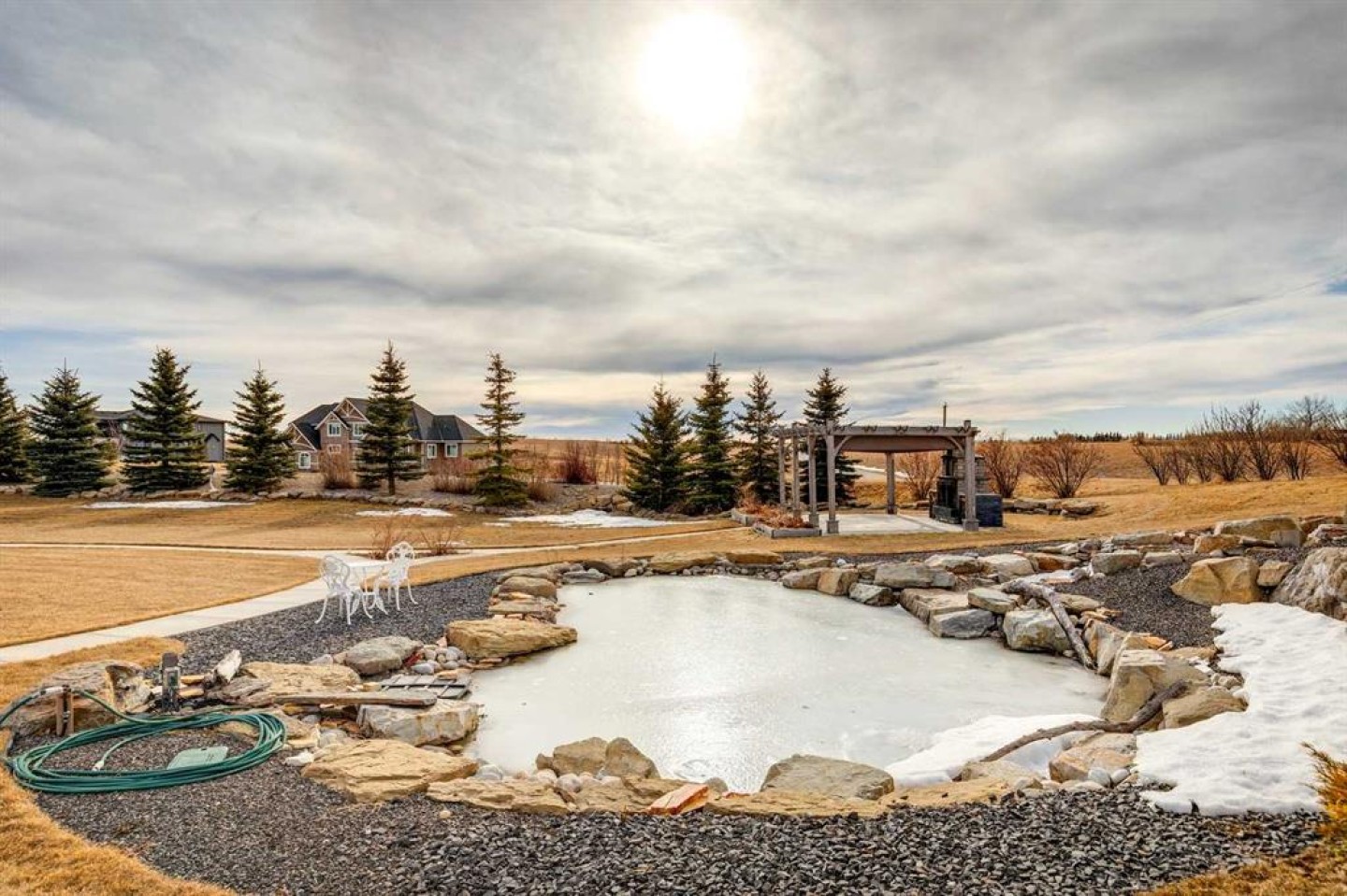 Set on 2 beautifully landscaped acres, this exceptional country residential estate offers a rare blend of luxury construction, high-end mechanical systems, & thoughtfully designed outdoor living, all just 20 minutes from downtown Calgary w/ quick access west to the mountains & positioned to capture breathtaking mountain views, including views enjoyed directly from your kitchen & dining table. The professionally landscaped grounds (completed 4 yrs ago for $110,000) showcase a stunning waterfall feature, rock garden, expansive garden beds, mature fruit orchard w/ apple, cherry, plum, & pear trees, plus saskatoons & raspberries, along w/ a greenhouse & an exterior wood-burning fireplace seating area under a pergola w/ sunshade, all connected by concrete pathways for enhanced accessibility. The property also offers room to park 6 vehicles inside plus an exceptional amount of additional exterior parking, ideal for guests, recreational vehicles, & equipment. The home itself is flooded w/ natural light through extensive windows & features 10-foot ceilings w/ vaulted ceilings in the main living area, solid core interior doors throughout, oak hardwood flooring, in-floor heat, air conditioning (new in 2024 for $10,000), a 2-zone furnace, boiler, & new windows and insulation added in 2025 ($50,000) for improved energy efficiency, w/ the entire home professionally repainted in 2024. The main level offers 2 bedrooms & 2 full bathrooms w/ quartz countertops throughout, including a luxurious primary retreat w/ mountain views, a large walk-in closet w/ built-in shelving, & an elegant ensuite w/ dual sinks, custom tiled shower, & jetted tub, while the living room is anchored by a gas fireplace w/ an oversized tiled feature wall. The chef-inspired kitchen is finished w/ quartz countertops, ceiling-height soft-close cabinetry, under-cabinet lighting, a 5-burner gas stove, in-wall oven, Bosch dishwasher, prep sink, large island, & a spacious walk-in pantry, complemented by a functional mudroom w/ sink & secondary laundry hook-up. The fully developed walk-out basement features a 2nd primary suite w/ covered patio access, dual sinks, quartz counters, tile flooring, oversized tiled shower, jetted tub, & a large custom walk-in closet, plus 2 additional bedrooms (3 total in the basement), a full bathroom w/ steam shower, bench seating, & quartz counters, a wine room, basement laundry w/ shelving, cupboards, & a 2024 dryer, & an expansive recreation space complete w/ surround sound, gas fireplace, & a wet bar w/ quartz counters & light that changes colour. Multiple covered balconies include 2 gas BBQ hook-ups & exterior Bluetooth speakers. The attached quad garage is insulated, drywalled, features 12-foot ceilings, & includes an EV charging panel (charger excluded), while the detached RV shop ($110,000) offers 24x36 dimensions, 14-foot ceilings, a 12-foot RV door, loft, 100-amp service, & 220V power, making this property an exceptional offering in a prestigious price category.