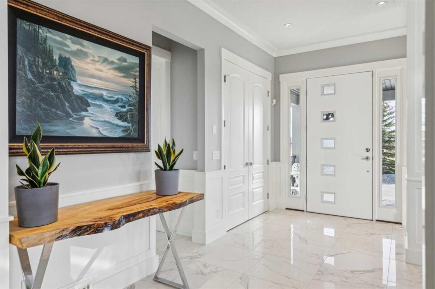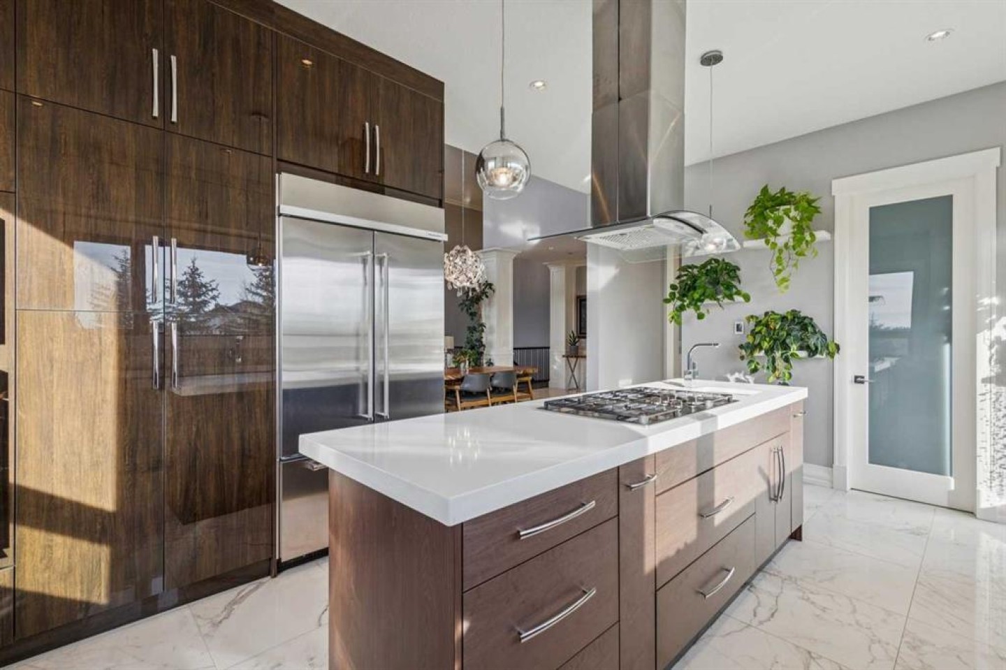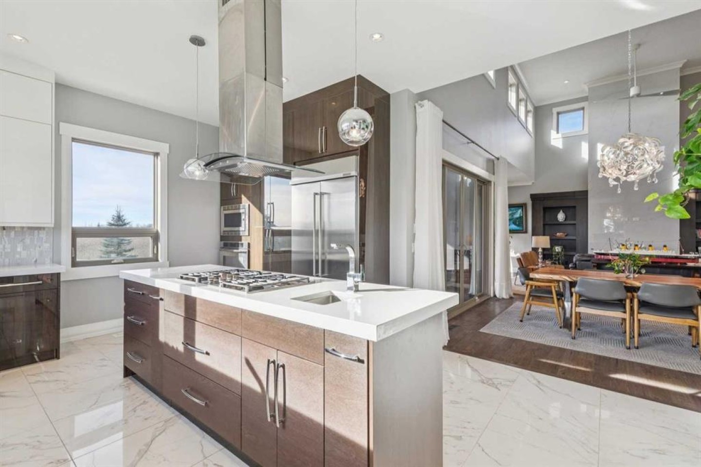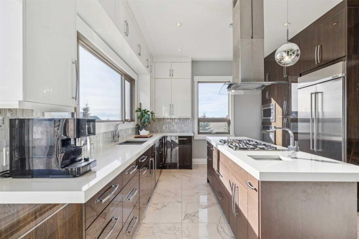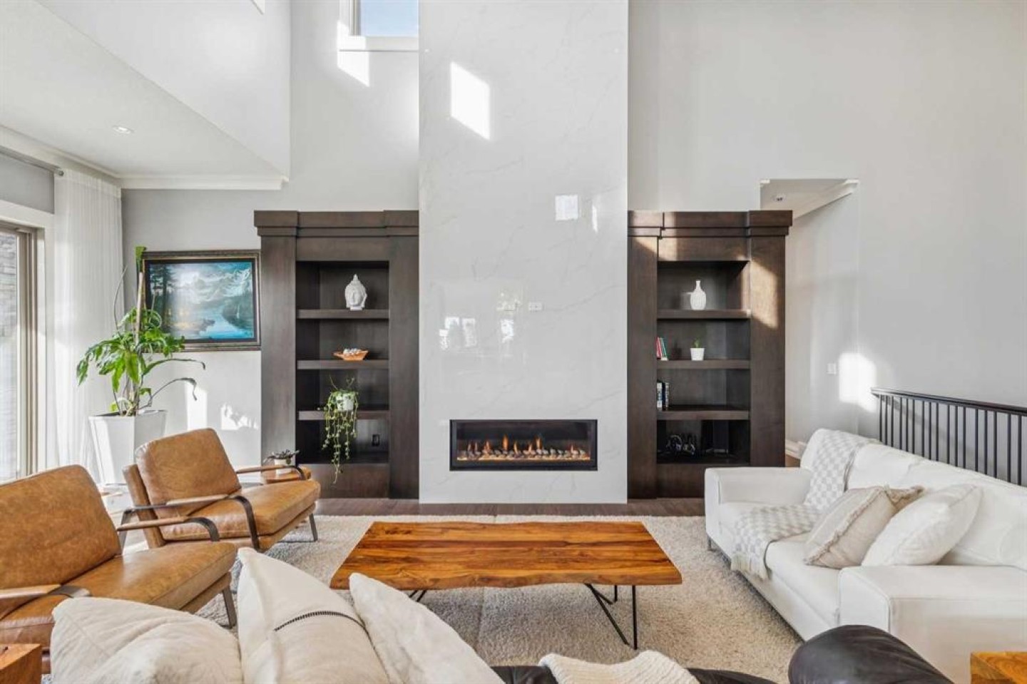 Set on 2 beautifully landscaped acres, this exceptional country residential estate offers a rare blend of luxury construction, high-end mechanical systems, & thoughtfully designed outdoor living, all just 20 minutes from downtown Calgary w/ quick access west to the mountains & positioned to capture breathtaking mountain views, including views enjoyed directly from your kitchen & dining table. The professionally landscaped grounds (completed 4 yrs ago for $110,000) showcase a stunning waterfall feature, rock garden, expansive garden beds, mature fruit orchard w/ apple, cherry, plum, & pear trees, plus saskatoons & raspberries, along w/ a greenhouse & an exterior wood-burning fireplace seating area under a pergola w/ sunshade, all connected by concrete pathways for enhanced accessibility. The property also offers room to park 6 vehicles inside plus an exceptional amount of additional exterior parking, ideal for guests, recreational vehicles, & equipment. The home itself is flooded w/ natural light through extensive windows & features 10-foot ceilings w/ vaulted ceilings in the main living area, solid core interior doors throughout, oak hardwood flooring, in-floor heat, air conditioning (new in 2024 for $10,000), a 2-zone furnace, boiler, & new windows and insulation added in 2025 ($50,000) for improved energy efficiency, w/ the entire home professionally repainted in 2024. The main level offers 2 bedrooms & 2 full bathrooms w/ quartz countertops throughout, including a luxurious primary retreat w/ mountain views, a large walk-in closet w/ built-in shelving, & an elegant ensuite w/ dual sinks, custom tiled shower, & jetted tub, while the living room is anchored by a gas fireplace w/ an oversized tiled feature wall. The chef-inspired kitchen is finished w/ quartz countertops, ceiling-height soft-close cabinetry, under-cabinet lighting, a 5-burner gas stove, in-wall oven, Bosch dishwasher, prep sink, large island, & a spacious walk-in pantry, complemented by a functional mudroom w/ sink & secondary laundry hook-up. The fully developed walk-out basement features a 2nd primary suite w/ covered patio access, dual sinks, quartz counters, tile flooring, oversized tiled shower, jetted tub, & a large custom walk-in closet, plus 2 additional bedrooms (3 total in the basement), a full bathroom w/ steam shower, bench seating, & quartz counters, a wine room, basement laundry w/ shelving, cupboards, & a 2024 dryer, & an expansive recreation space complete w/ surround sound, gas fireplace, & a wet bar w/ quartz counters & light that changes colour. Multiple covered balconies include 2 gas BBQ hook-ups & exterior Bluetooth speakers. The attached quad garage is insulated, drywalled, features 12-foot ceilings, & includes an EV charging panel (charger excluded), while the detached RV shop ($110,000) offers 24x36 dimensions, 14-foot ceilings, a 12-foot RV door, loft, 100-amp service, & 220V power, making this property an exceptional offering in a prestigious price category.