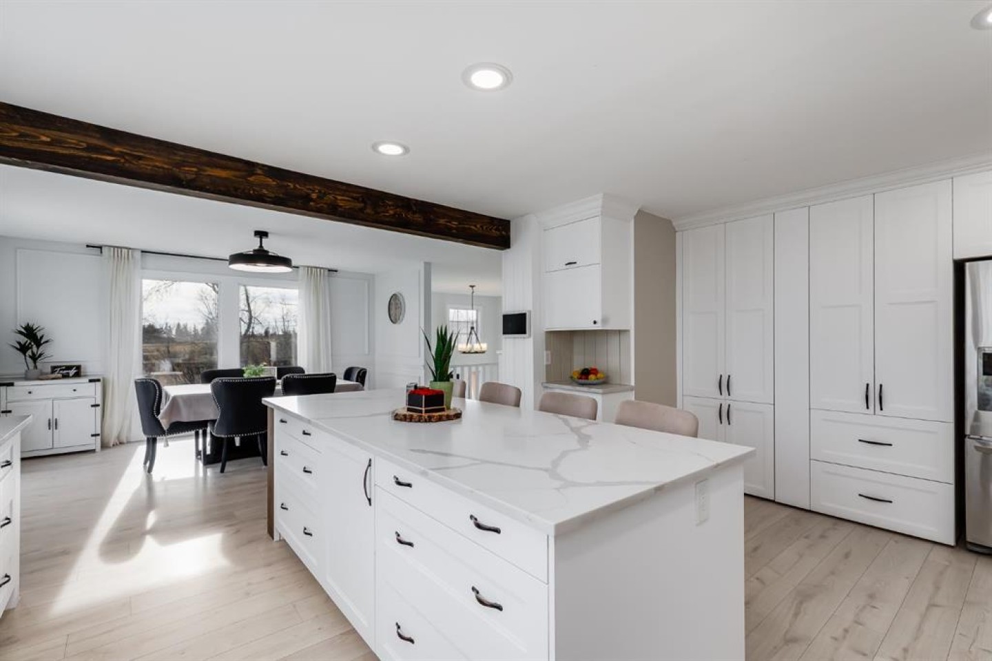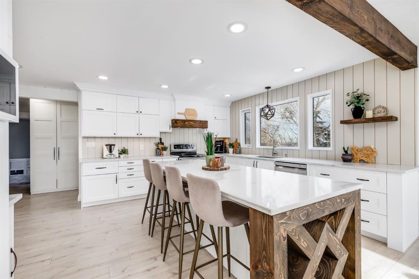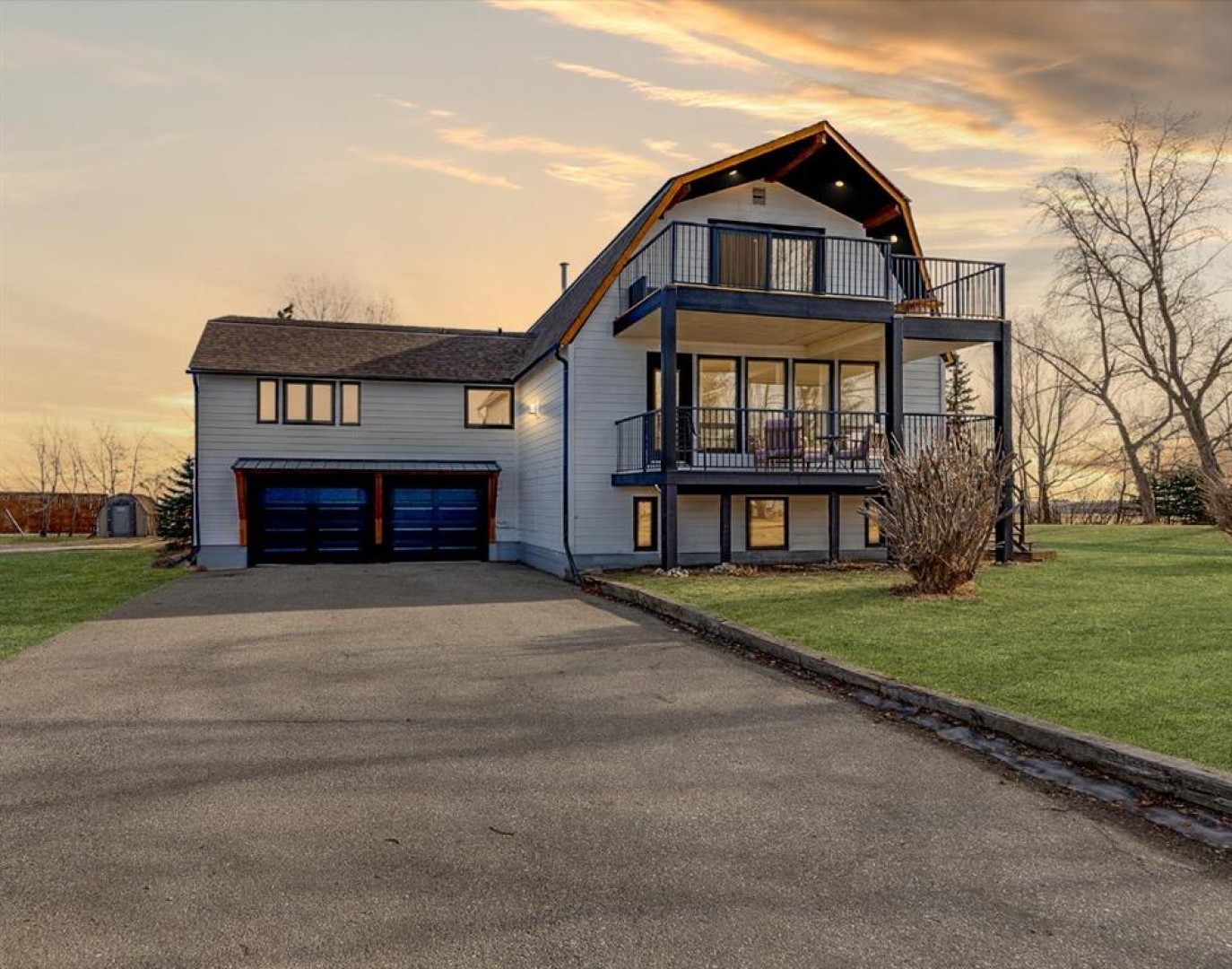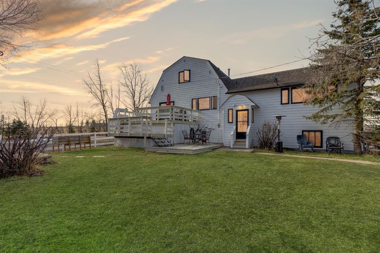 Welcome to acreage living done right. Where space, upgrades, and lifestyle come together just 6 minutes from Okotoks. Set on 3.11 acres with sweeping west-facing views, this striking two-storey gambrel-style home offers over 4,000 sq. ft. of fully developed living space, completely refreshed from top to bottom. This is not a cosmetic update; it’s a full transformation designed for modern country living. From the moment you arrive, the curb appeal makes a statement. The exterior has been freshly repainted and enhanced with new timber-frame accents, a new front entry door, and new black frame windows setting the tone for the quality and care found throughout the home. Step inside and everything feels new. The home features new windows, new flooring and carpet, new interior doors, and fresh paint throughout. The layout remains warm and family-friendly while delivering a clean, contemporary finish that feels both polished and inviting. At the heart of the home is the brand-new kitchen, complete with quartz countertops, updated cabinetry, and generous prep space; perfect for entertaining or everyday life. The adjoining dining and living areas are filled with natural light and designed to capture the peaceful surroundings and wide-open views. The home offers four spacious bedrooms and four bathrooms, including two four-piece baths (one with in-floor heating), a three-piece bath, and a convenient powder room; ideal for families, guests, or multi-generational living. The fully developed lower level adds even more flexibility, whether you envision a media room, home gym, or guest retreat or a mortgage helper with a full suite. Comfort and efficiency were clearly prioritized. The home is equipped with three furnaces providing separate zoning for each level, two central air conditioning units serving the main and upper floors, an upgraded electrical panel, a new gas hot water tank, and a Nest smart thermostat. A new washer and dryer on the upper level add everyday convenience. Outside, multiple decks invite you to enjoy breathtaking sunsets and the serenity of acreage living. The land offers room to garden, keep animals, or simply enjoy the privacy and open space. A large barn and fully equipped chicken coop make this property ideal for hobby farming or animal lovers. Located just minutes from Okotoks, this property delivers the rare combination of rural tranquility and quick access to schools, shopping, dining, and recreation. This is more than a home. It’s a turnkey acreage lifestyle, thoughtfully upgraded and ready to be enjoyed. Opportunities like this don’t come along often. This one is ready for its next chapter.