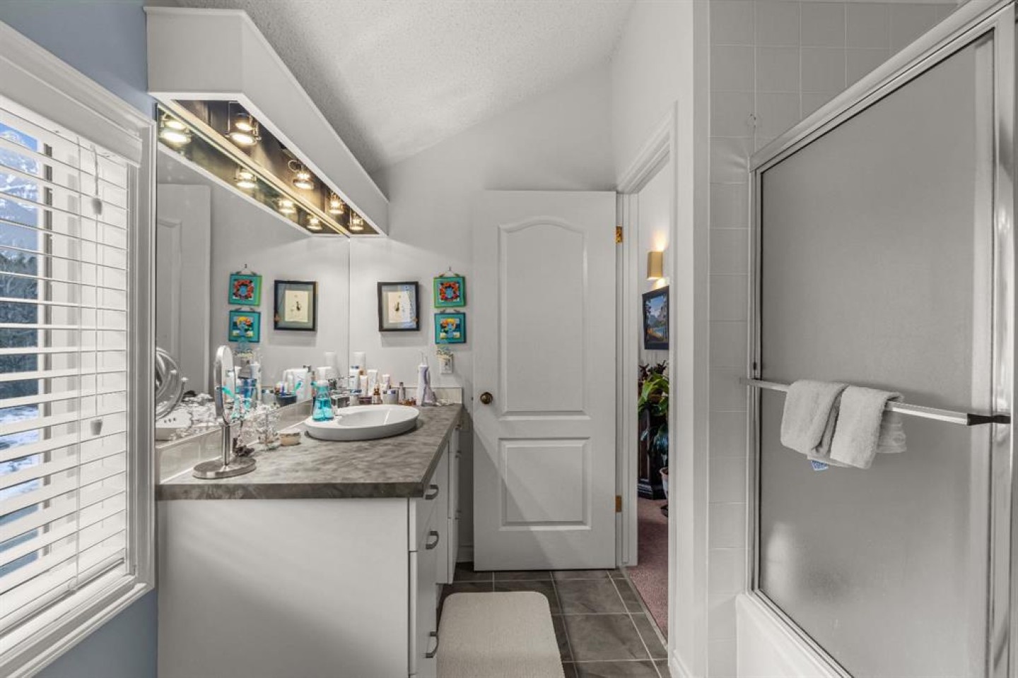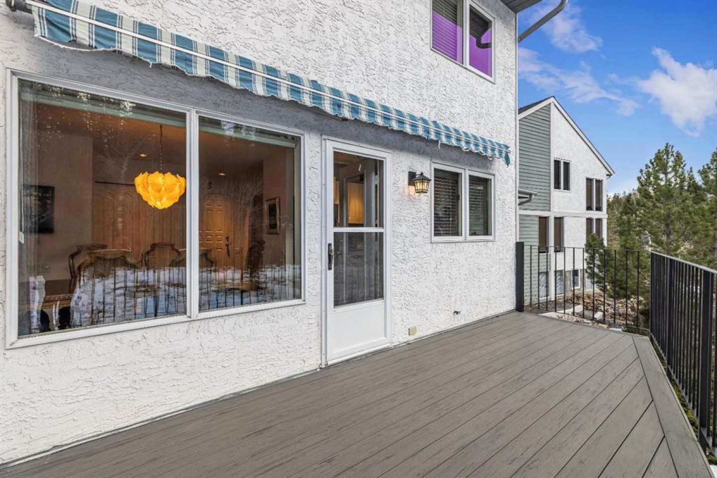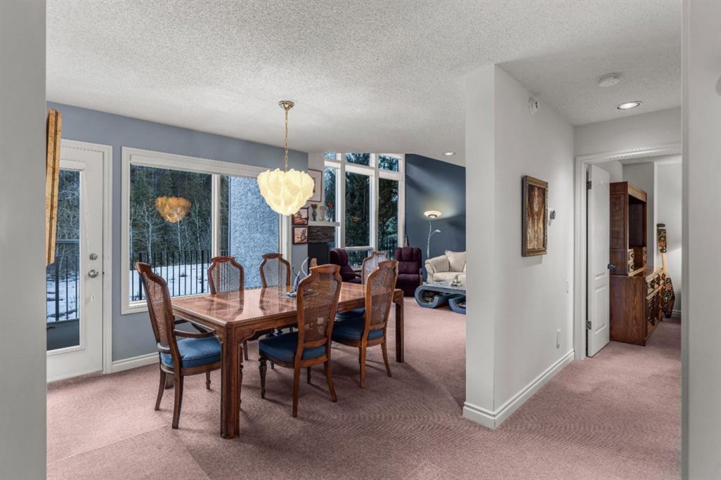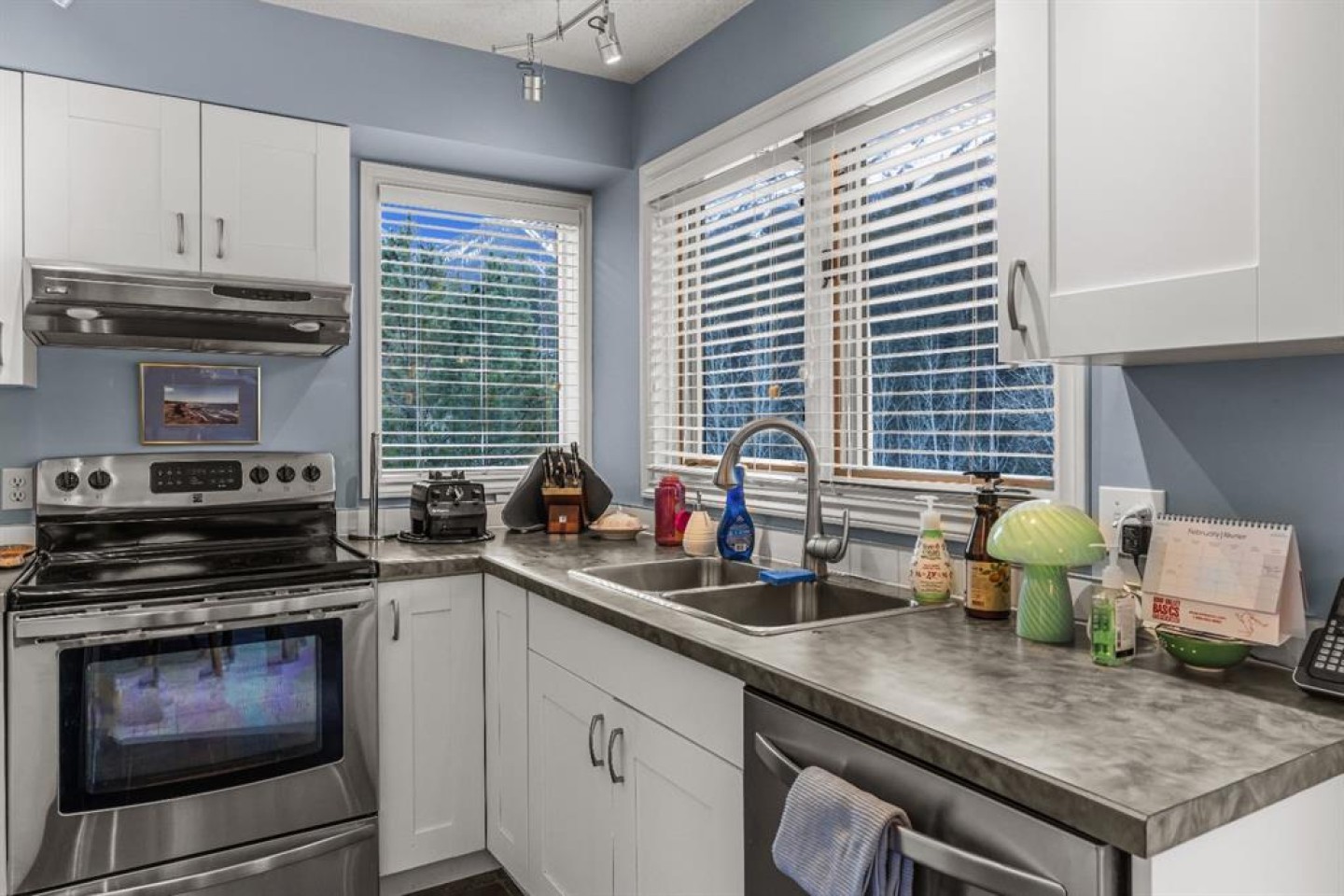Properties within this limited collection of residences are rarely available, a clear indication of the desirability and long-term ownership in this location. Offering over 2,200 sq ft of well-designed living space, this 3-bedroom, 3-bathroom home backs directly onto unique green space and showcases exceptional south-facing mountain views, combining privacy with a strong connection to its natural surroundings. The main floor is configured for convenient main-floor living, featuring a spacious primary bedroom, 3-piece bathroom, kitchen, dining area, and living room. Vaulted ceilings and expansive windows in the living room provide abundant natural light and frame the surrounding landscape. A slate entry foyer creates a strong first impression, while the adjacent deck extends the living space outdoors and offers a sunny setting to enjoy the views. The upper level includes two additional bedrooms and a 4-piece bathroom, offering flexibility for family or guests. The fully developed basement adds valuable additional space with a recreation room, 3-piece bathroom, laundry area, storage, and utility room. Additional highlights include a covered carport and a highly desirable setting backing onto open green space. This is a rare opportunity to secure a home in a tightly held, highly sought-after community.