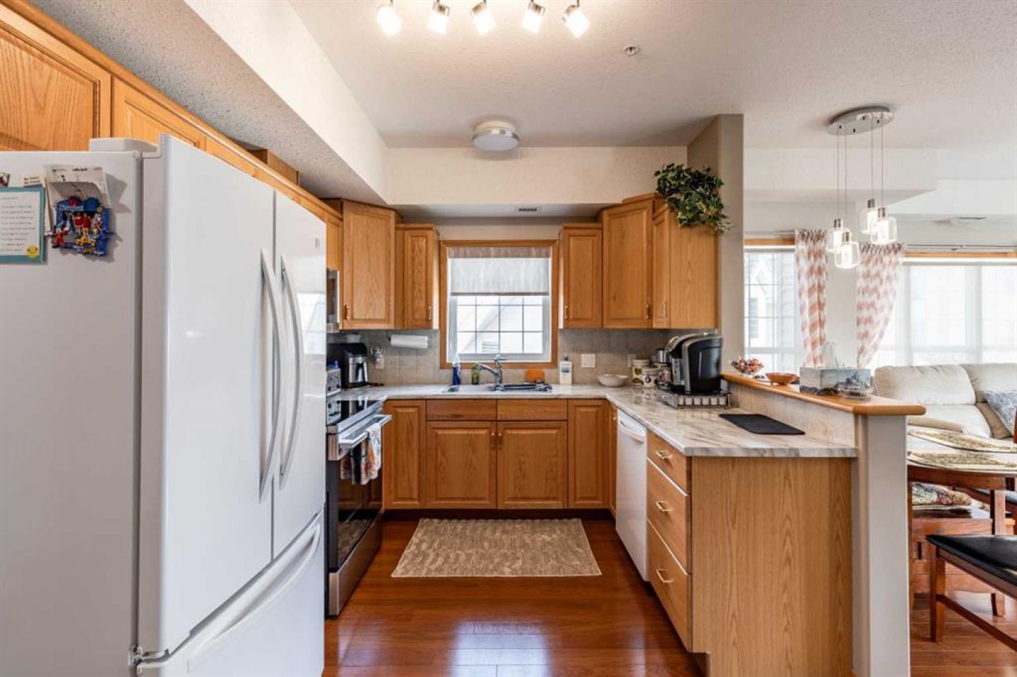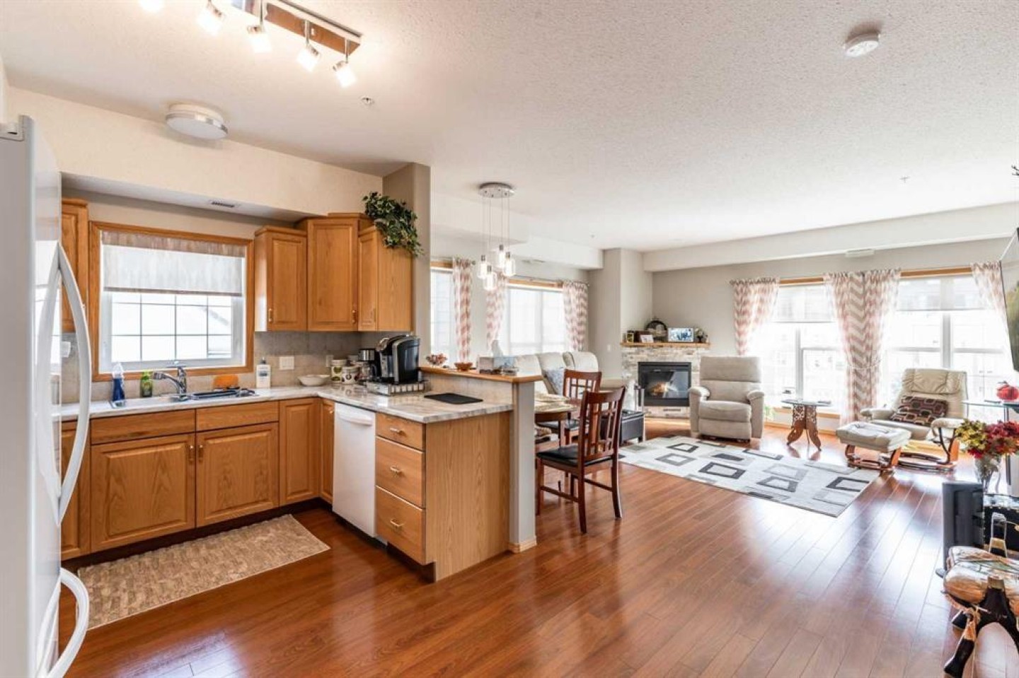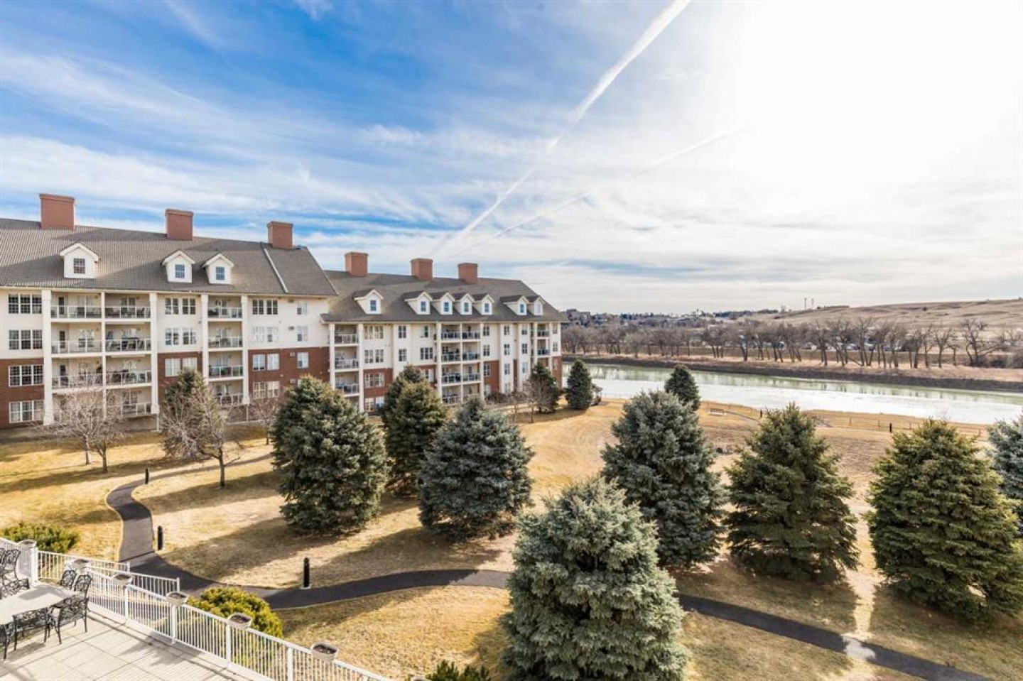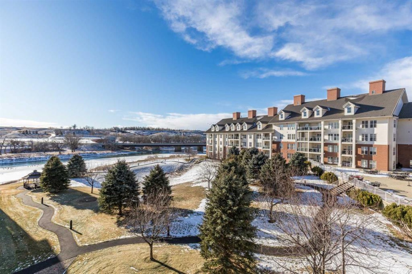 Welcome to sought-after River Ridge Estates, a beautifully maintained 55+ community offering comfort and convenience. This bright southeast-facing 2-bedroom, 1.5-bathroom suite enjoys lovely river views, allowing you to watch the sunrise while your private deck remains comfortably shaded from the afternoon sun. Inside, you’ll find fresh neutral paint, upgraded flooring, and a brand-new stove and microwave hood fan. The open living and dining area is filled with natural light, and the kitchen features a window over the sink for added brightness. The spacious primary suite easily accommodates a king-sized bed and includes a walk-in closet and private ensuite with a walk-in shower. The second bedroom is ideal as a guest room, office, or hobby space. A convenient two-piece bathroom doubles as your laundry area and offers additional storage. Other highlights include a titled underground parking stall located close to the parkade entrance, minimizing walking if mobility is a concern. Residents enjoy access to the beautifully landscaped courtyard, complete with a fire pit and charming seasonal Christmas lights, creating a warm and welcoming atmosphere year-round. This is low-maintenance living at its finest in one of the city’s most desirable condo communities.