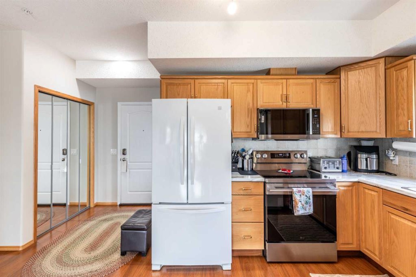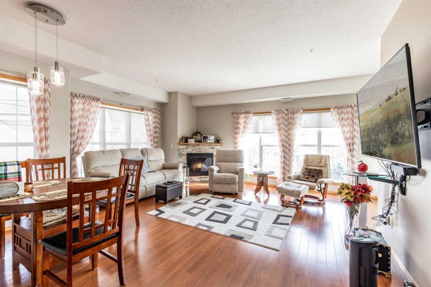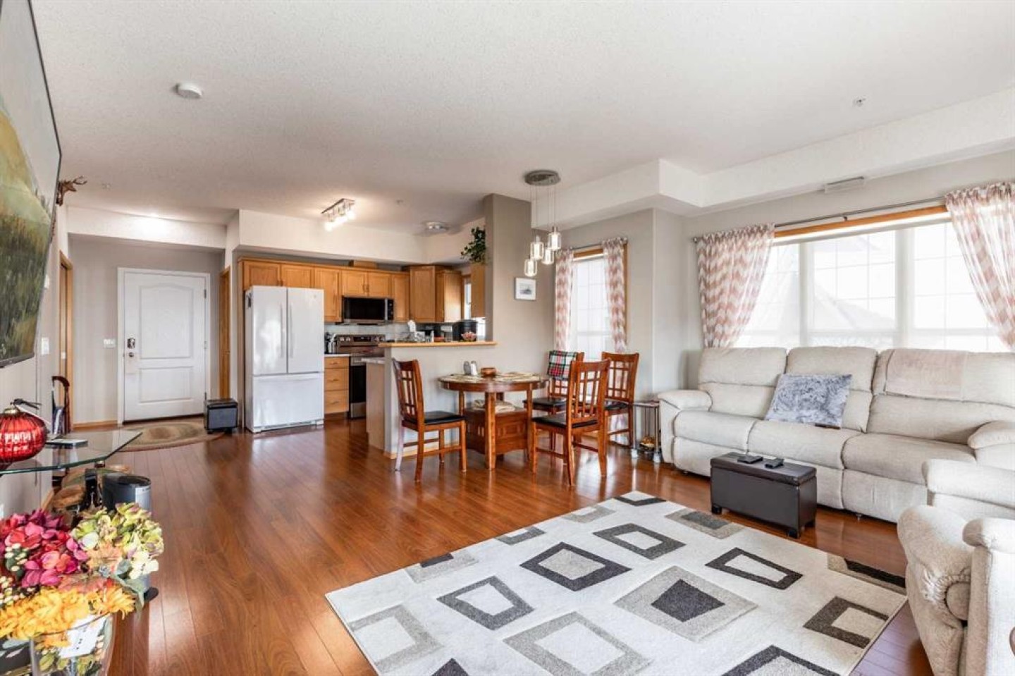 Welcome to sought-after River Ridge Estates, a beautifully maintained 55+ community offering comfort and convenience. This bright southeast-facing 2-bedroom, 1.5-bathroom suite enjoys lovely river views, allowing you to watch the sunrise while your private deck remains comfortably shaded from the afternoon sun. Inside, you’ll find fresh neutral paint, upgraded flooring, and a brand-new stove and microwave hood fan. The open living and dining area is filled with natural light, and the kitchen features a window over the sink for added brightness. The spacious primary suite easily accommodates a king-sized bed and includes a walk-in closet and private ensuite with a walk-in shower. The second bedroom is ideal as a guest room, office, or hobby space. A convenient two-piece bathroom doubles as your laundry area and offers additional storage. Other highlights include a titled underground parking stall located close to the parkade entrance, minimizing walking if mobility is a concern. Residents enjoy access to the beautifully landscaped courtyard, complete with a fire pit and charming seasonal Christmas lights, creating a warm and welcoming atmosphere year-round. This is low-maintenance living at its finest in one of the city’s most desirable condo communities.