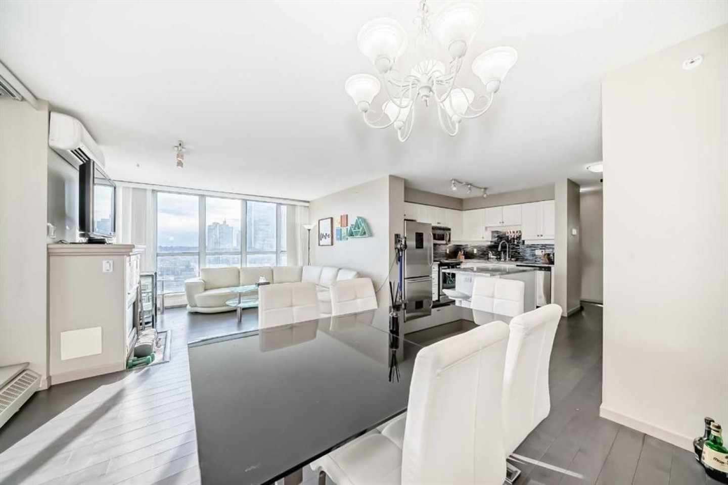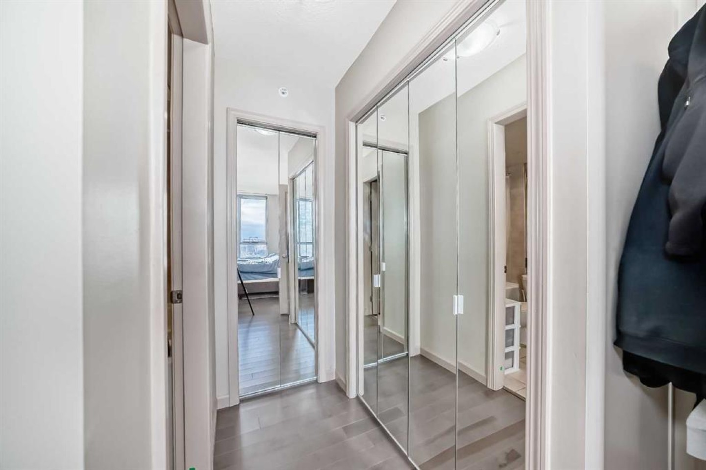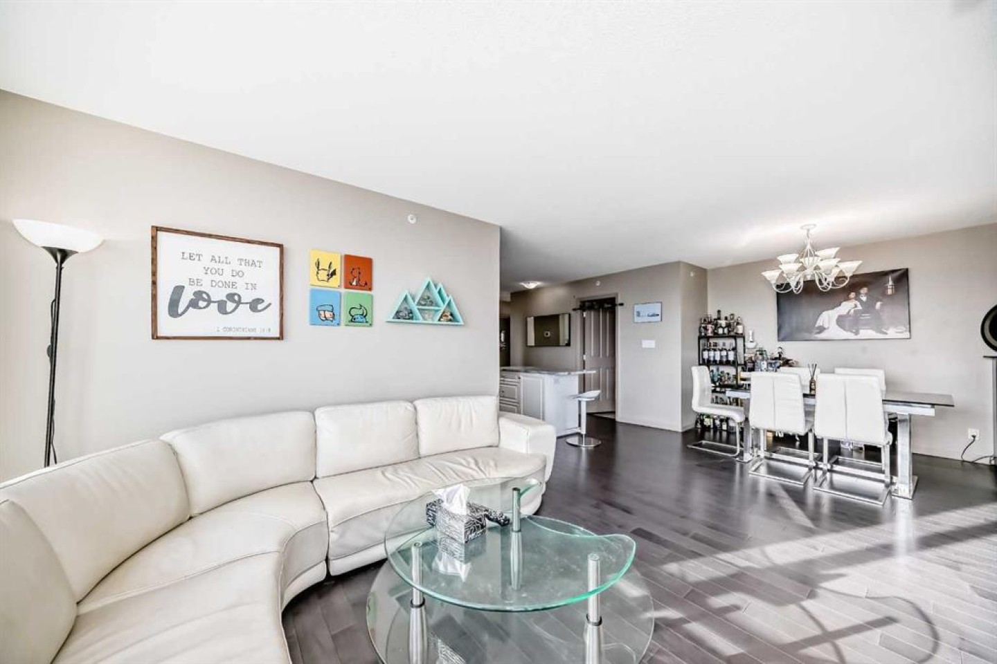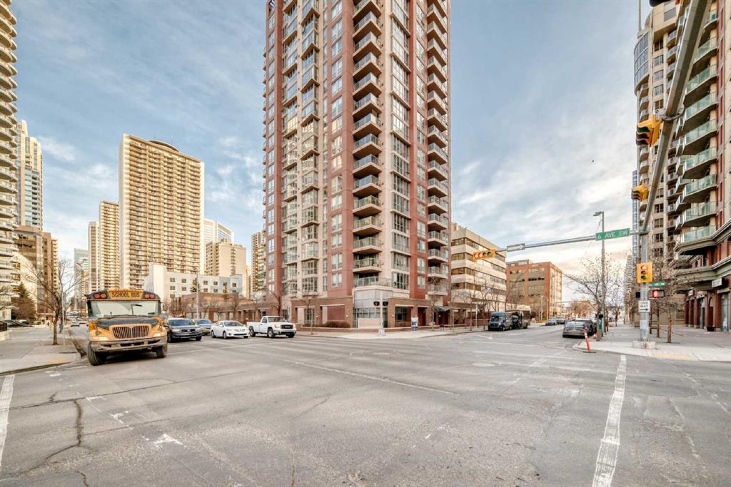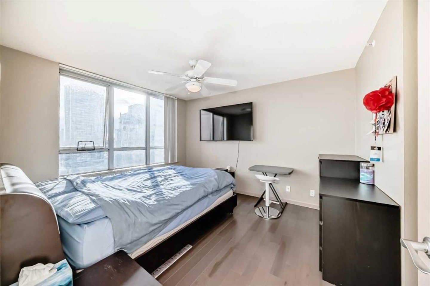 Discover elevated urban living in this beautifully appointed two-bedroom corner condo in the sought-after Axxis building, ideally located on the west side of downtown. Situated on the 18th floor, this bright and spacious unit is filled with natural light from oversized windows. The contemporary kitchen features stainless steel appliances and a functional island, perfect for everyday living and entertaining. Engineered hardwood flooring flows throughout the main living area, adding warmth and sophistication, while a wall-mounted A/C unit and cozy gas fireplace create a comfortable and inviting atmosphere. Step out onto the private balcony and enjoy the vibrant downtown setting. The thoughtfully designed layout includes two generously sized bedrooms, with the primary suite offering a full ensuite bathroom complete with a jetted tub. An open dining area provides ample space for hosting, and in-suite laundry adds everyday convenience. Residents enjoy excellent building amenities, including a fitness centre, a party room with a full kitchen for larger gatherings, a landscaped courtyard, bike storage, storage lockers, and gated visitor parking. Ideally located within walking distance to the C-Train station, restaurants, shopping, daycare, and the Bow River pathway system, this location truly can’t be beat. One heated, secure underground parking stall is included. Pet-friendly and exceptionally well located, this condo is an outstanding opportunity for downtown living.