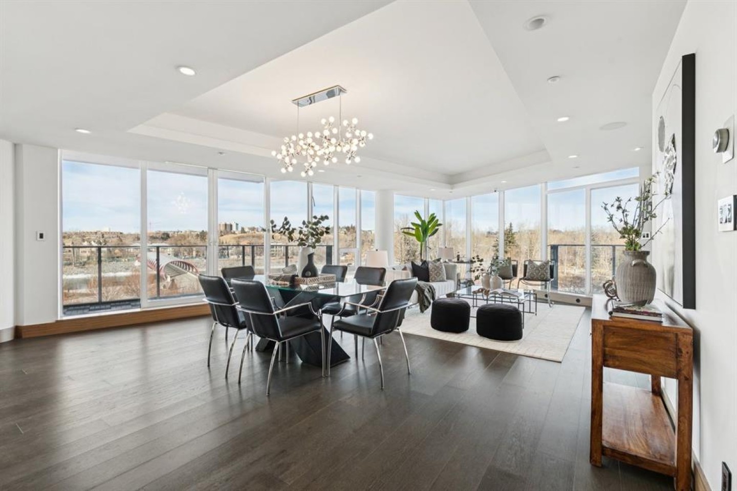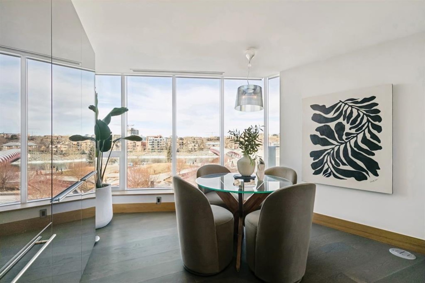 Amazing river views plus the epitome of luxury living in this exquisite original owner residence located in The Concord building, a prestigious address across from the iconic Peace Bridge in Eau Claire. A private elevator leads directly to your unit's foyer, ensuring exclusivity & privacy that is rare in urban living. Floor-to-ceiling windows facing the river flood the space with natural light, w/unobstructed NW & E views. Step inside through elegant double glass doors & be captivated by the open floor plan, which spans nearly 2,000 sq. ft. This stunning unit showcases features such as Control 4 automation, hardwood flooring, LED lighting, built-in speakers, marble finishes, and heated bathroom floors for added comfort. At the heart of this luxurious residence lies the Poggenpohl kitchen, equipped with white stone countertops, a spacious island that seats four, and top-of-the-line Miele appliances, including a gas cooktop, built-in refrigerator, and wine fridge—ideal for both cooking & entertaining. The formal dining room, adorned with a stunning chandelier, seamlessly flows into the expansive living room, which includes access to two private balconies—perfect for morning coffee or evening cocktails—while a cozy gas fireplace adds warmth. Journey down the hall to find the large primary bedroom, offering direct access to one of the balconies through generous patio glass doors. The opulent 5-piece ensuite features his/her sinks, a tall glass and marble shower, heated floors, & a luxurious jacuzzi soaker tub. The spacious walk-in closet ensures effortless organization. Bedroom two features glass patio doors leading to the same balcony, a large closet with built-ins, & a stylish 4-piece ensuite bathroom with a tub/shower combo & heated flooring. Indulge in exceptional craftsmanship & meticulous attention to detail throughout this remarkable residence. Custom built-ins, walnut wood accents, and a separate laundry closet reflect a commitment to quality and style. This residence includes Level 2 charging in the oversized private garage w/ one of the largest storage units, ensuring ample space for all your belongings. With a dedicated 24-hour concierge, every need is met with grace, allowing you to indulge in true luxury. The heated garage offers guest parking & a car wash facility, complete with a separate undercarriage wash, ensuring your vehicles stay pristine. The building's amenities enhance your living experience, featuring a state-of-the-art fitness center, an elegant party room, & a beautiful patio area with BBQ space overlooking a serene pond. In winter, this charming pond transforms into a picturesque skating rink, perfect for seasonal recreation. Experience the ultimate in luxurious living—call today to schedule a showing & take the first step toward making this extraordinary condo your new home. Embrace a lifestyle defined by elegance and Luxury.